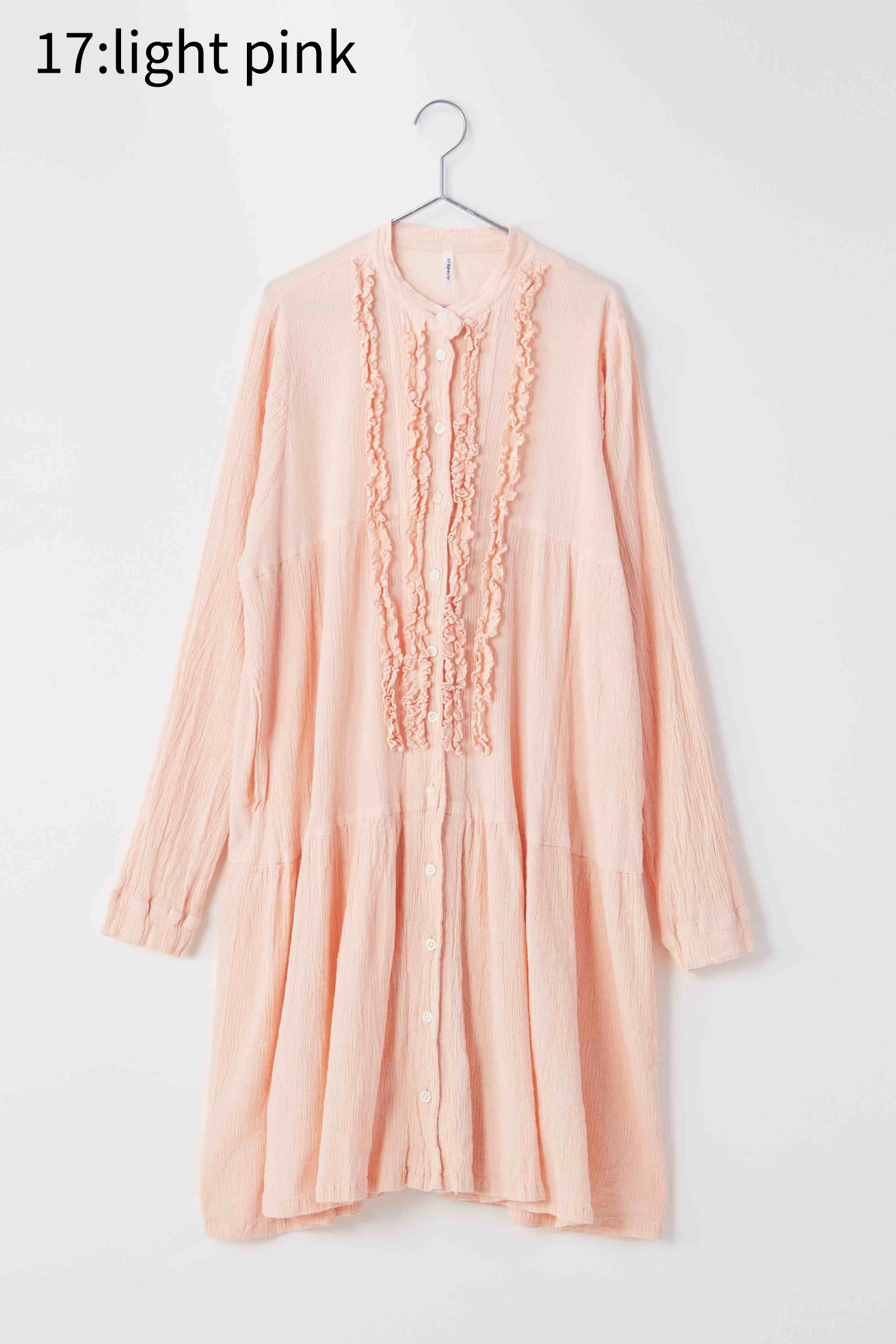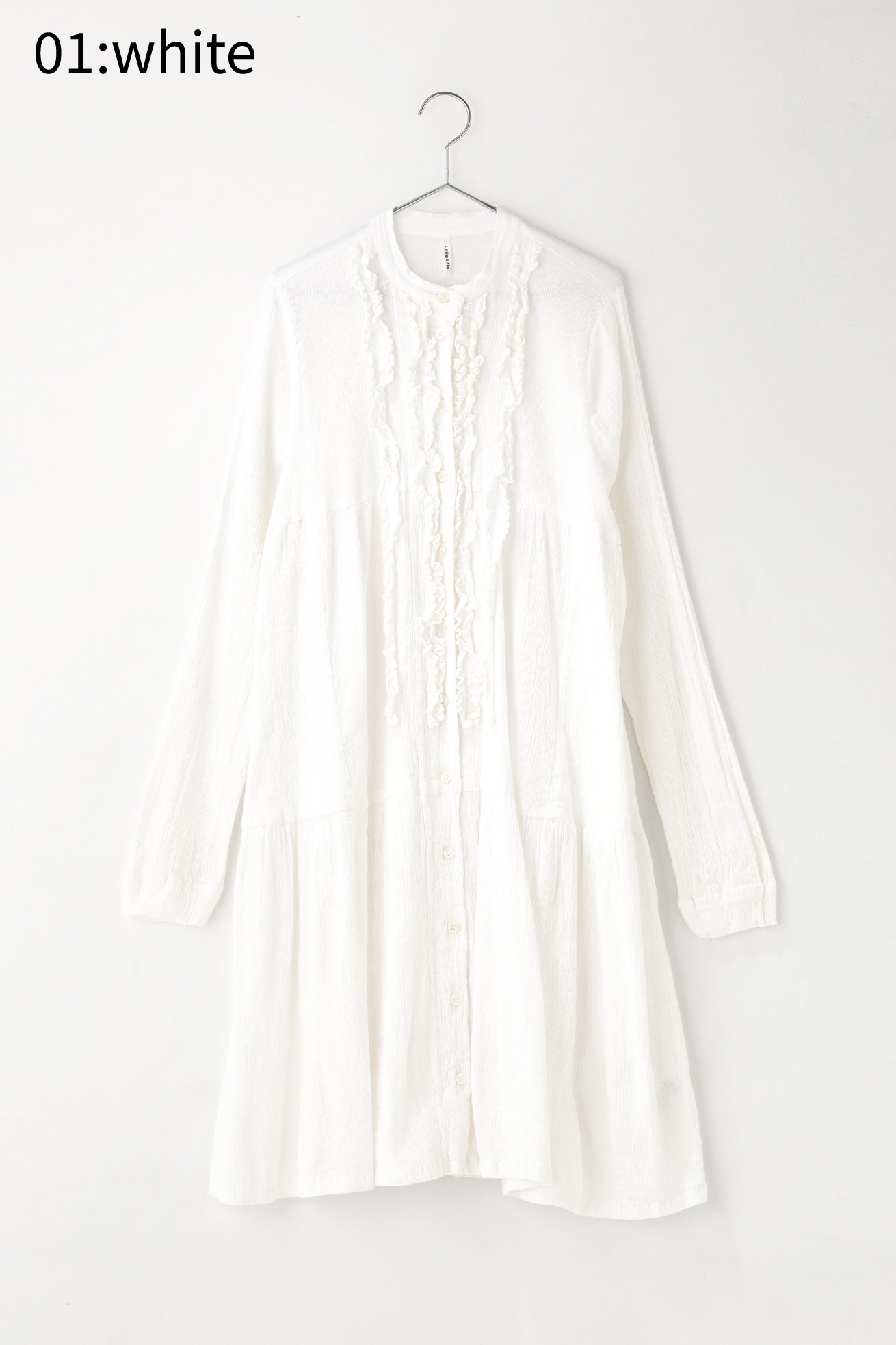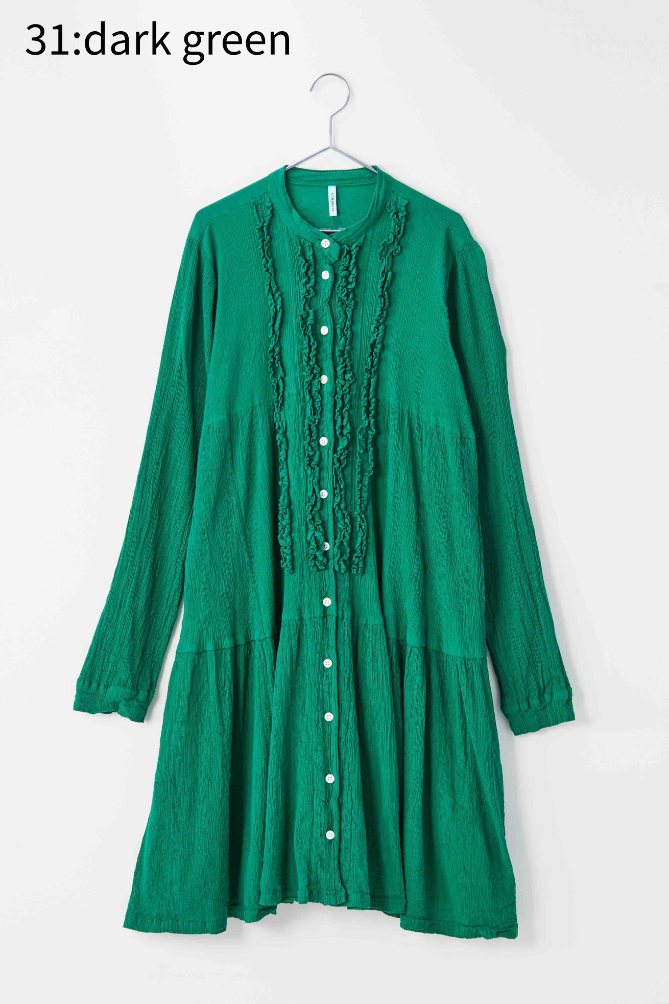 フロントのフリルが特徴的なAラインワンピースです。 二段に切り替えたAラインのシルエットが広がりすぎず、ゆったりとしてい着やすいデザインです。 前開きのデザインなので羽織としても活躍するアイテムです。 クレプリ独特の生地のシボ感とフリルがアクセントとなり、1枚でもパンツと合わせてもコーディネートをお楽しみいただけます。 生地の織りは、古くからちりめんで有名な滋賀県高島地区、染めと仕上げは岐阜県大垣市にて行っています。 crêperie(クレプリ)とは・・・ 1994年に発表した、コットン素材のシボ感が特徴的なアイテムです。 国内の工場、職人さんの高い技術によって作られる生地は、伸縮性が非常に高く、程よいフィット感で一度着るとクセになる着心地です。 染色後に自然乾燥をし、時間をかけて丁寧に作られます。 ネットに入れて洗濯機で洗えるイージーケアも特徴です。 シワを気にせずコンパクトにたためるので、ご旅行や室内での温度調整など、持ち運びに便利なアイテムです。 ※サイズについて 商品により個体差がございます。予めご了承ください。