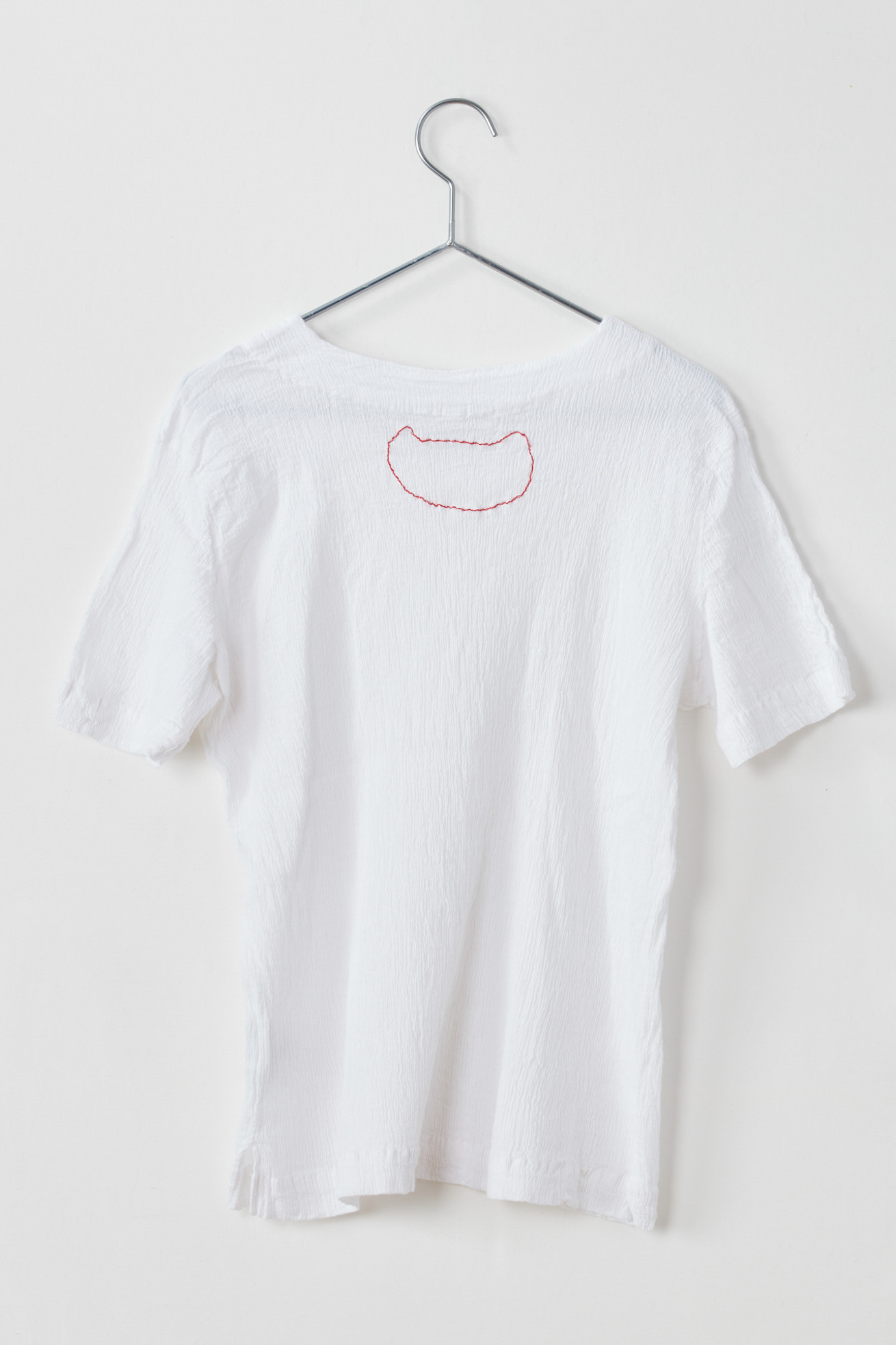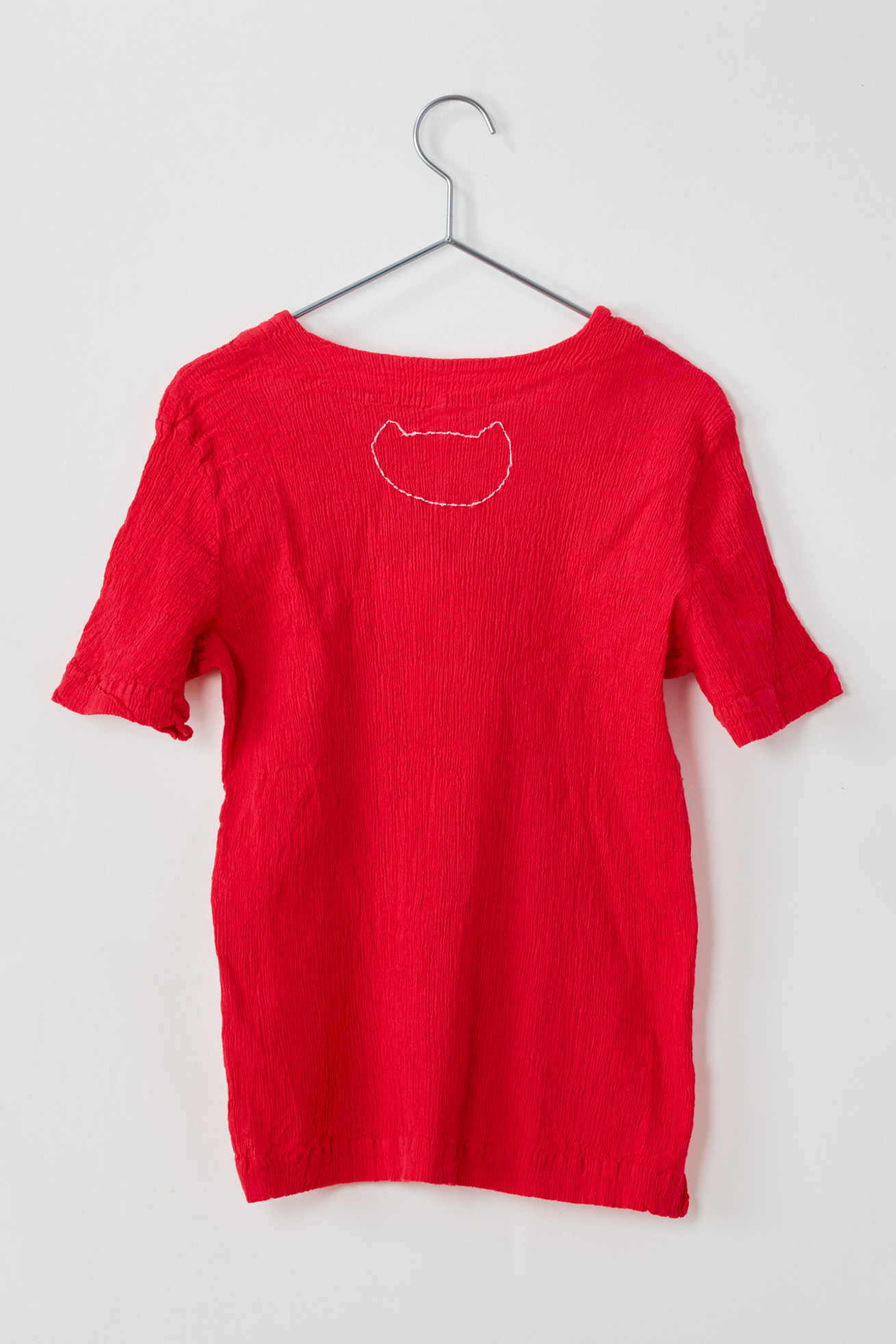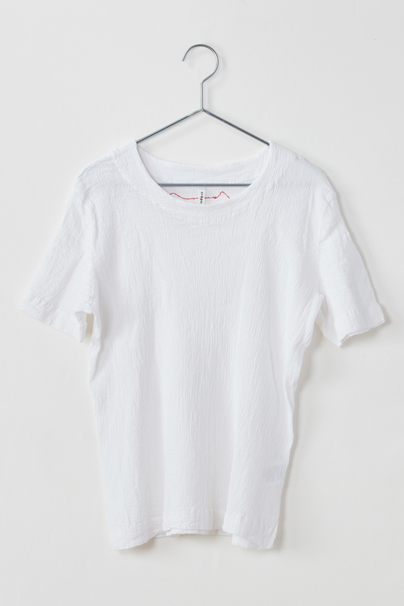 コンパクトなサイズ感の半袖Tシャツです。 後ろにはネコ型の刺繍が入っていてアクセントに。 ベーシックなデザインで1枚でも、インナーとしても便利なアイテムです。 生地の織りは、古くからちりめんで有名な滋賀県高島地区、染めと仕上げは岐阜県大垣市にて行っています。 crêperie(クレプリ)とは・・・ 1994年に発表した、コットン素材のシボ感が特徴的なアイテムです。 国内の工場、職人さんの高い技術によって作られる生地は、伸縮性が非常に高く、程よいフィット感で一度着るとクセになる着心地です。 染色後に自然乾燥をし、時間をかけて丁寧に作られます。 ネットに入れて洗濯機で洗えるイージーケアも特徴です。 シワを気にせずコンパクトにたためるので、ご旅行や電車内での冷房対策など、持ち運びに便利なアイテムです。 ※サイズについて 商品により個体差がございます。予めご了承ください。