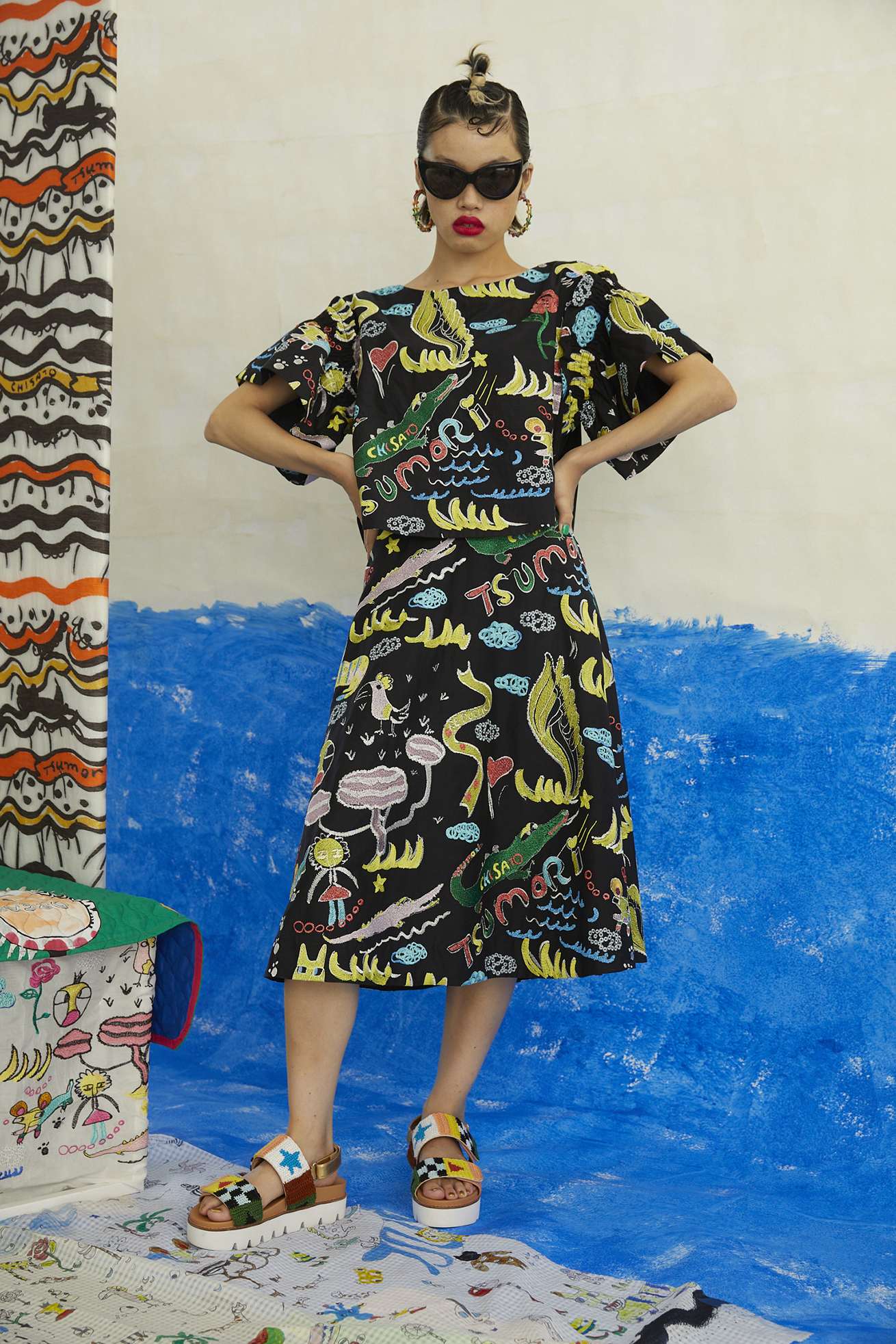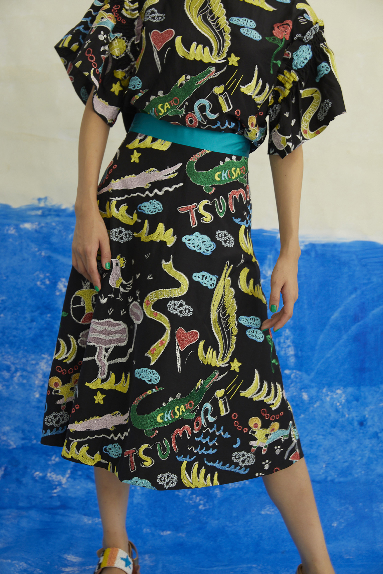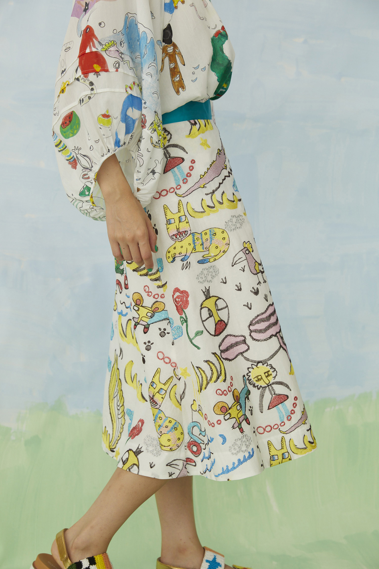 ベルト部分にターコイズカラーのシルクサテンをあしらったフレアスカート。 ワニやライオン、サバンナの木、雲、ひらひらリボン。 グラフィティアートのように描いたモチーフを軽く柔らかなシルクコットンローンに光沢感のある糸で刺繍しました。 中国で刺繍加工しています。 ※着用モデル身長:165cm ※当サイトの商品は実店舗と在庫を共有しており、ご注文完了後に商品を確保できない場合がございます。 その際、改めてキャンセルまたは数量変更のメールをお送りいたします。何卒ご了承いただけますと幸いです。