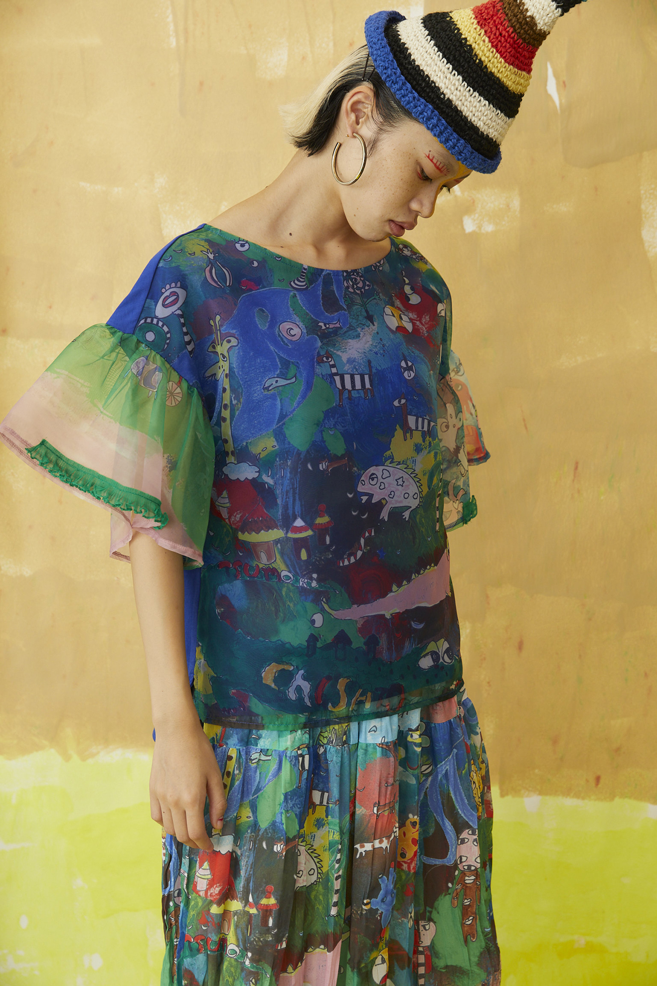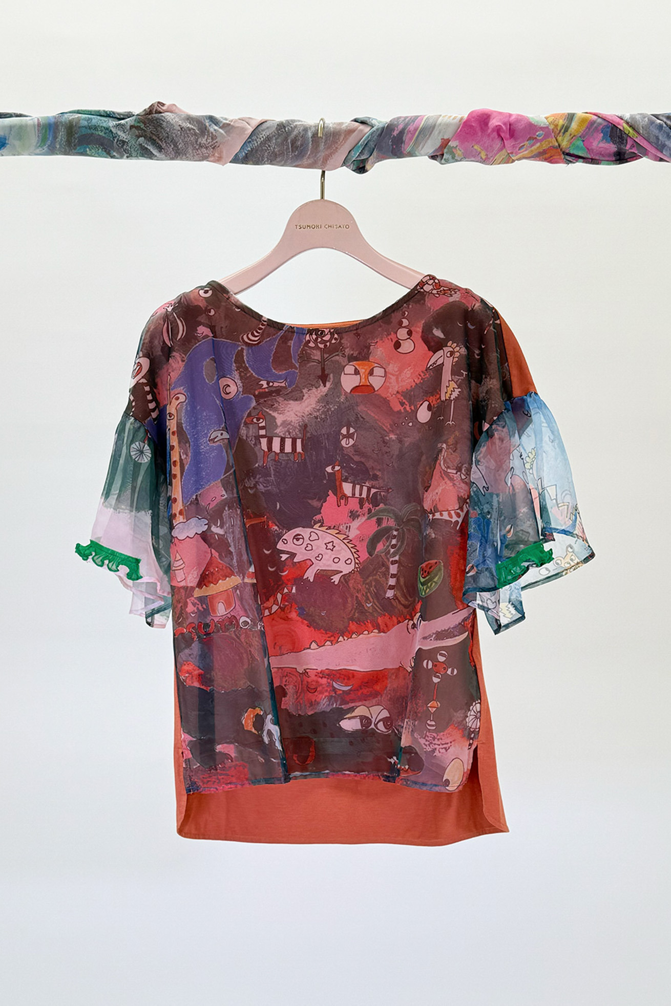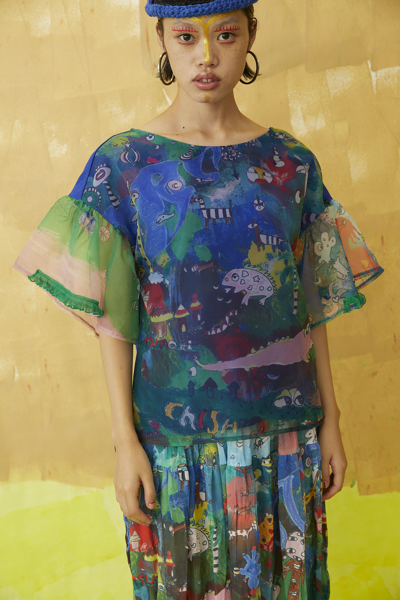 カラフルでラフなペイントタッチにカモフラージュのように見え隠れするワニやキリン、トラやライオン、TSUMORIの文字の川。遊び心あふれる不思議な生き物たちが暮らすTSUMORI CHISATOワールドのサバンナ。 柔らかさと適度に立体感の出るハリ感に、マットな質感が加わった上質なオーガンジーの生地を使用し後ろ身頃にカットソーを合わせたアイテムです。 ギャザー袖と袖口についたフリルがポイントです。 ※着用モデル身長:165cm ※当サイトの商品は実店舗と在庫を共有しており、ご注文完了後に商品を確保できない場合がございます。 その際、改めてキャンセルまたは数量変更のメールをお送りいたします。何卒ご了承いただけますと幸いです。
