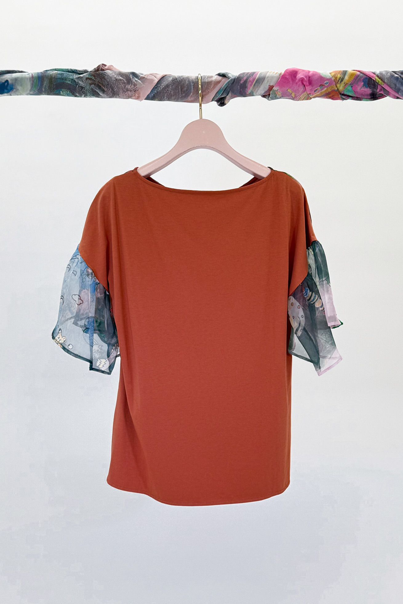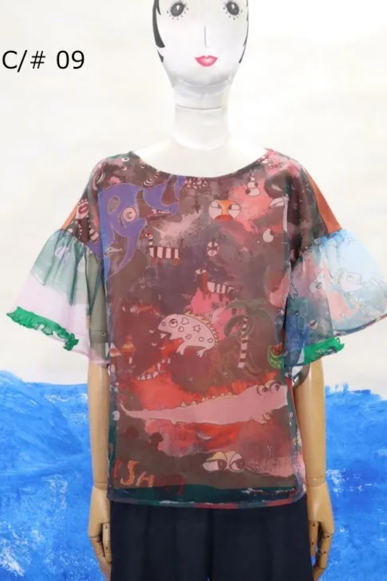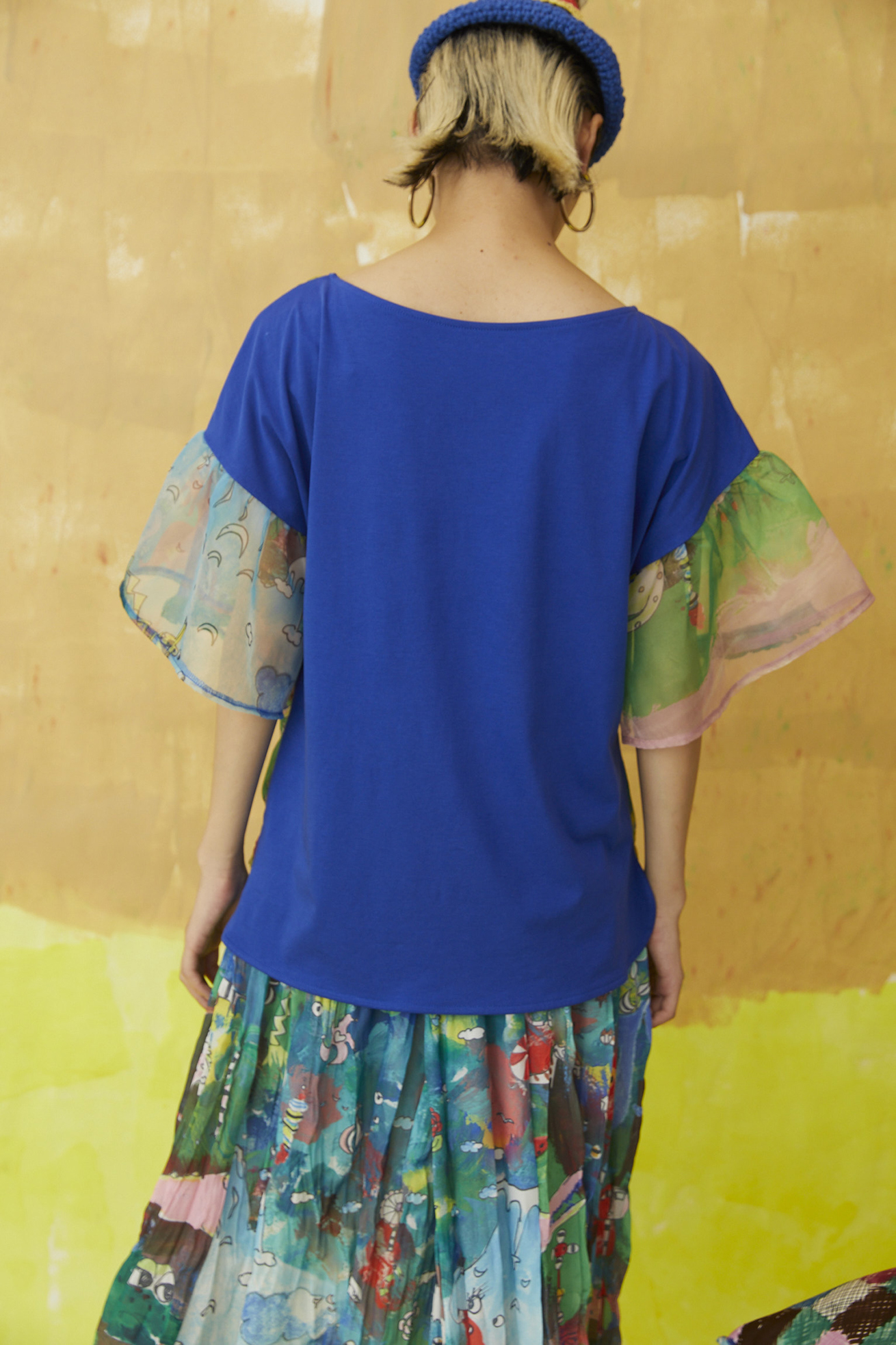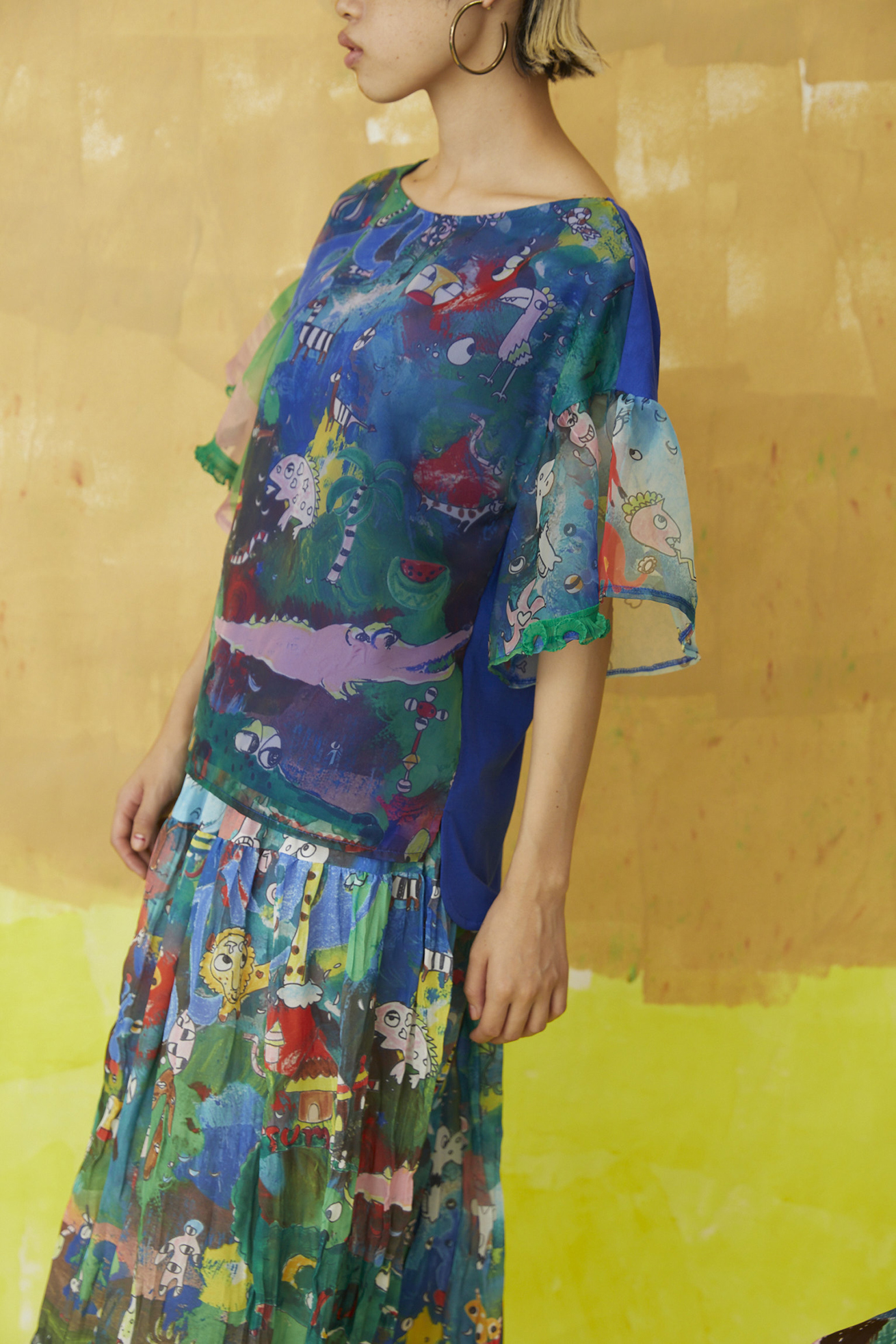 カラフルでラフなペイントタッチにカモフラージュのように見え隠れするワニやキリン、トラやライオン、TSUMORIの文字の川。遊び心あふれる不思議な生き物たちが暮らすTSUMORI CHISATOワールドのサバンナ。 柔らかさと適度に立体感の出るハリ感に、マットな質感が加わった上質なオーガンジーの生地を使用し後ろ身頃にカットソーを合わせたアイテムです。 ギャザー袖と袖口についたフリルがポイントです。 ※着用モデル身長:165cm ※当サイトの商品は実店舗と在庫を共有しており、ご注文完了後に商品を確保できない場合がございます。 その際、改めてキャンセルまたは数量変更のメールをお送りいたします。何卒ご了承いただけますと幸いです。