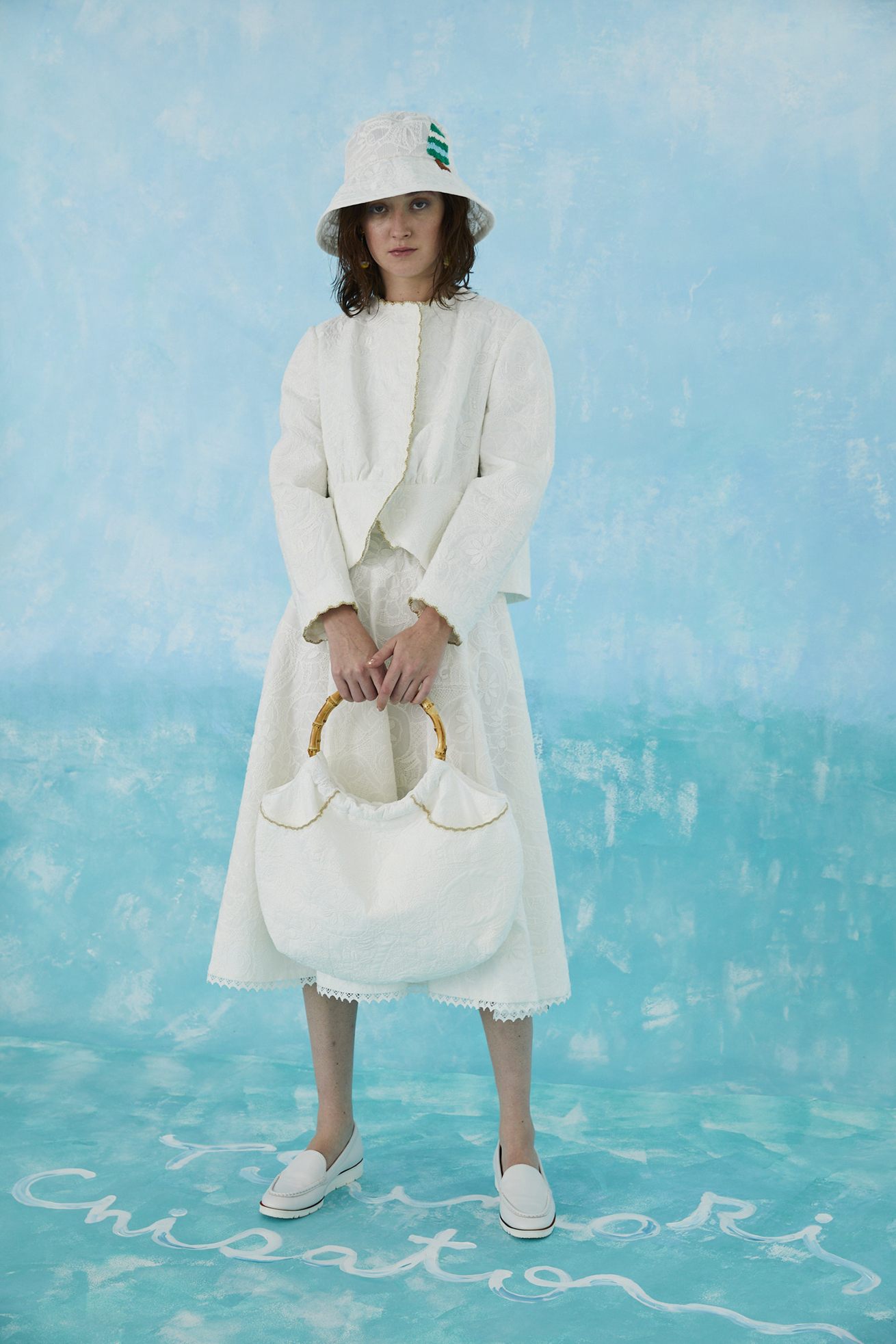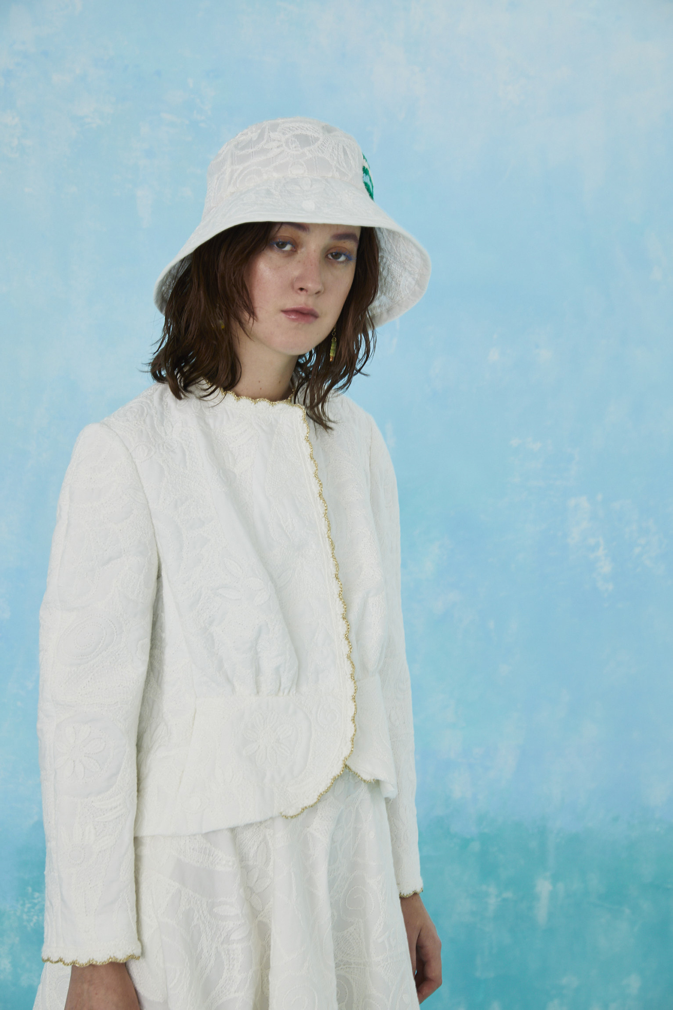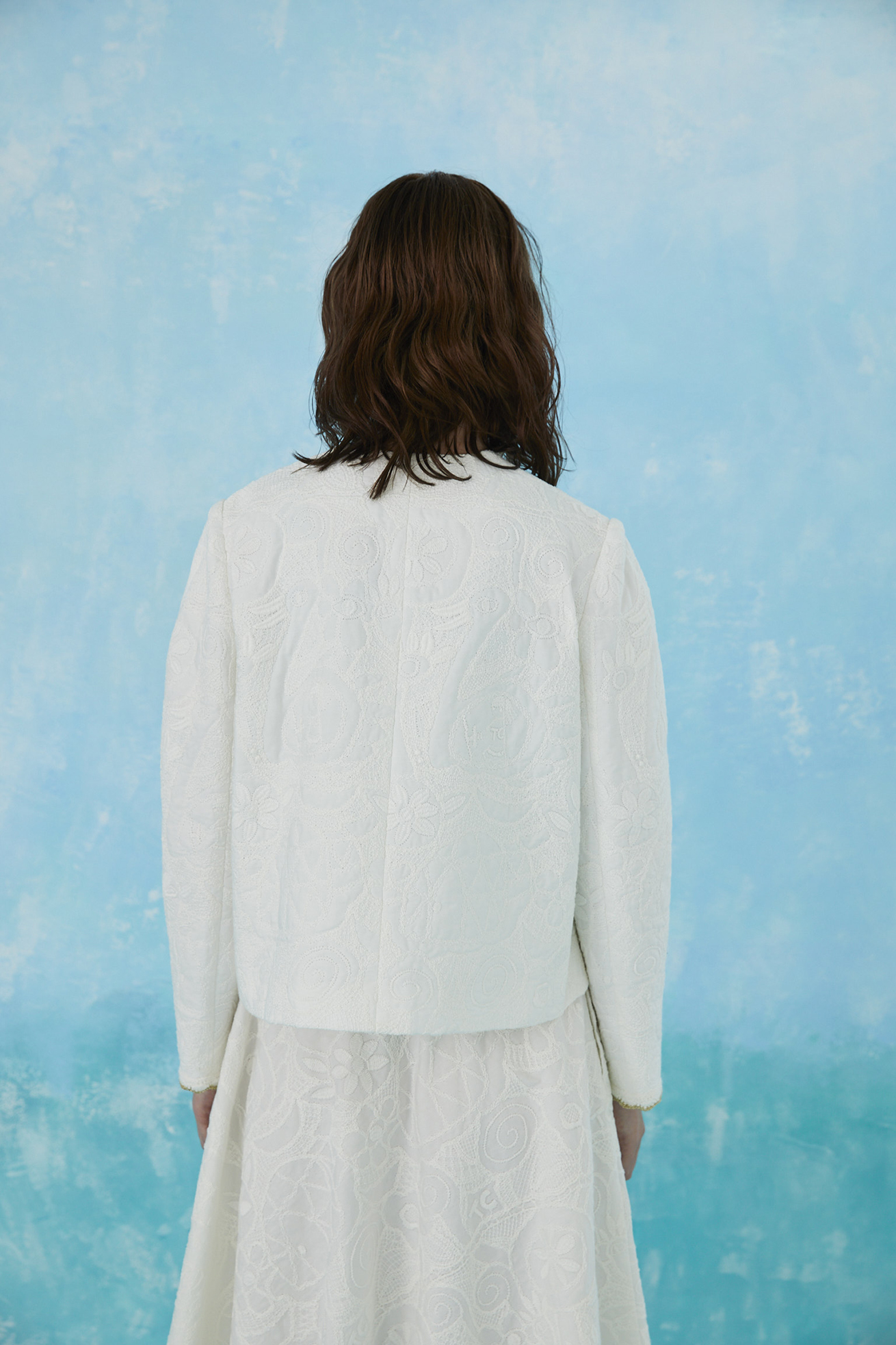 襟元、前端にゴールドのかぎ針編みレースをほどこした、ウエストシェイプのショート丈ジャケットです。 鳥たちの住む森と、湖に浮かぶスワンボートの風景を、太番手のコットン糸を使用し、刺繍で表現しました。 刺繍糸は、3本の糸を撚り合わせて光沢感を出しています。 コットンブロードに薄手の綿を挟んでキルト状に刺繍しました。 キルティングによる凹凸感が柄をより引き立たせ、高級感のある素材に仕上げています。 刺繍糸が太い為、機械のスピードを落とし、時間をかけて製作した手の込んだ素材です。 福井県敦賀市で生産しています。 ※着用モデル身長:175cm ※着用サイズ: 2(M) ※当サイトの商品は実店舗と在庫を共有しており、ご注文完了後に商品を確保できない場合がございます。 その際、改めてキャンセルまたは数量変更のメールをお送りいたします。何卒ご了承いただけますと幸いです。