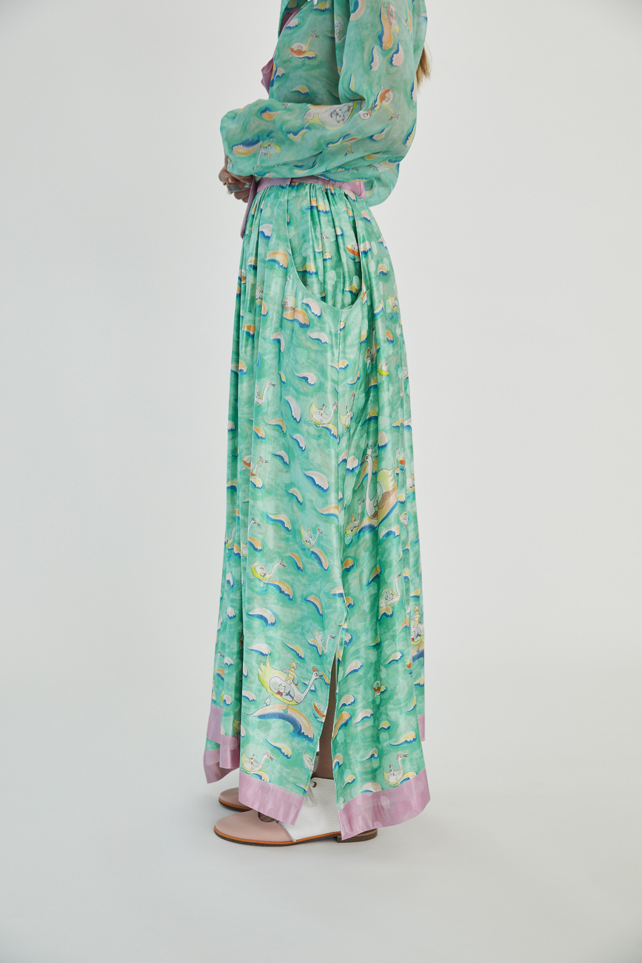 たっぷりとしたボリュームとサイドスリット、裾のカラーのラインがポイントのロングスカートです。 グラフィカルな波間をスイスイ進むシルクハットや王冠を被った表情豊かなスワンボート。 乗り込んだ沢山のねこたちの姿が楽しいプリントです。 手描きのタッチをそのまま活かし、シルクリネンの光沢感のあるドットジャカードに中国でインクジェットプリントしています。 独特の落ち感としなやかさが高級感あふれる素材です。 ※着用モデル身長:172cm ※着用サイズ: 2(M) ※当サイトの商品は実店舗と在庫を共有しており、ご注文完了後に商品を確保できない場合がございます。 その際、改めてキャンセルまたは数量変更のメールをお送りいたします。何卒ご了承いただけますと幸いです。