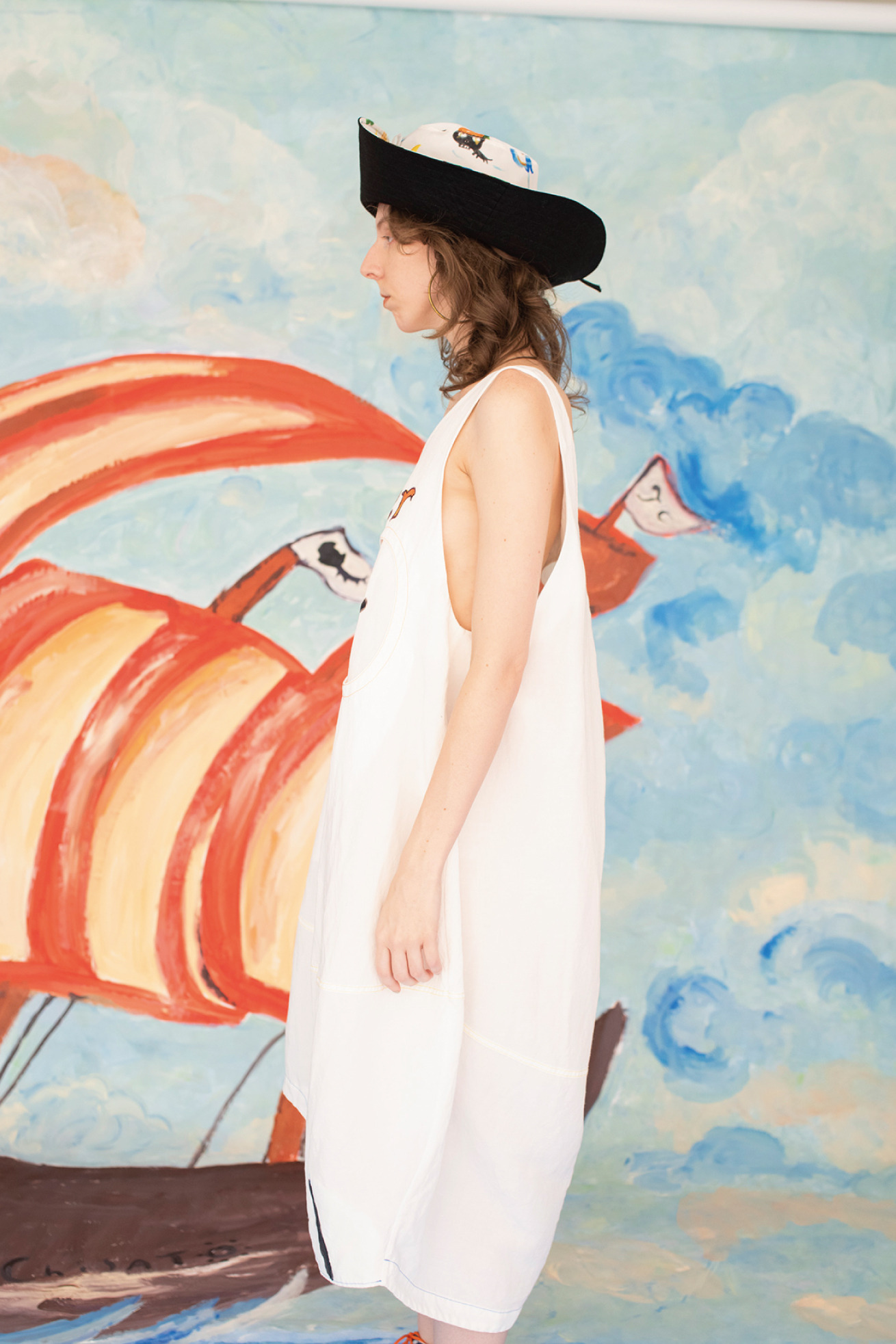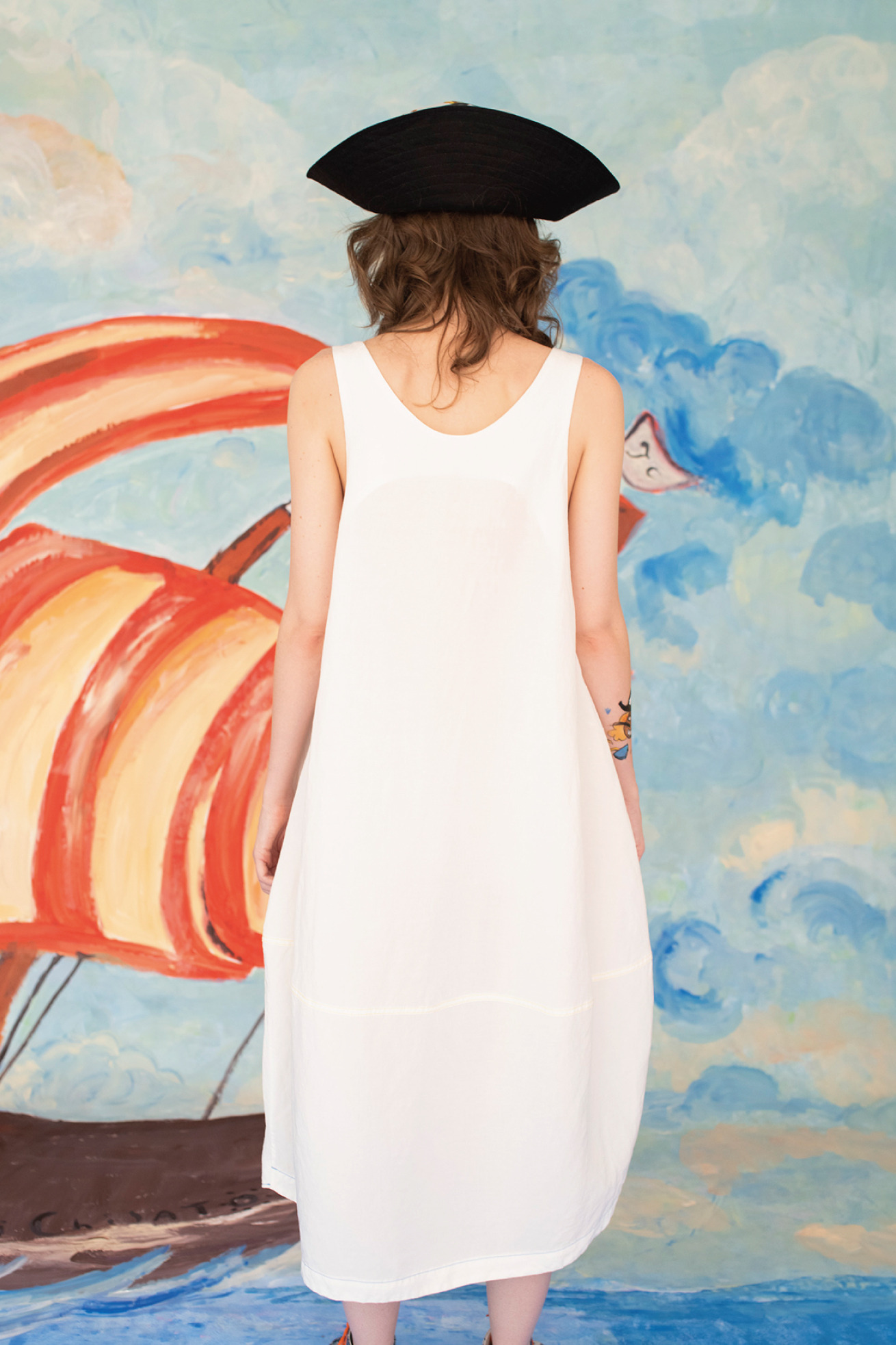 大きなねこドクロのようなノースリーブワンピース。 胸元に”Forever”の文字、ねこドクロの閉じた眼、ドクロの歯をプリントしました。 ステッチのカラーがアクセントになっています。 生地は滋賀県で織った、経糸にレーヨン / 緯糸にリネン糸を使用した交織。 緯糸のリネンの風合いを出しながら、レーヨンのドレープ感も併せ持ったナチュラル感が特徴的な素材です。タンブラー加工をすることでラフな表面感を出しています。 縫製後、岡山県児島で製品染めをし、表面の毛羽を落とすバイオ加工をした後にインクジェットプリントしています。 こちらの商品は、ご家庭で手洗い可能です。 ※着用モデル身長:177cm ※着用サイズ: 2(M) ※当サイトの商品は実店舗と在庫を共有しており、ご注文完了後に商品を確保できない場合がございます。 その際、改めてキャンセルまたは数量変更のメールをお送りいたします。何卒ご了承いただけますと幸いです。