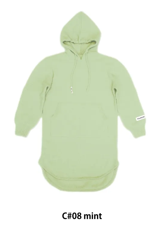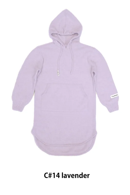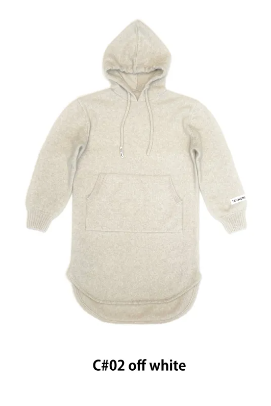 大きめのフードと深いスリット、前後差のある着丈がバランスのとりやすいニットワンピースです。