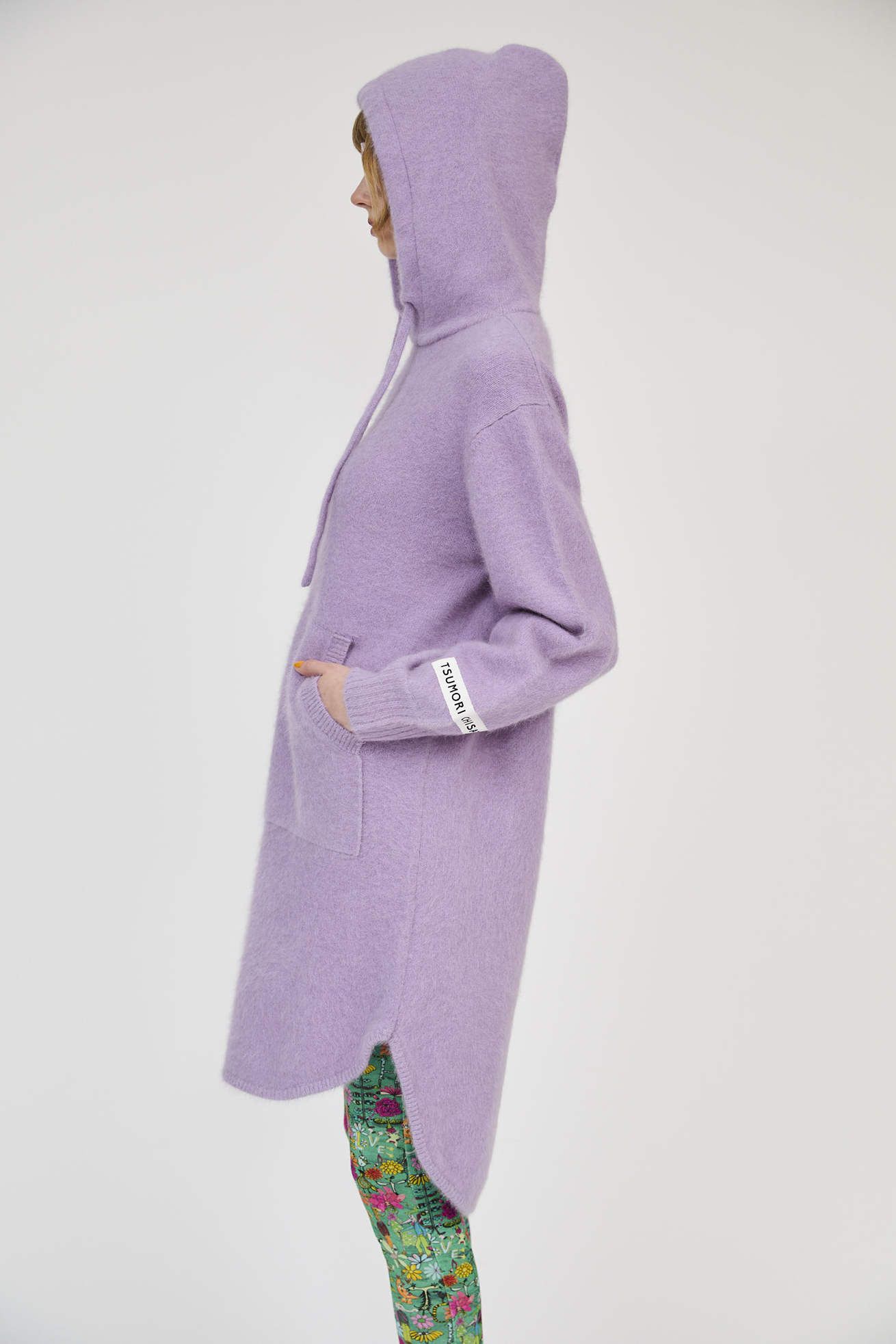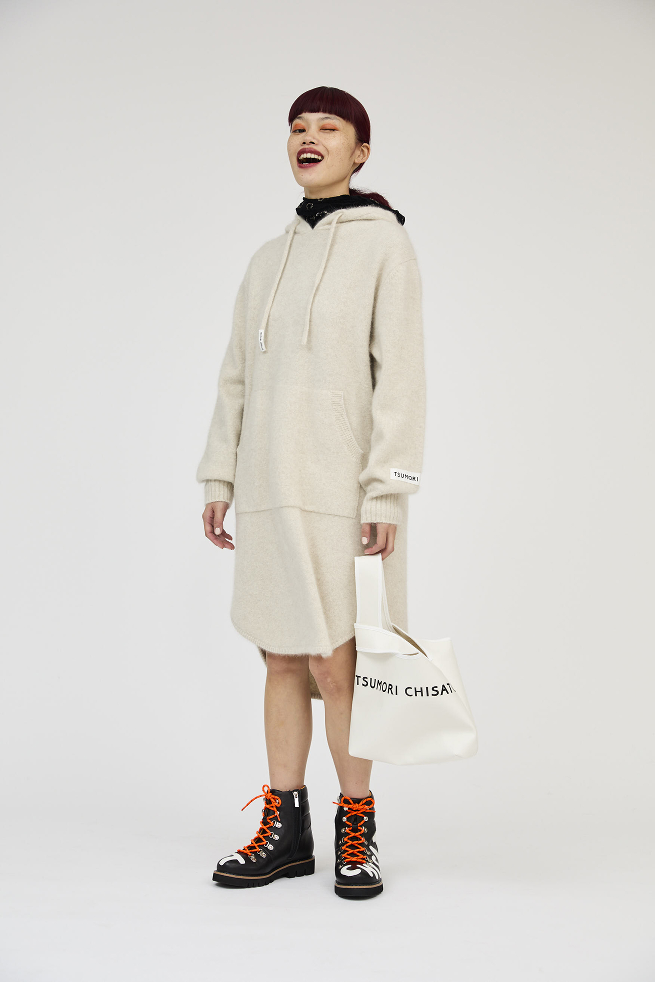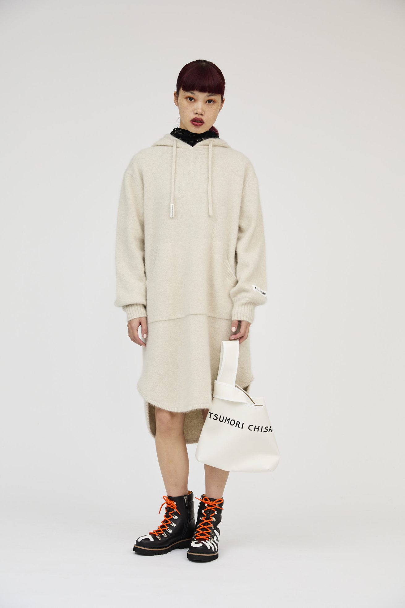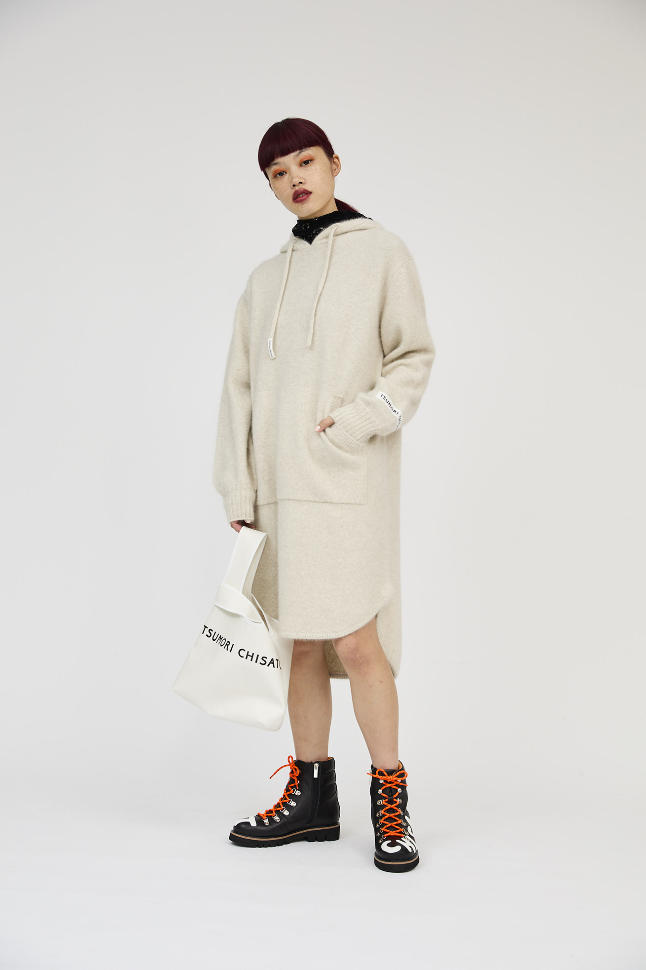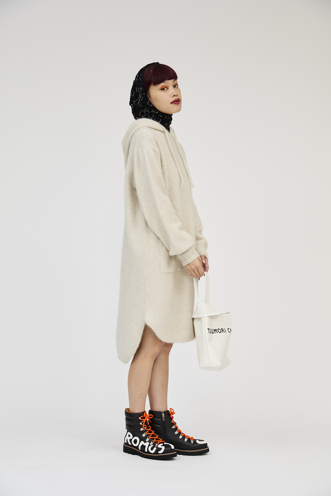 大きめのフードと深いスリット、前後差のある着丈がバランスのとりやすいニットワンピースです。 1枚でも、パンツやタイツと合わせても可愛いアイテムです。 袖のロゴテープとフロントの大きなポケットがアクセントに。 毛が柔らかく、へアリー感がありながら直接肌に触れても気持ちがよく、保温力の高さが特徴のブルーフォックスを使用しています。 オフホワイトはナチュラルなカラー、ミント、ラベンダーは製品染めをしています。 ※着用モデル身長 オフホワイト:160cm ラベンダー:172cm ※着用サイズ: 2(M) ※当サイトの商品は実店舗と在庫を共有しており、ご注文完了後に商品を確保できない場合がございます。 その際、改めてキャンセルまたは数量変更のメールをお送りいたします。何卒ご了承いただけますと幸いです。