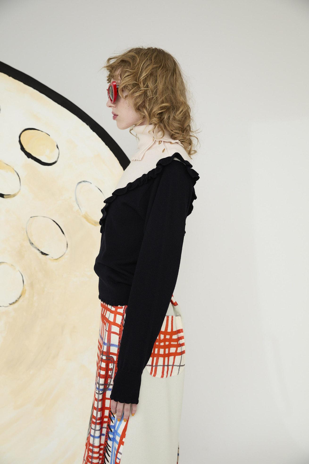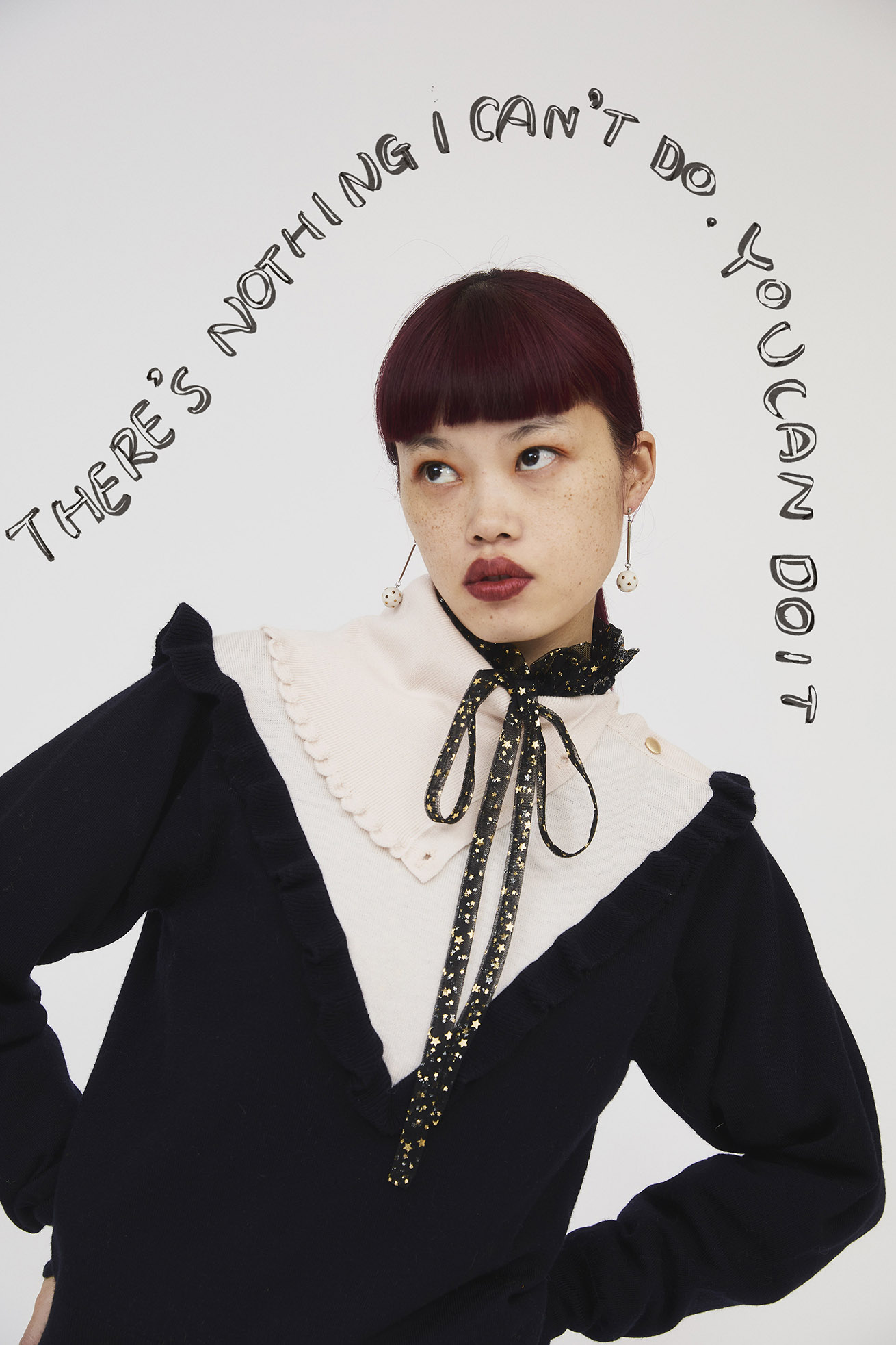 高さのあるタートルネックはボタンを開けてアレンジをお楽しみください。