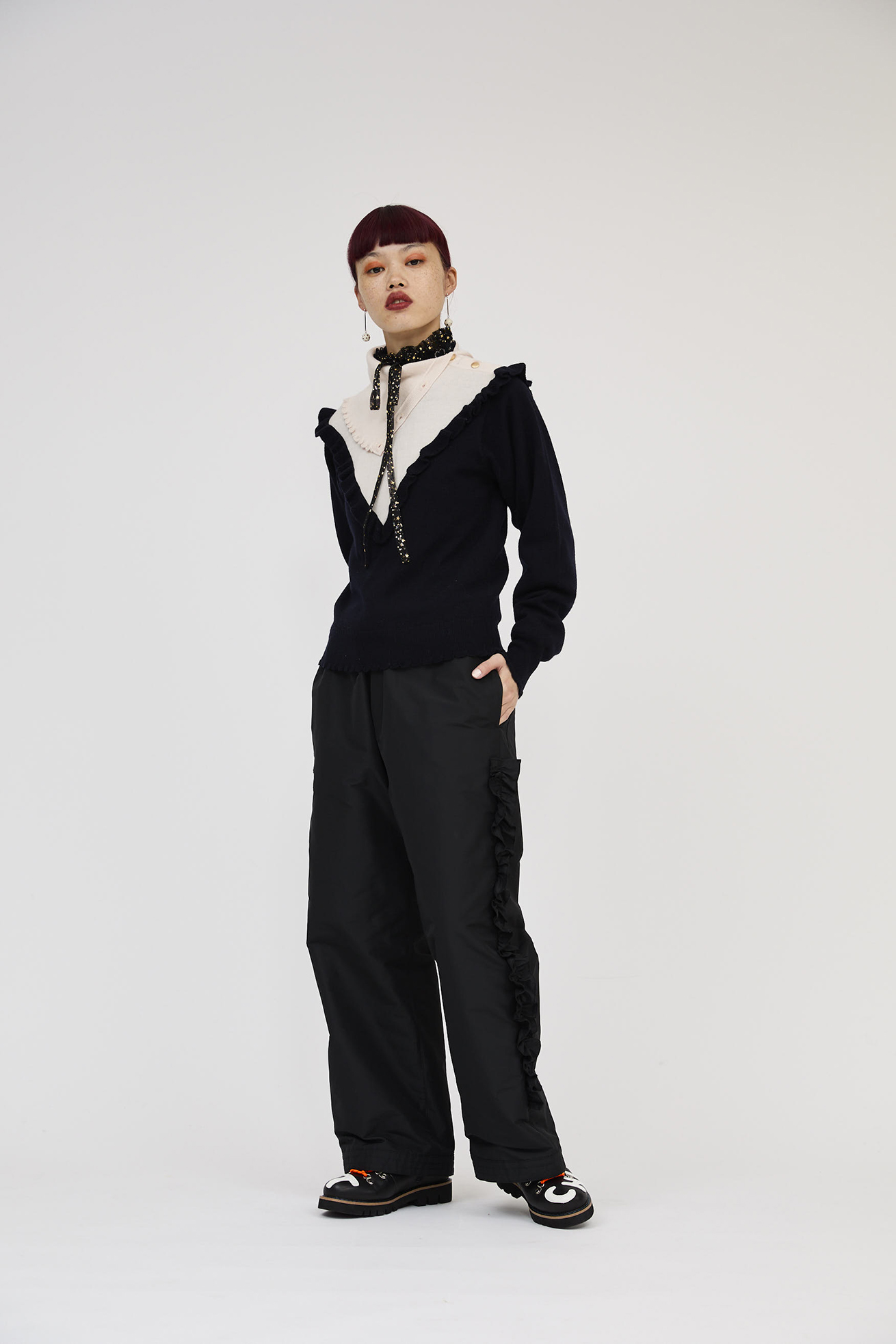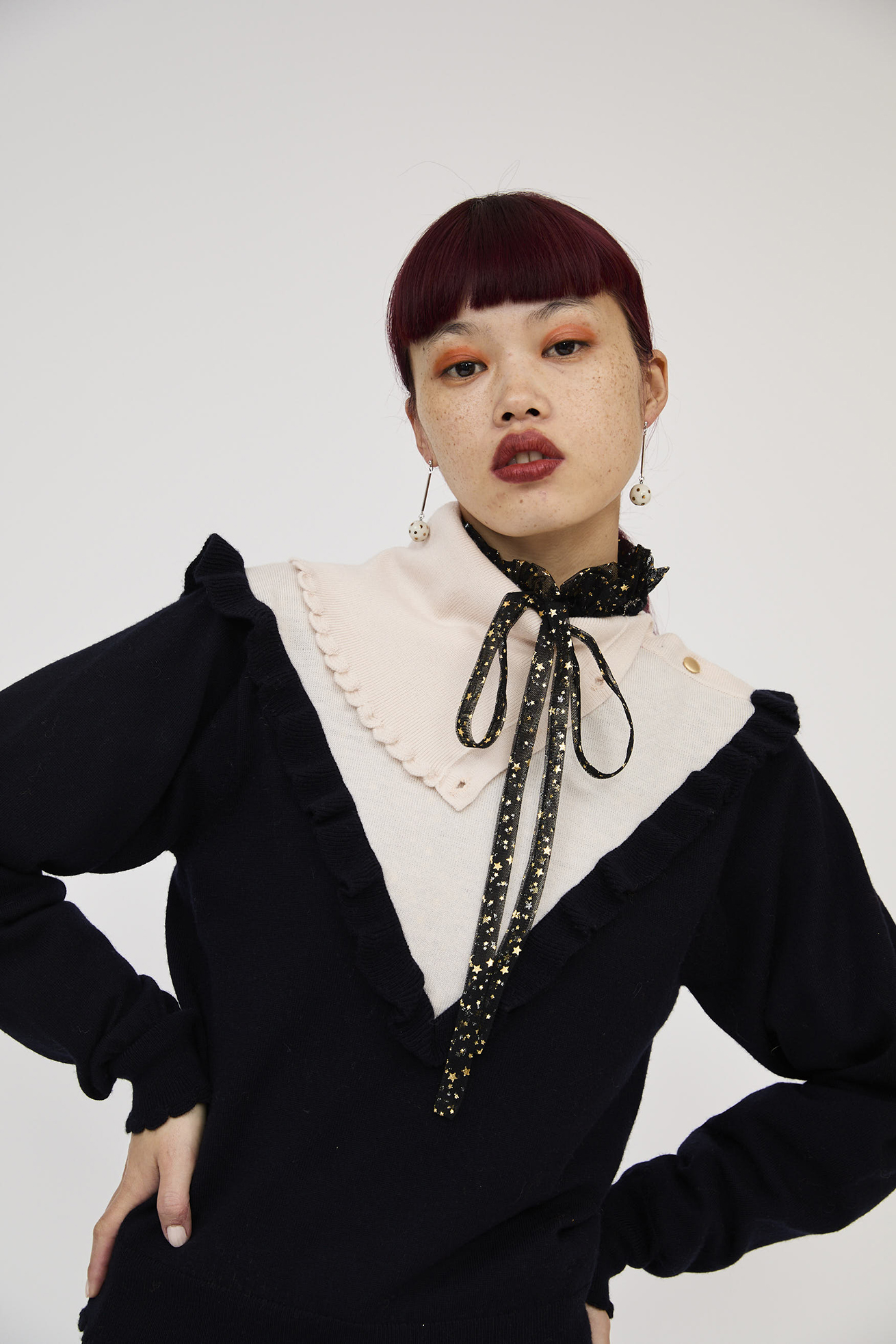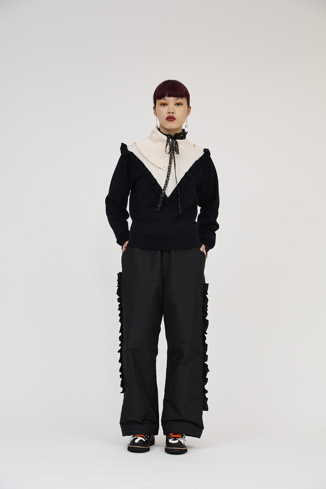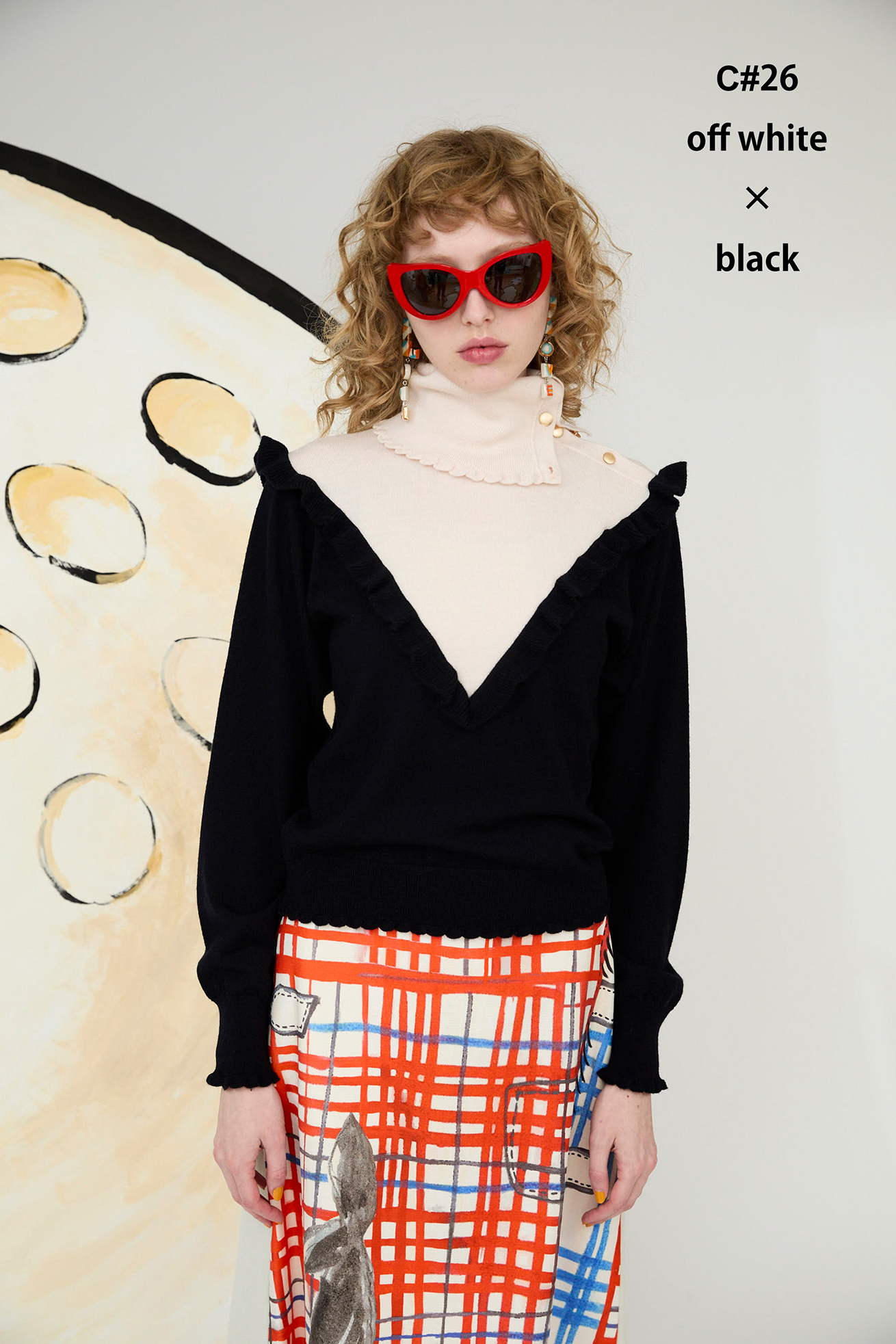 前後に深く入ったV字の切り替えの配色とフリルがポイントです。