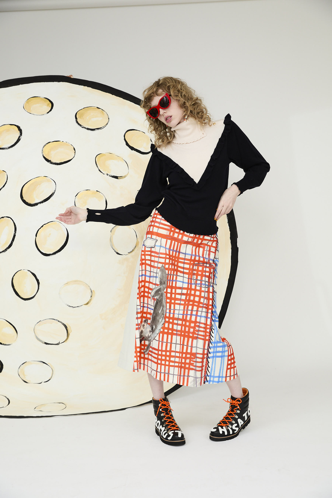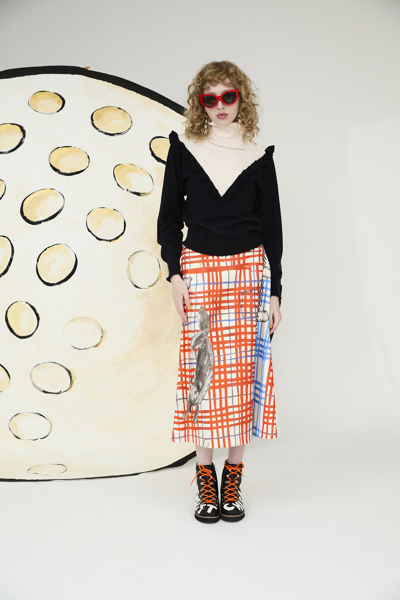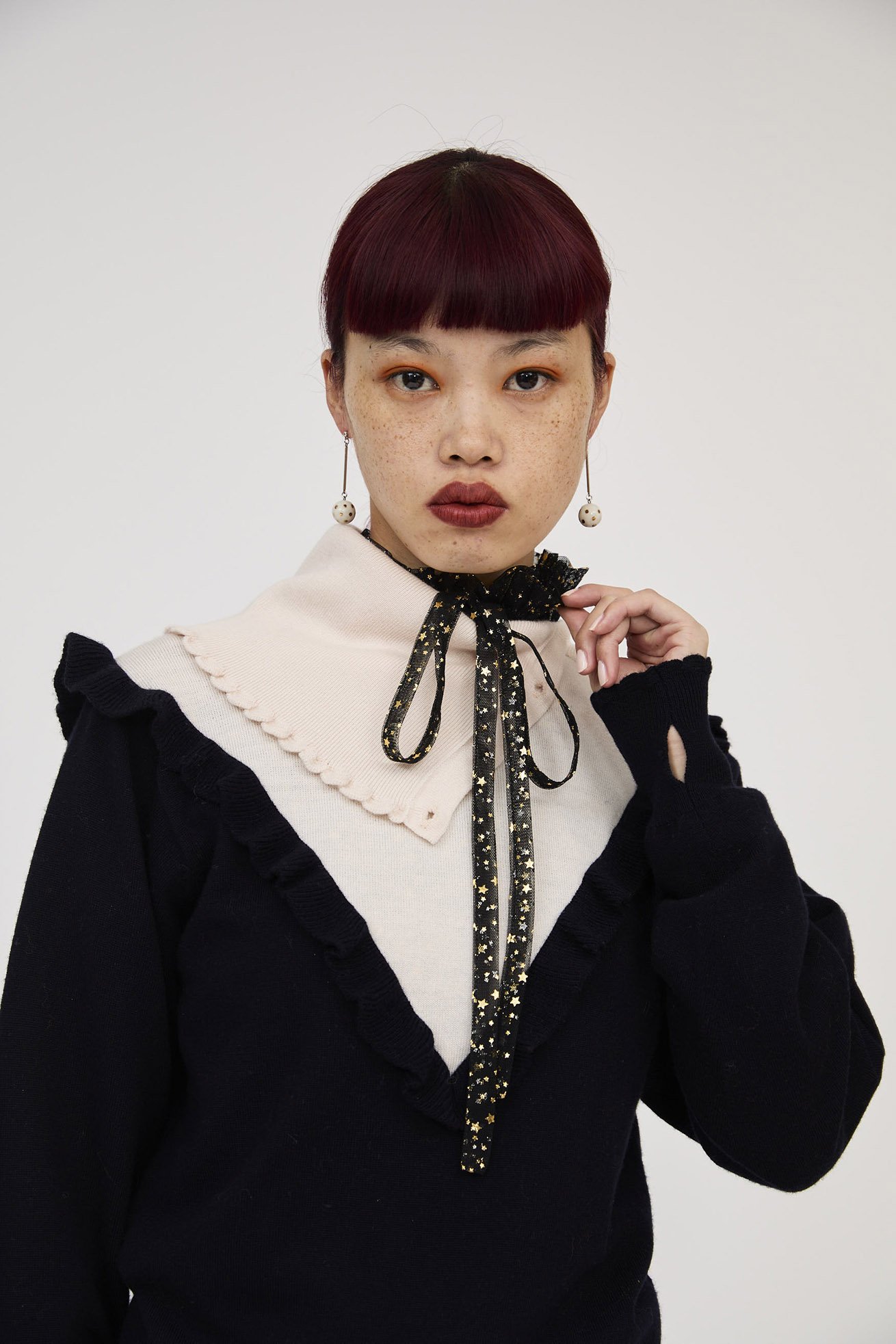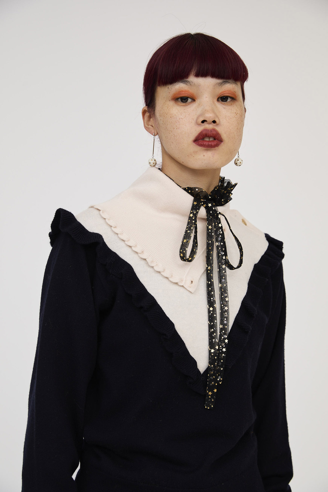 前後に深く入ったV字の切り替えの配色とフリルがポイントです。