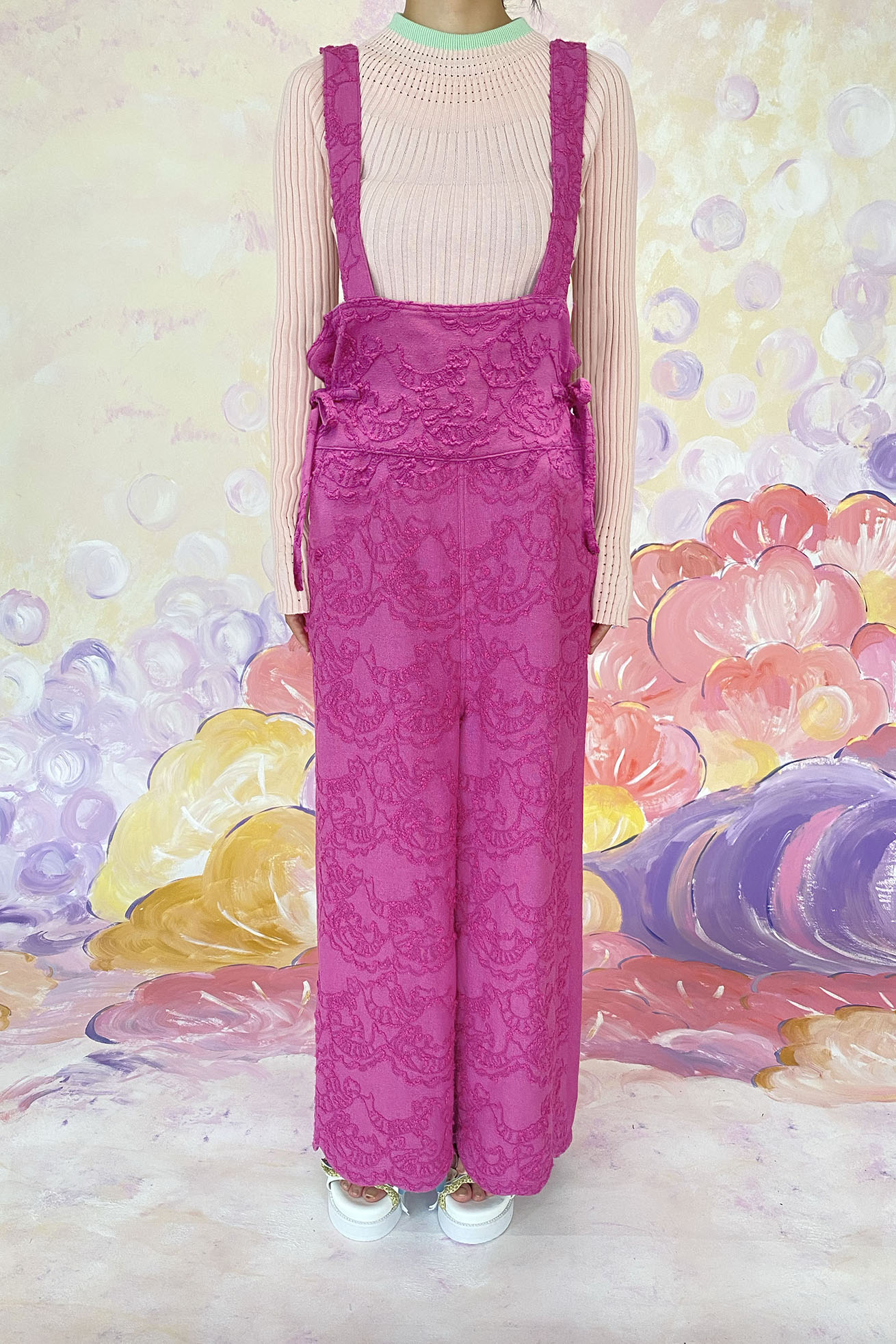 立体感のあるオリジナルの生地と無地を合わせたワイドシルエットのサロペットパンツです。 合わせるインナーによって3シーズンでご利用いただけます。 裾は裁ち切りにしてカジュアルに。 両サイドにポケットが付きます。 こちらの商品は手洗い可能です。 【生地の特徴】 マーメイドとネコ魚をスカラップのように並べて刺繍しました。 人魚のようなネコがいたら、、、という発想から今シーズンの新キャラクターとしてネコ魚が登場しています。 ネップが入りの、糸の太さに強弱のある糸を使用して、リング糸が特徴的なガーゼ素材に刺繍しました。 刺繍加工は福井県で行っています。 ※着用モデル身長:160cm ※着用サイズ: 2(M) ※当サイトの商品は実店舗と在庫を共有しており、ご注文完了後に商品を確保できない場合がございます。 その際、改めてキャンセルまたは数量変更のメールをお送りいたします。何卒ご了承いただけますと幸いです。
