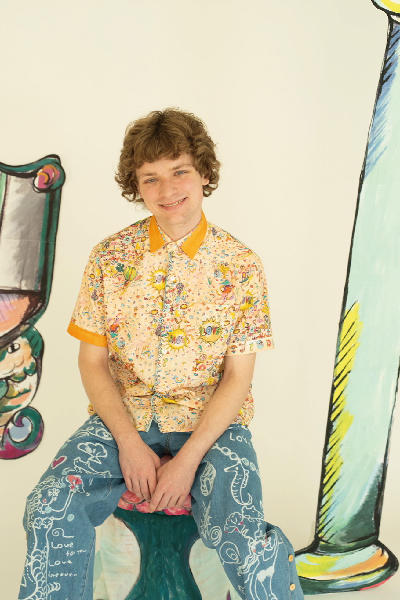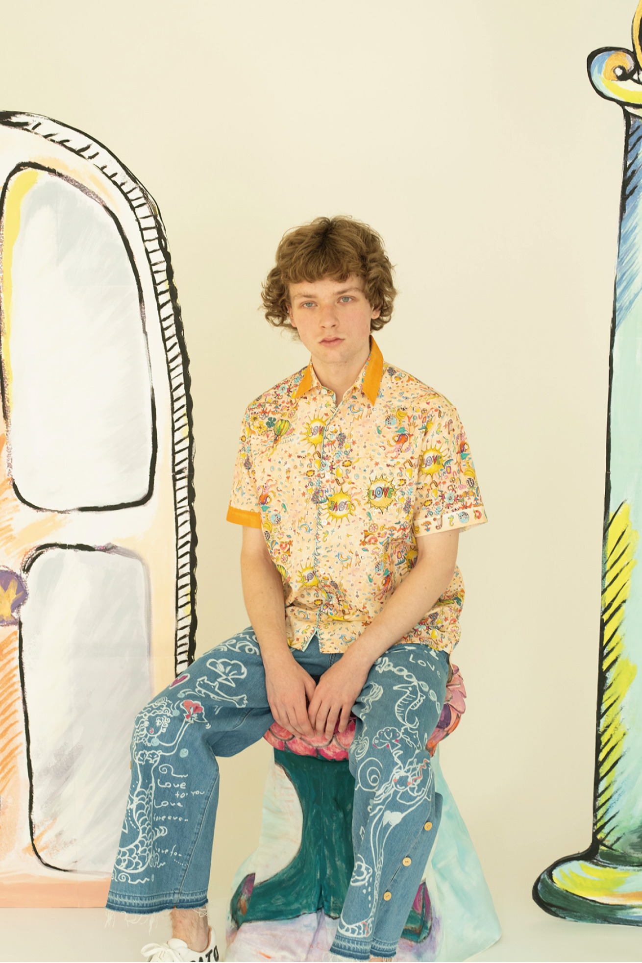 TSUMORI CHISATOらしいパワー溢れるカラフルなプリントと、胸ポケットのLOVE太陽のワッペンもアクセントになっています。