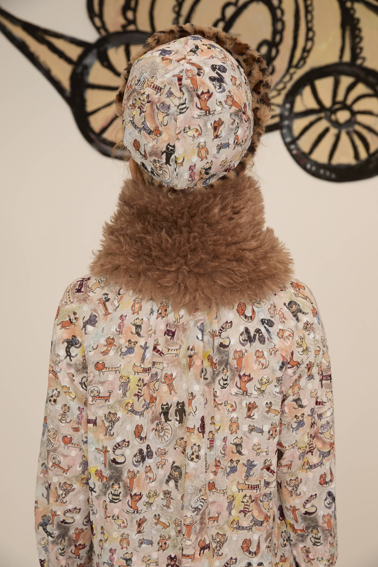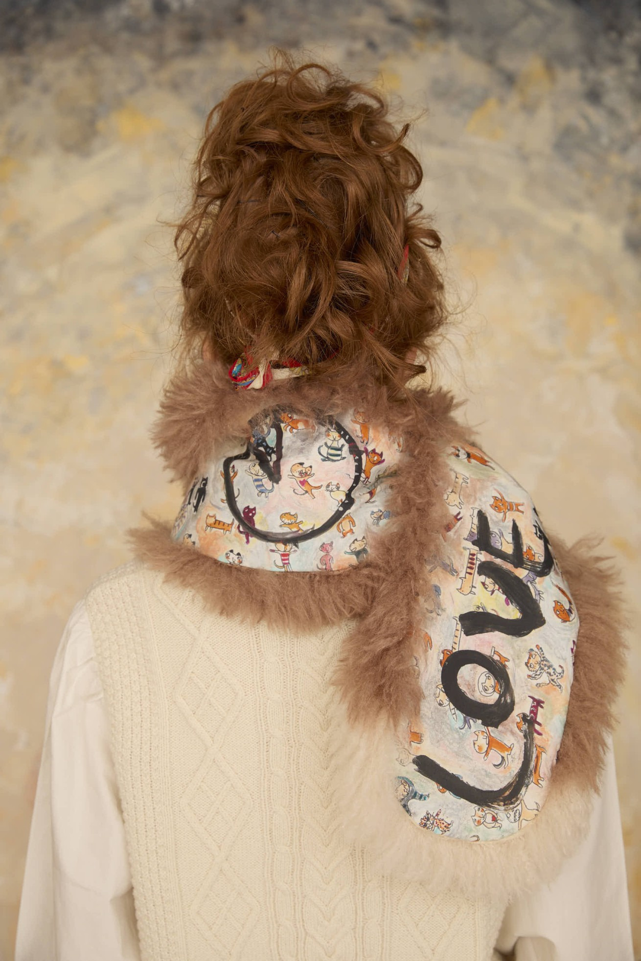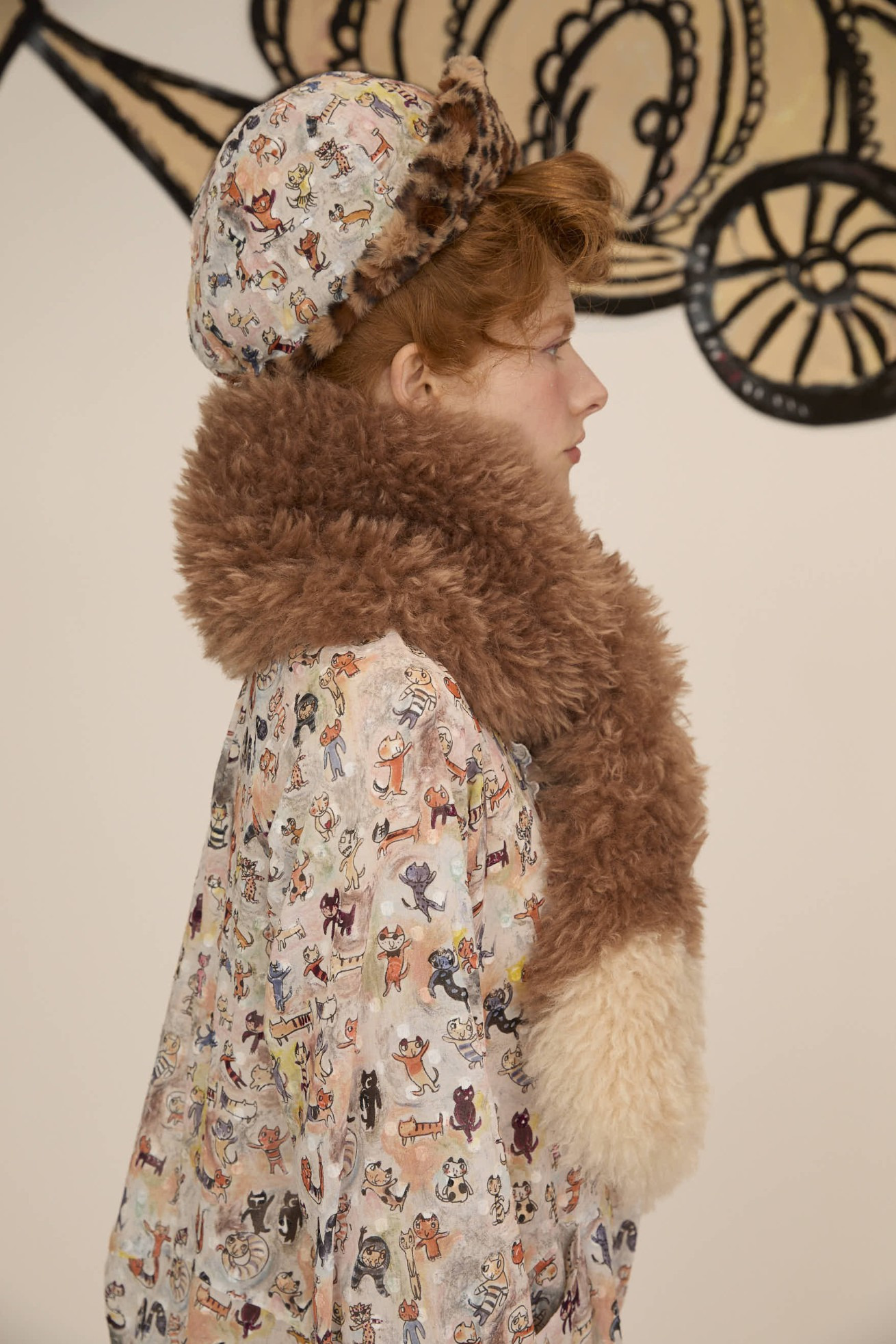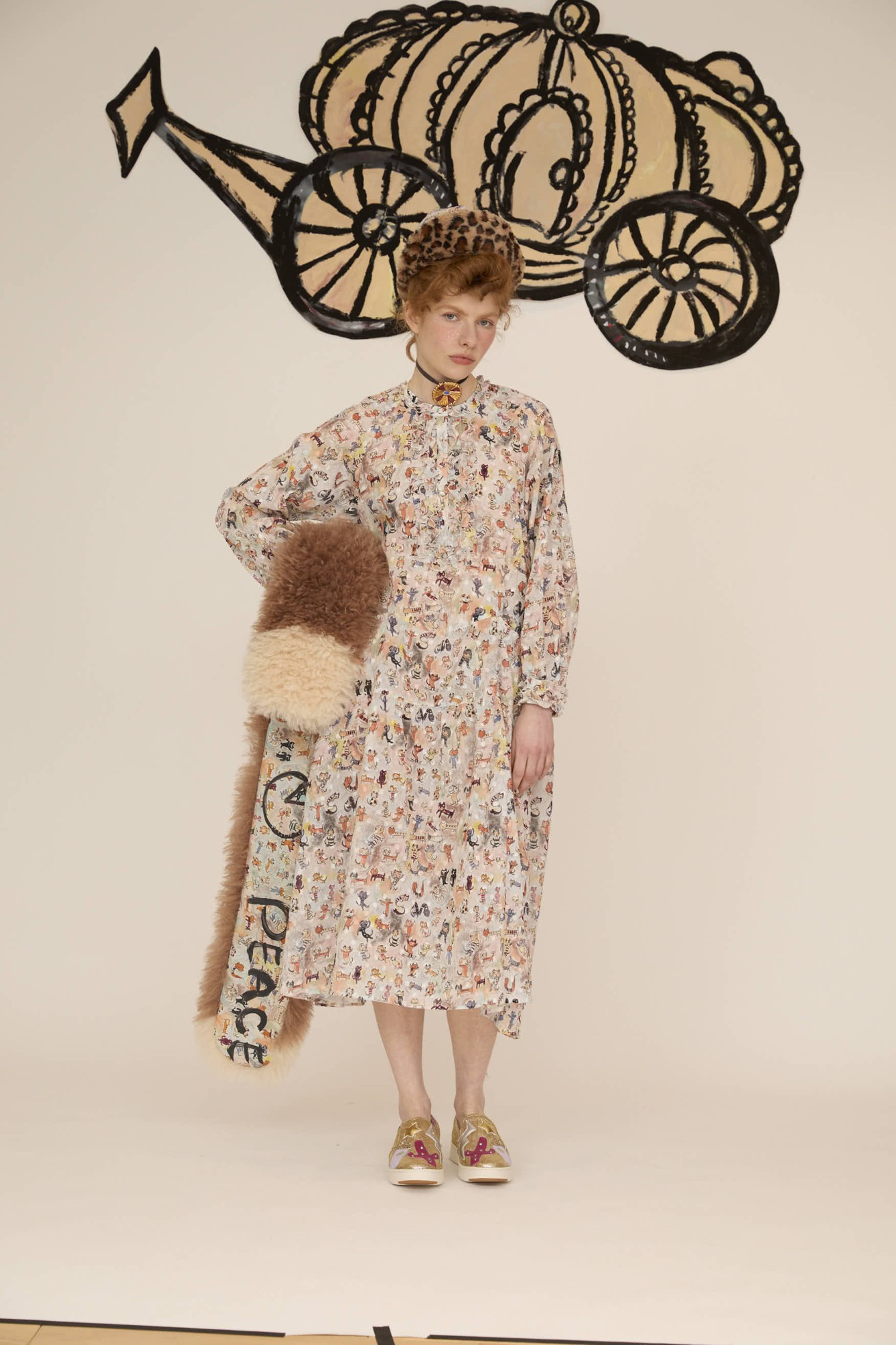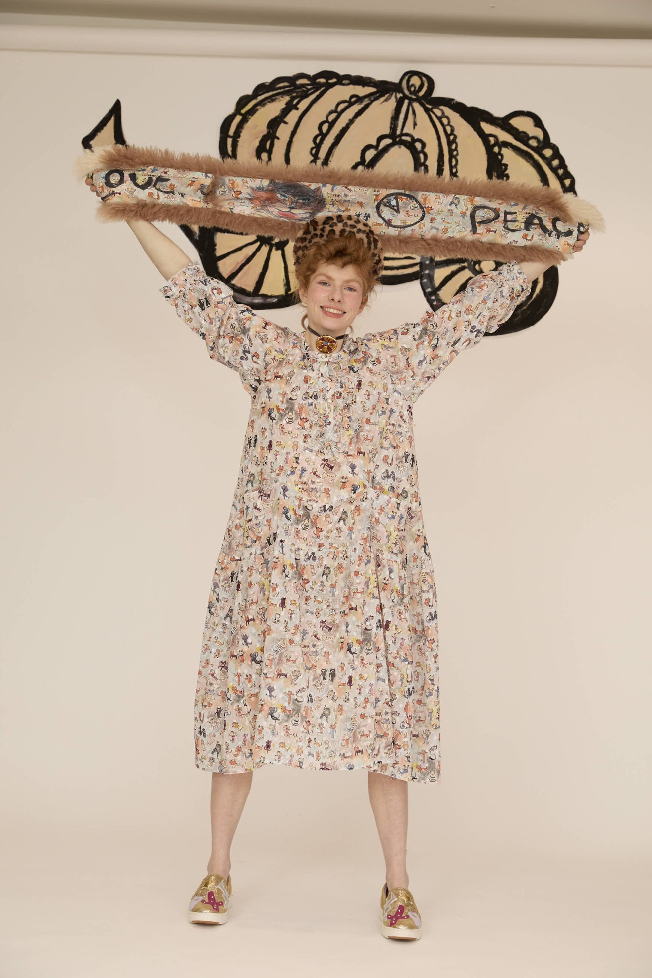 ファーのボリューム感と大きなねこ、LOVE、PEACEの文字がアクセントのリバーシブルマフラー。 プリント面にはmany funny cat's、ファー部分には毛足が長く細かなウェーブが入ったチベットラム風のフェイクファーを使用しています。 着用感が軽く、アレンジのしやすい大きさに仕上げています。 〈many funny cat's〉 踊ったり、歌ったり、スケボーしたり、フラダンスしたり、ぼーっとしたり、丸くなってみたり、文字になってみたりする、、、たくさんの楽しいネコたちを原画のタッチをそのままにインクジェットプリントで表現しました。 一匹一匹の猫をじっくりみたくなる、遊び心のあるテキスタイルです。大きな猫 の顔、ラフなタッチのサボテンや12時になりそうな時計、LOVEや雷、ネズミのシ ルエットがワイルドさを演出しています。サラサラとした肌触りで滑らかなシルクコットンの素材に中国でインクジェットプリントをしています。 ケア方法:ドライクリーニング ※当サイトの商品は実店舗と在庫を共有しており、ご注文完了後に商品を確保できない場合がございます。 その際、改めてキャンセルまたは数量変更のメールをお送りいたします。何卒ご了承いただけますと幸いです。