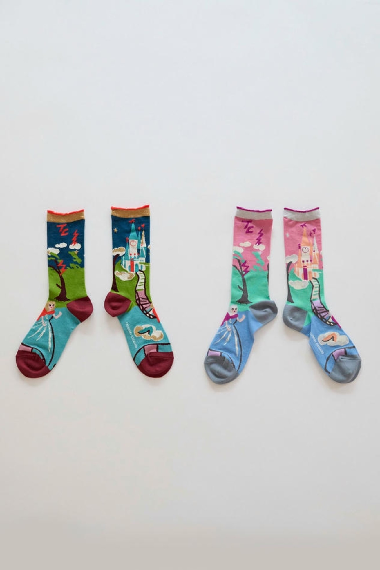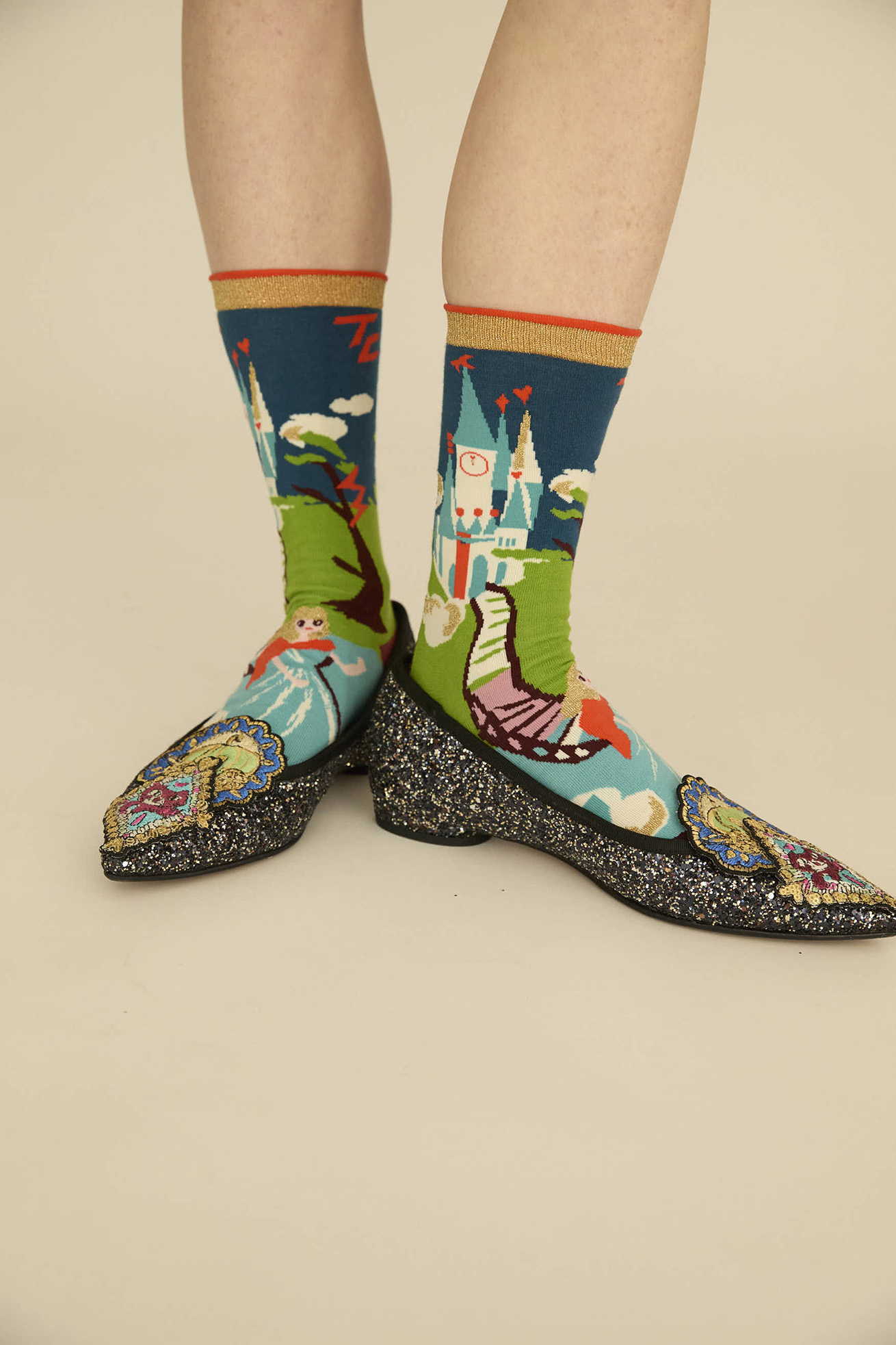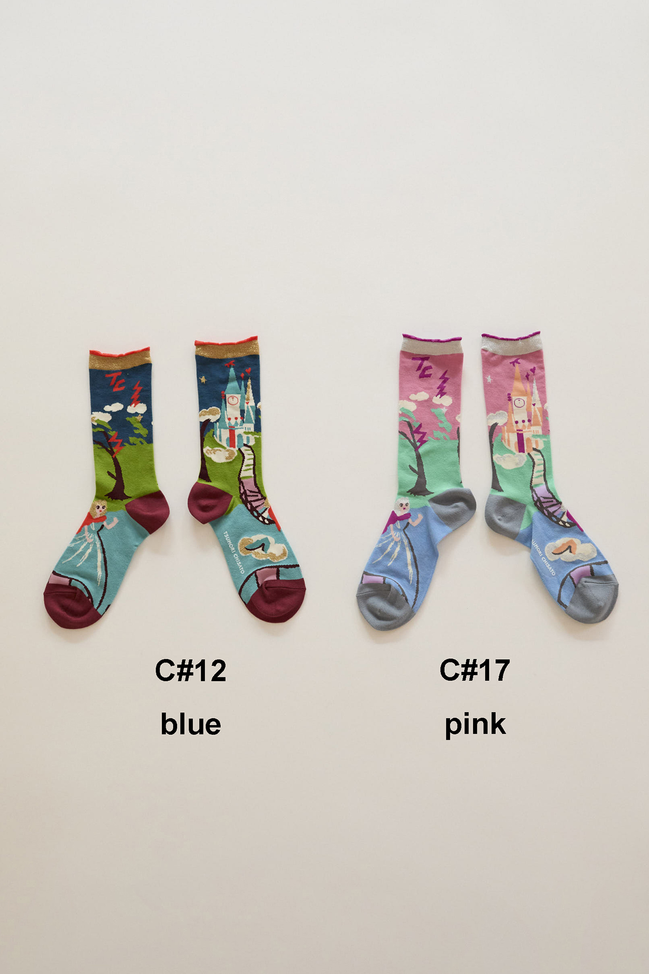 プリンセスがお城から駆け降りていく様子を物語の1ページのようなソックスにしました。 12時を指すお城の時計台、階段を駆け降りるプリンセス、TCの文字になっている雷、雲の上に片方のガラスの靴、踊っているような木々やサボテン。 細かい柄を丁寧に表現した、手の込んだソックスです。東京都で制作しています。 ※着用モデル身長:170cm ※当サイトの商品は実店舗と在庫を共有しており、ご注文完了後に商品を確保できない場合がございます。 その際、改めてキャンセルまたは数量変更のメールをお送りいたします。何卒ご了承いただけますと幸いです。