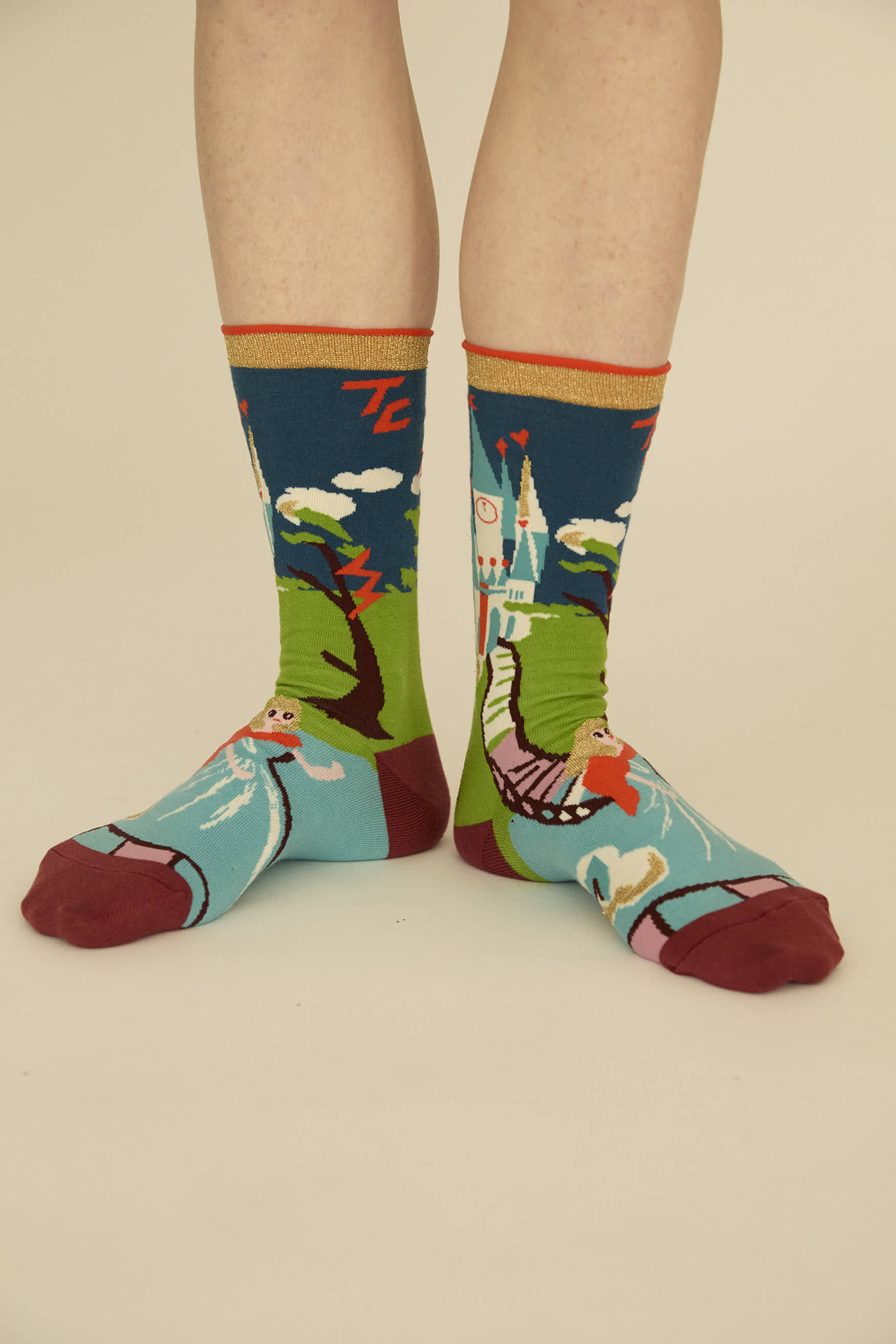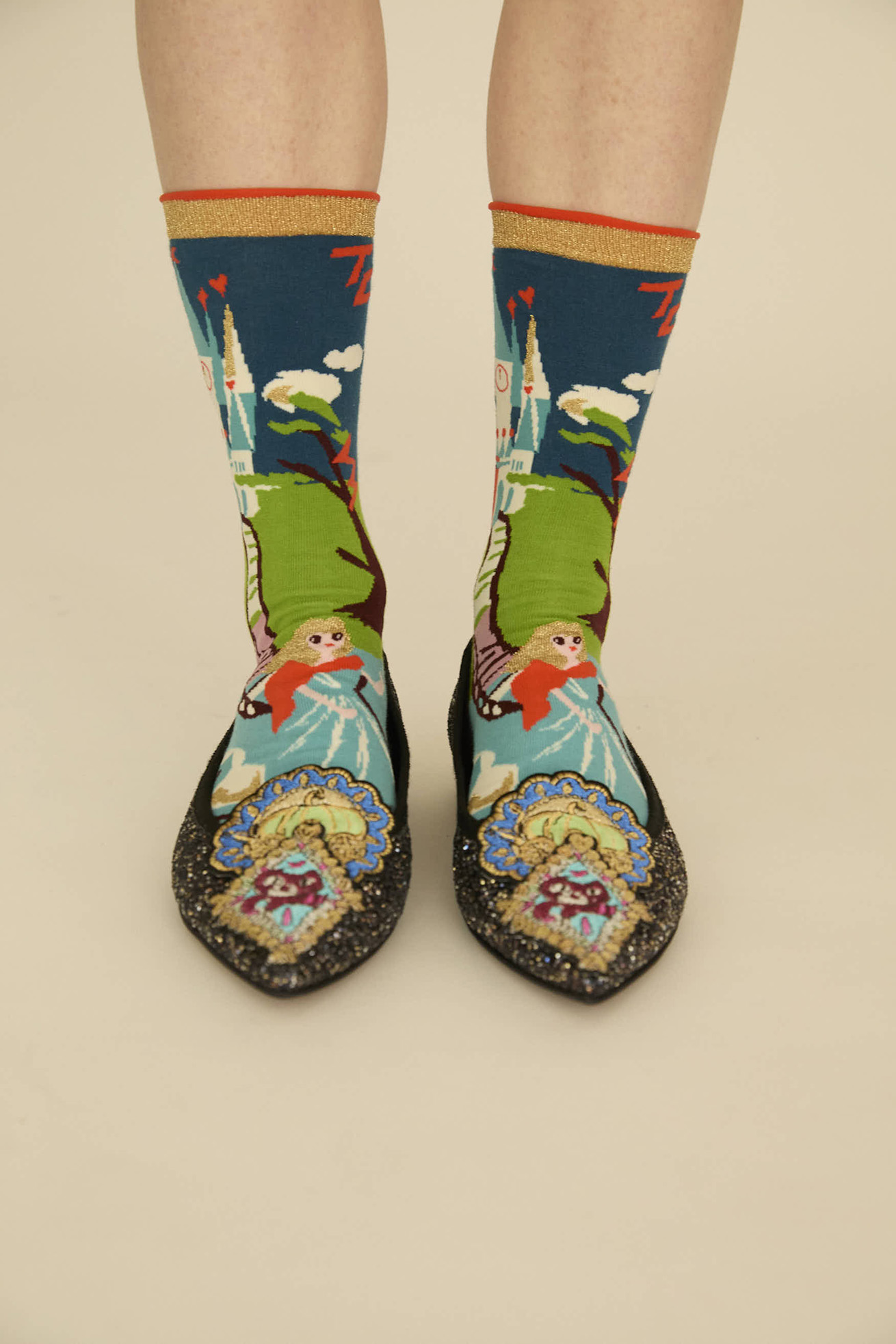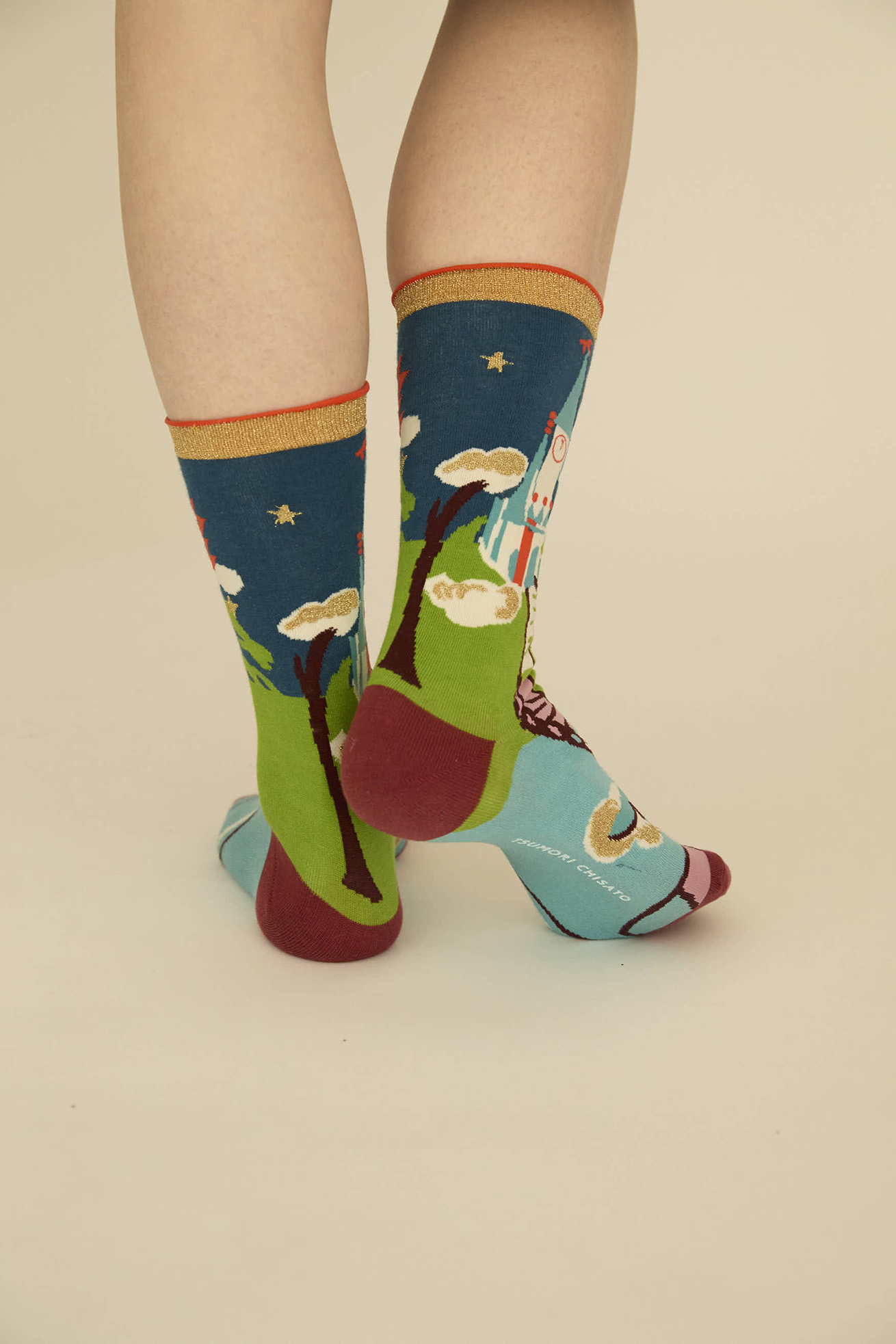 プリンセスがお城から駆け降りていく様子を物語の1ページのようなソックスにしました。 12時を指すお城の時計台、階段を駆け降りるプリンセス、TCの文字になっている雷、雲の上に片方のガラスの靴、踊っているような木々やサボテン。 細かい柄を丁寧に表現した、手の込んだソックスです。東京都で制作しています。 ※着用モデル身長:170cm ※当サイトの商品は実店舗と在庫を共有しており、ご注文完了後に商品を確保できない場合がございます。 その際、改めてキャンセルまたは数量変更のメールをお送りいたします。何卒ご了承いただけますと幸いです。