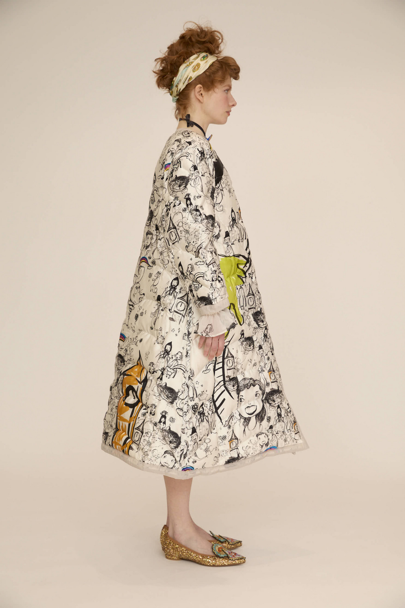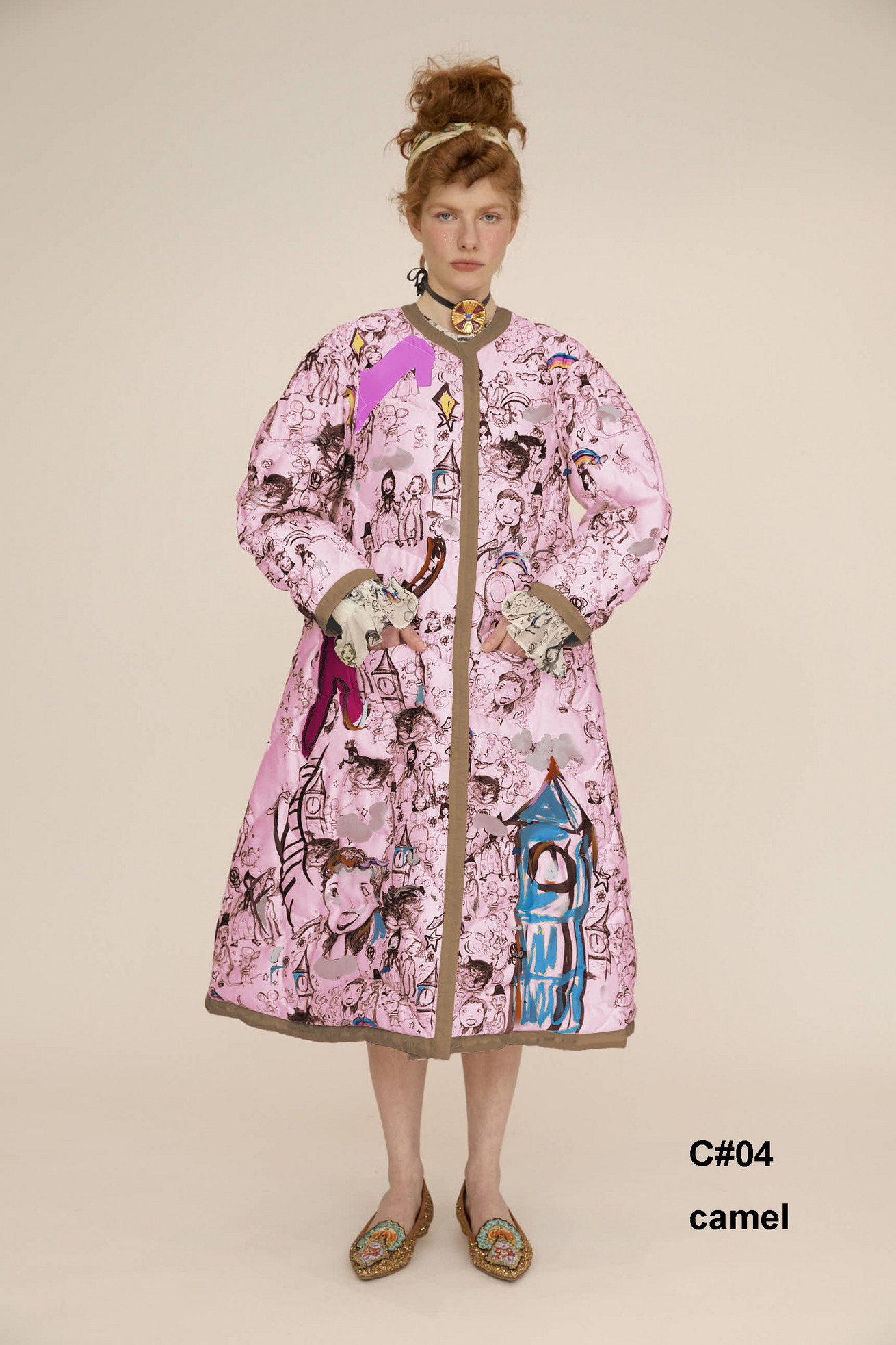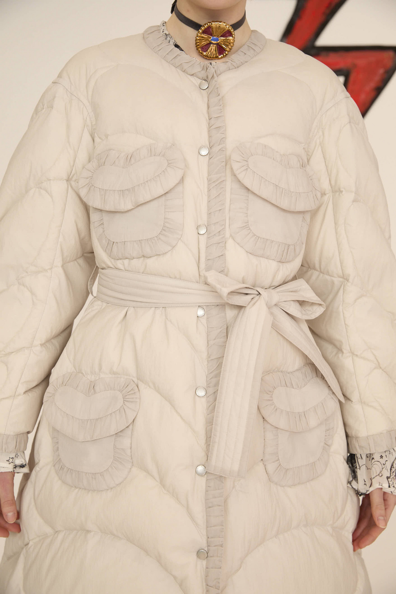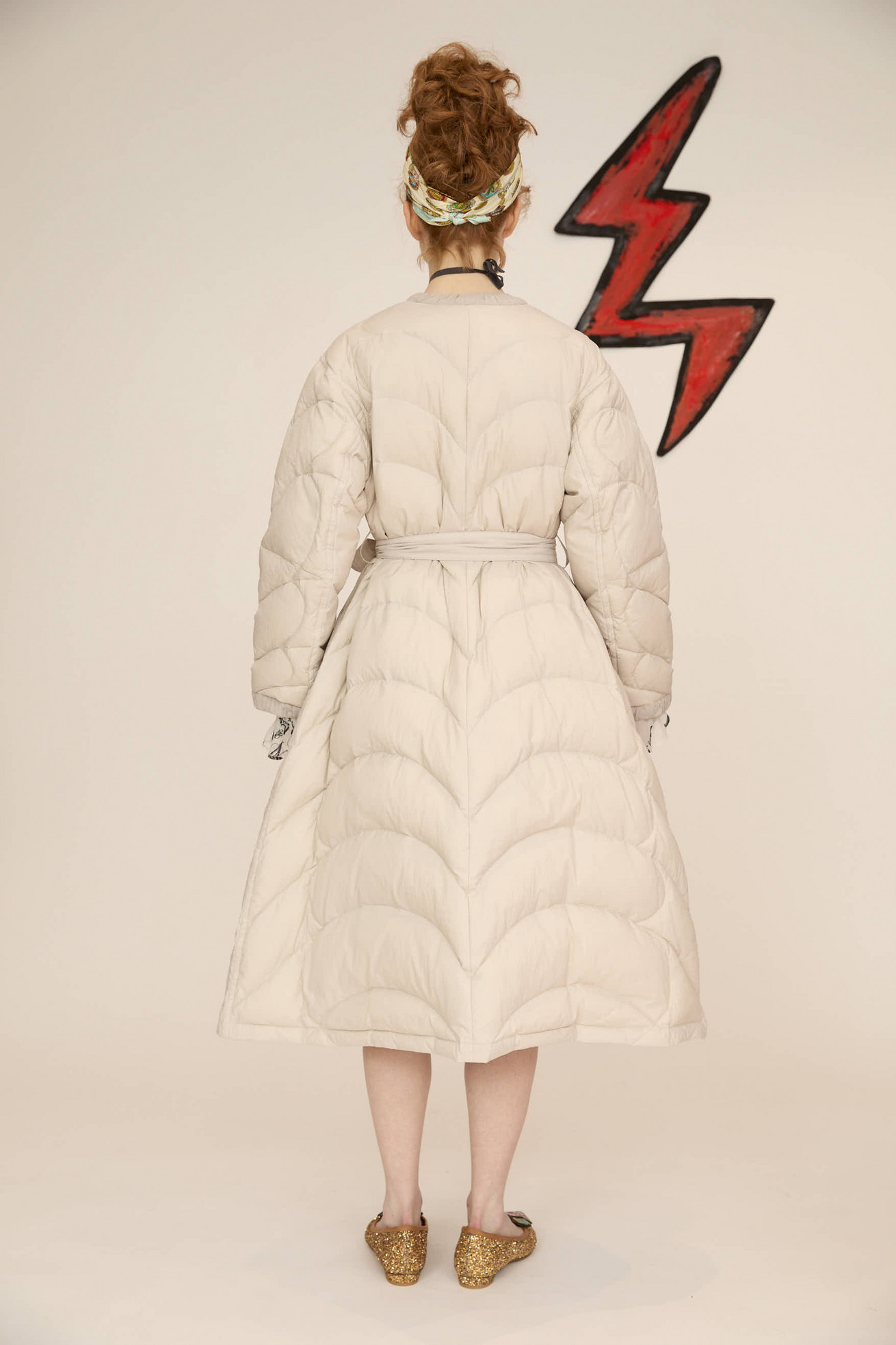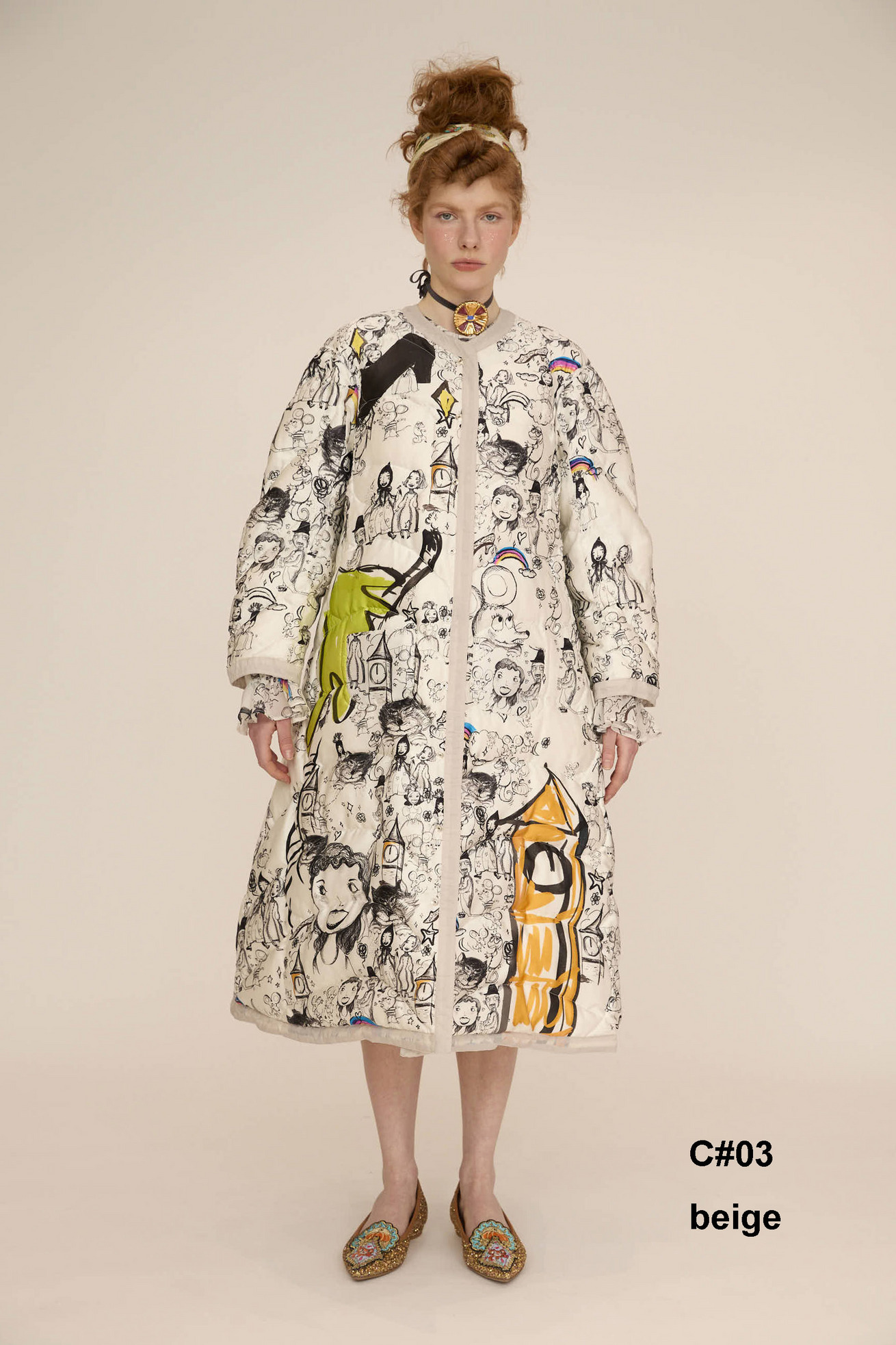 12 o'clock printと無地のタフタ生地を合わせたリバーシブルライトダウンです。 4つのハートポケット、全体のハートステッチはシンプルながら大人可愛いポイントです。 無地面の生地には、20デニールという極細のナイロン糸を使用し、高密度に織られたタフタ素材で、環境に配慮したリサイクルナイロンを使用しています。 サラッとして透明感があり、軽量でエアリーな風合いが特徴です。 生地の仕上げに特殊なタンブラー加工を施し、ヴィンテージのような細かいシボのある表面感に仕上げています。 撥水加工が施されているため、水滴がついても玉状になり水を弾く機能があります。 どちらを表にしてもシルエットがくずれず、全く違う雰囲気をお楽しみいただけます。 〈12 o'clock print〉 プリンセス、ねこ、ネズミ、魔法使いなどのキャラクターを散りばめて、大きな 階段やガラスの靴、時計台などをアクセントに大胆に配置しました。 モノトーンの中にイエローが映えるオフホワイト、かわいらしさとシックさのあるピンクの2色展開です。12時の時計台の音が聞こえてきそうなイメージのテキスタイルです。 滑らかで光沢感のあるシルクサテンに中国でプリントしています。 ケア方法:ドライクリーニング ※着用モデル身長:170cm ※着用サイズ: 2(M) ※当サイトの商品は実店舗と在庫を共有しており、ご注文完了後に商品を確保できない場合がございます。 その際、改めてキャンセルまたは数量変更のメールをお送りいたします。何卒ご了承いただけますと幸いです。