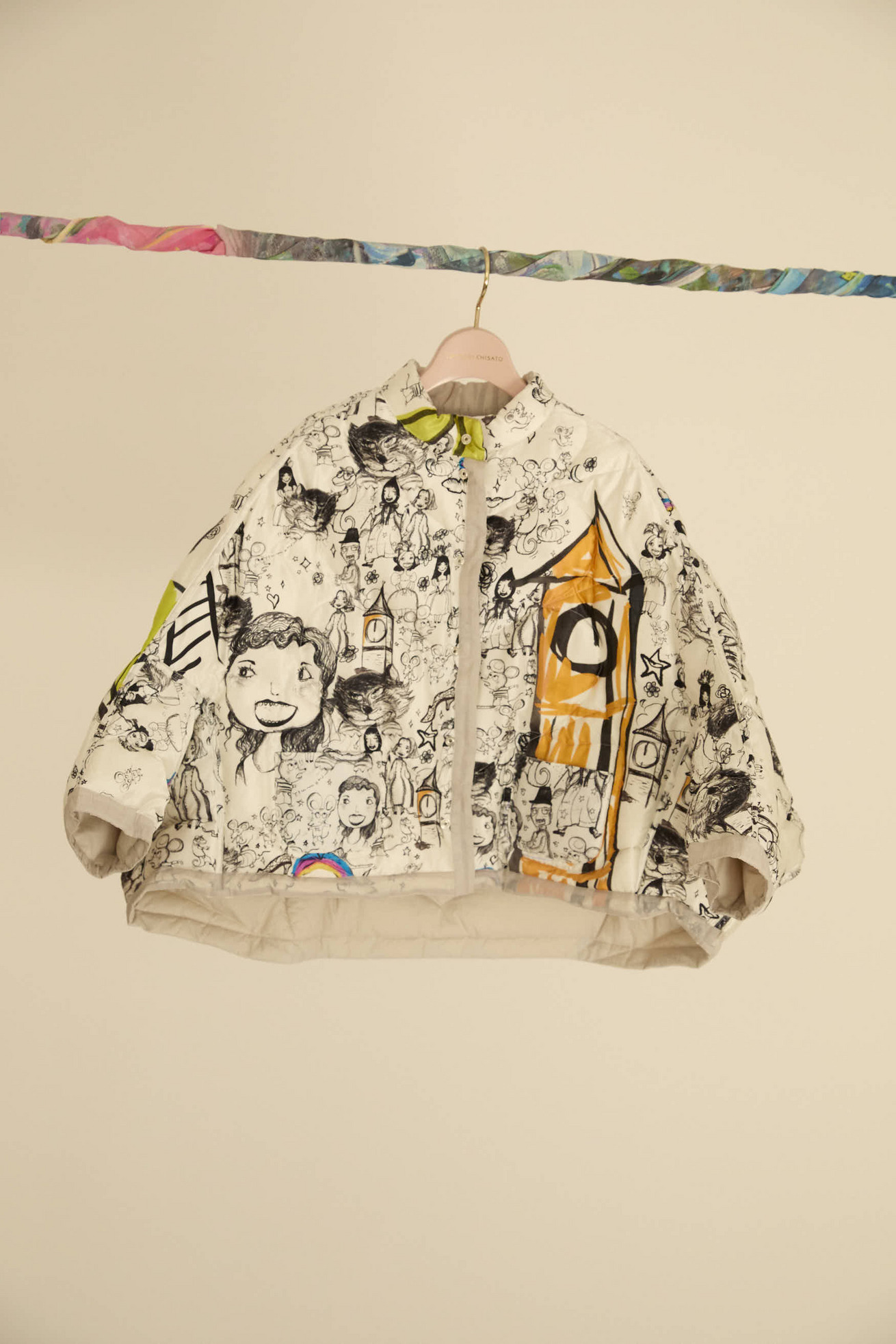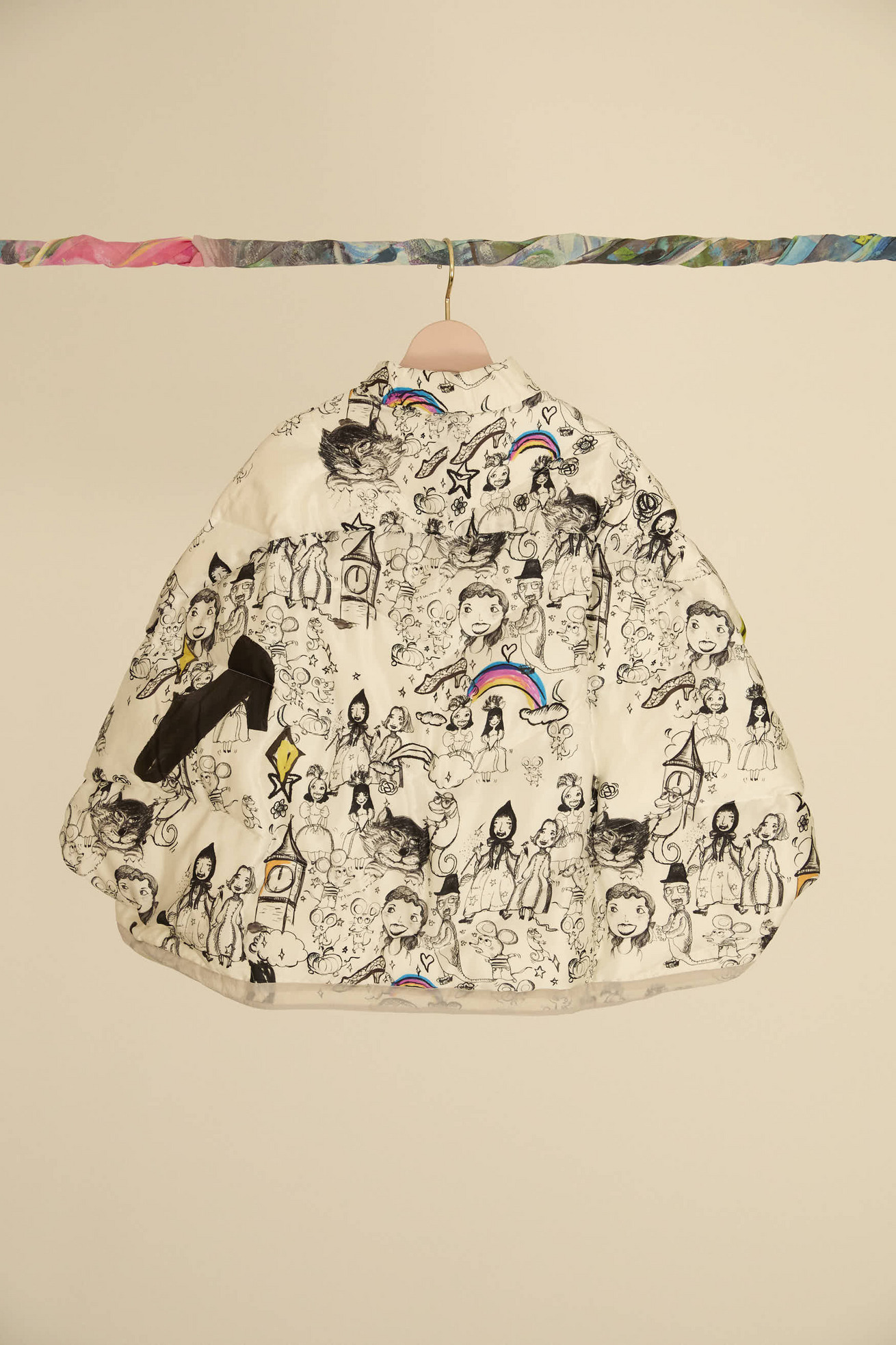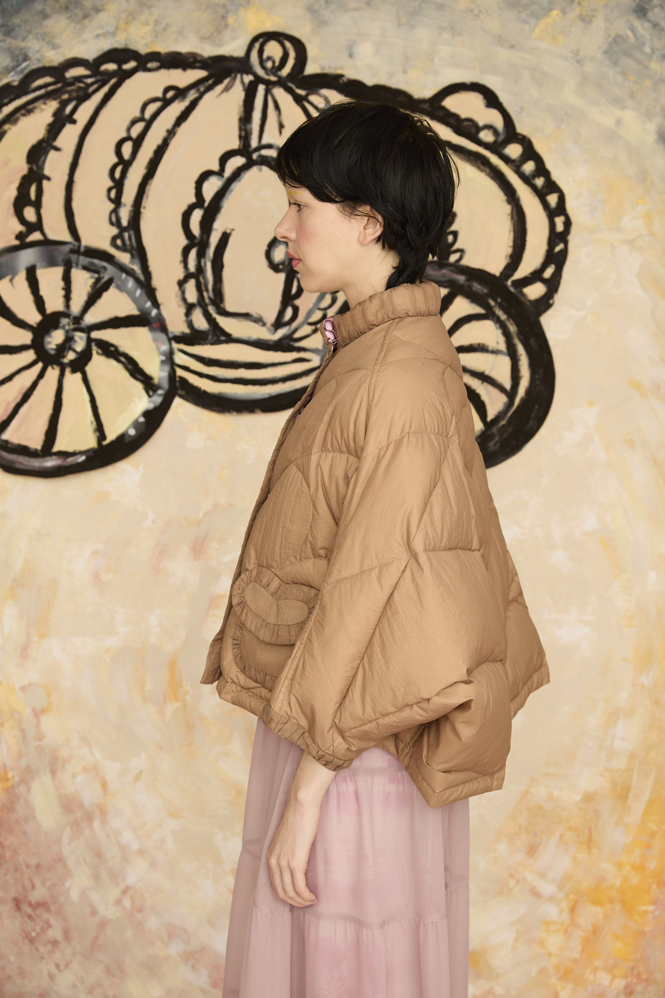 12 o'clock printと無地のタフタ生地を合わせたポンチョ風リバーシブルライトダウンです。 ゆったりとしたシルエットと、コンパクトなスタンドカラーのバランスが良いアイテムです。 ギャザー布でトリミングをしたハートポケット、全体のハートステッチもポイントです。 無地の生地には20デニールという極細のナイロン糸を使用し、高密度に織られたタフタ素材で、環境に配慮したリサイクルナイロンを使用しています。 サラッとして透明感があり、軽量でエアリーな風合いが特徴です。 生地の仕上げに特殊なタンブラー加工を施し、ヴィンテージのような細かいシボのある表面感に仕上げています。 撥水加工が施されているため、水滴がついても玉状になり水を弾く機能があります。 どちらを表にしてもシルエットがくずれず、全く違う雰囲気をお楽しみいただけます。 ※プリントのモチーフの出方は商品により異なります。モチーフの出方はお選びいただけませんので、予めご了承ください。 〈12 o'clock print〉 プリンセス、ねこ、ネズミ、魔法使いなどのキャラクターを散りばめて、大きな 階段やガラスの靴、時計台などをアクセントに大胆に配置しました。 モノトーンの中にイエローが映えるオフホワイト、かわいらしさとシックさのあるピンクの2色展開です。12時の時計台の音が聞こえてきそうなイメージのテキスタイルです。 滑らかで光沢感のあるシルクサテンに中国でプリントしています。 ケア方法:ドライクリーニング ※着用モデル身長:173cm ※着用サイズ: 2(M) ※当サイトの商品は実店舗と在庫を共有しており、ご注文完了後に商品を確保できない場合がございます。 その際、改めてキャンセルまたは数量変更のメールをお送りいたします。何卒ご了承いただけますと幸いです。