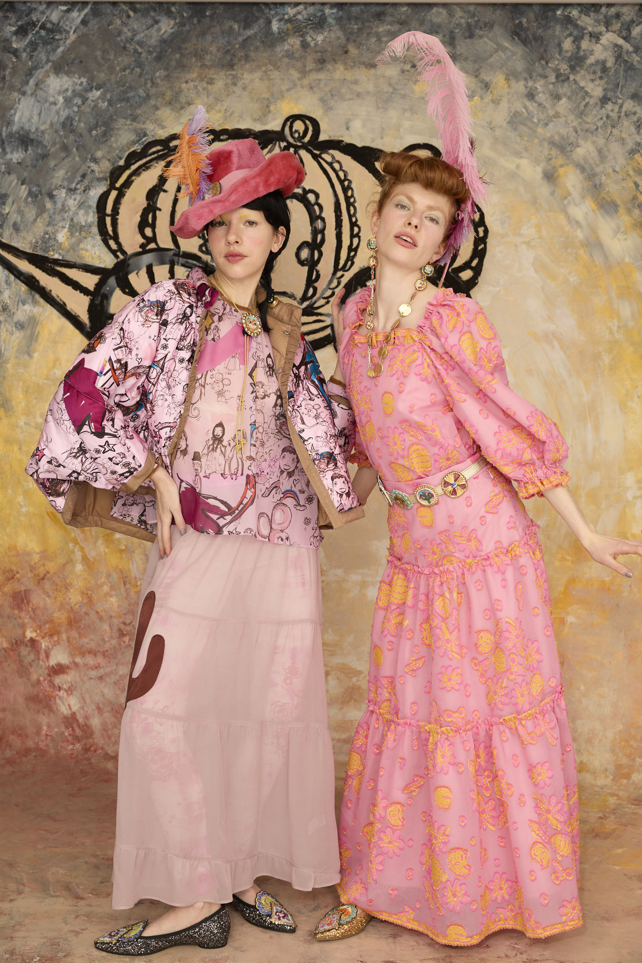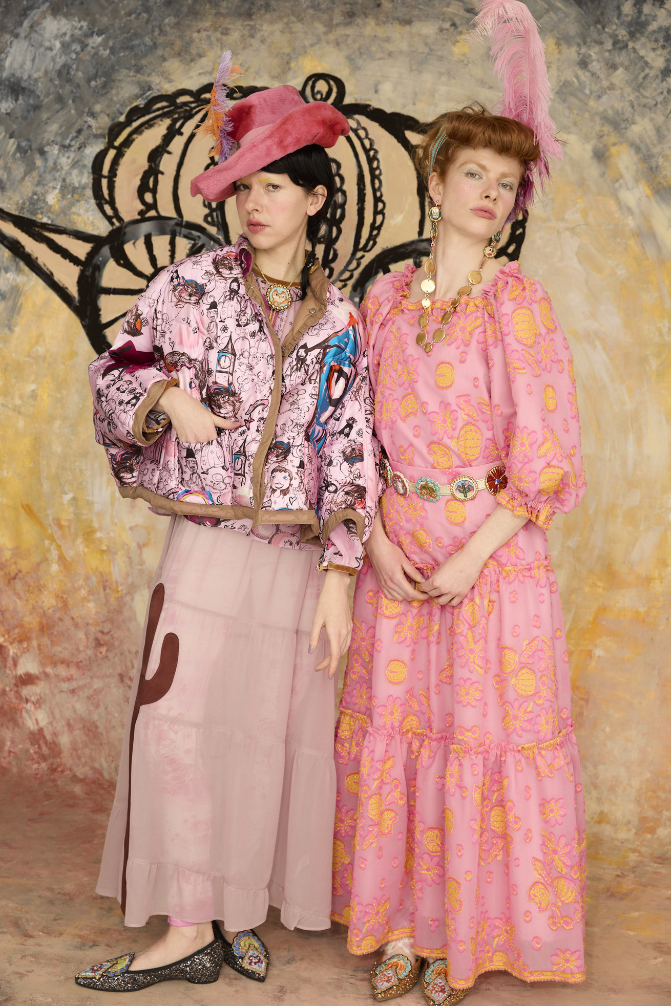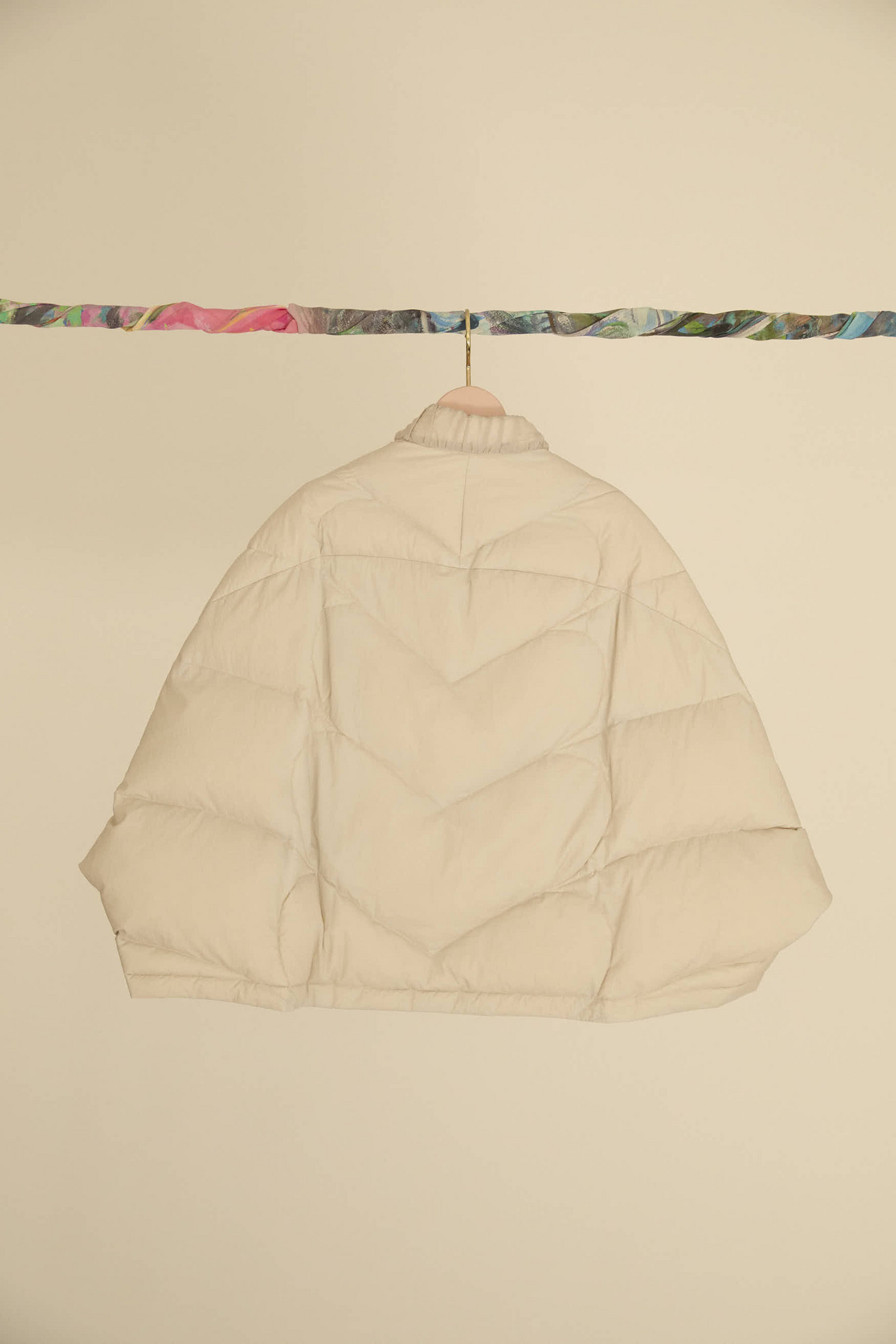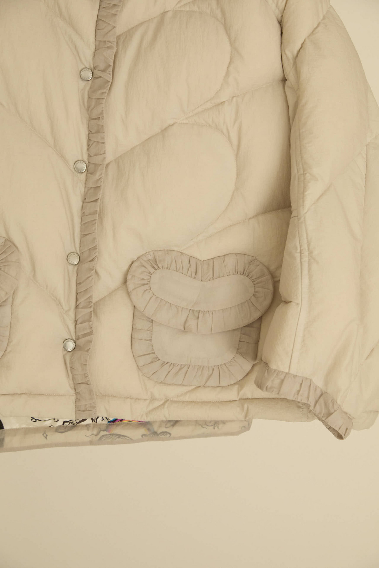 12 o'clock printと無地のタフタ生地を合わせたポンチョ風リバーシブルライトダウンです。 ゆったりとしたシルエットと、コンパクトなスタンドカラーのバランスが良いアイテムです。 ギャザー布でトリミングをしたハートポケット、全体のハートステッチもポイントです。 無地の生地には20デニールという極細のナイロン糸を使用し、高密度に織られたタフタ素材で、環境に配慮したリサイクルナイロンを使用しています。 サラッとして透明感があり、軽量でエアリーな風合いが特徴です。 生地の仕上げに特殊なタンブラー加工を施し、ヴィンテージのような細かいシボのある表面感に仕上げています。 撥水加工が施されているため、水滴がついても玉状になり水を弾く機能があります。 どちらを表にしてもシルエットがくずれず、全く違う雰囲気をお楽しみいただけます。 ※プリントのモチーフの出方は商品により異なります。モチーフの出方はお選びいただけませんので、予めご了承ください。 〈12 o'clock print〉 プリンセス、ねこ、ネズミ、魔法使いなどのキャラクターを散りばめて、大きな 階段やガラスの靴、時計台などをアクセントに大胆に配置しました。 モノトーンの中にイエローが映えるオフホワイト、かわいらしさとシックさのあるピンクの2色展開です。12時の時計台の音が聞こえてきそうなイメージのテキスタイルです。 滑らかで光沢感のあるシルクサテンに中国でプリントしています。 ケア方法:ドライクリーニング ※着用モデル身長:173cm ※着用サイズ: 2(M) ※当サイトの商品は実店舗と在庫を共有しており、ご注文完了後に商品を確保できない場合がございます。 その際、改めてキャンセルまたは数量変更のメールをお送りいたします。何卒ご了承いただけますと幸いです。
