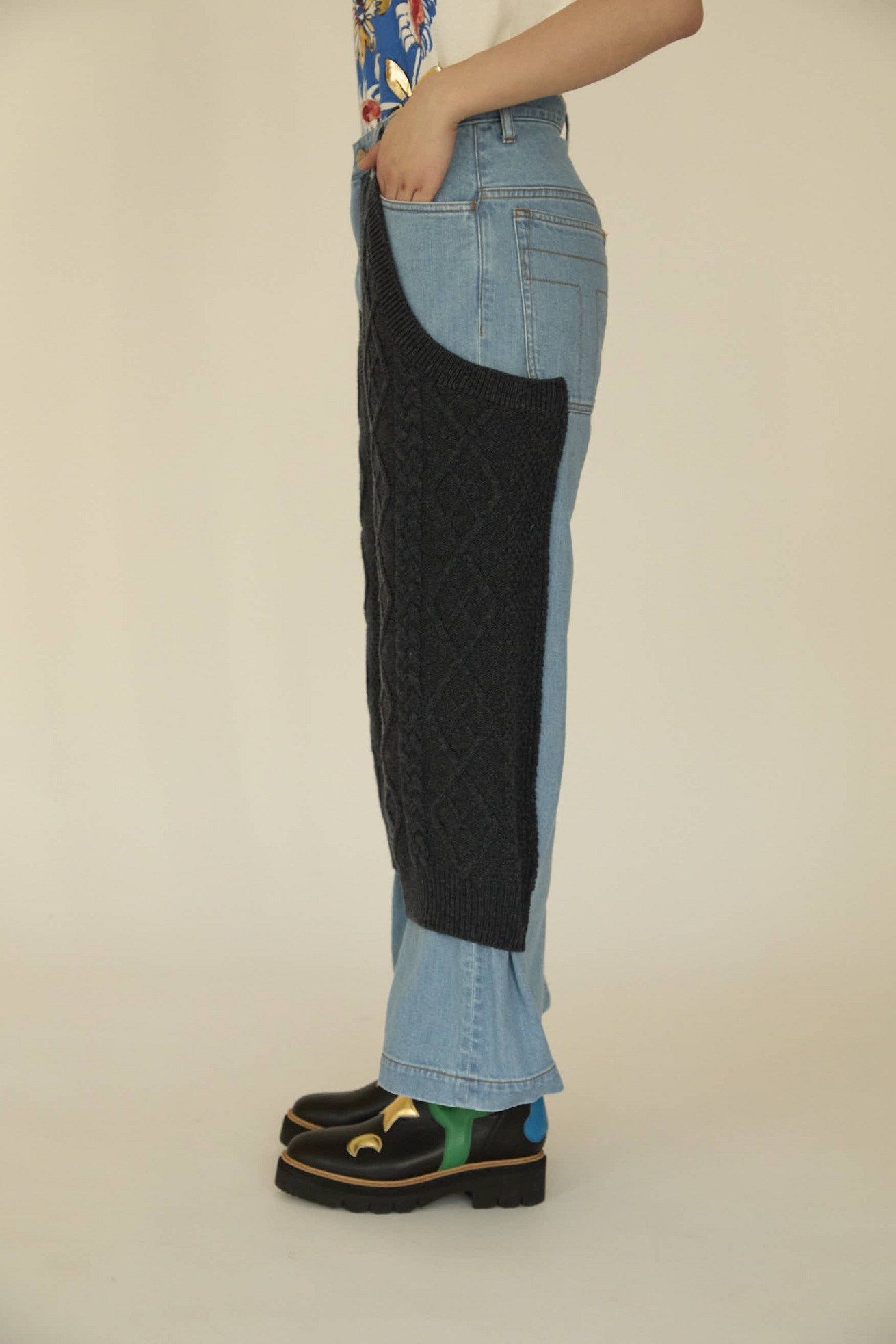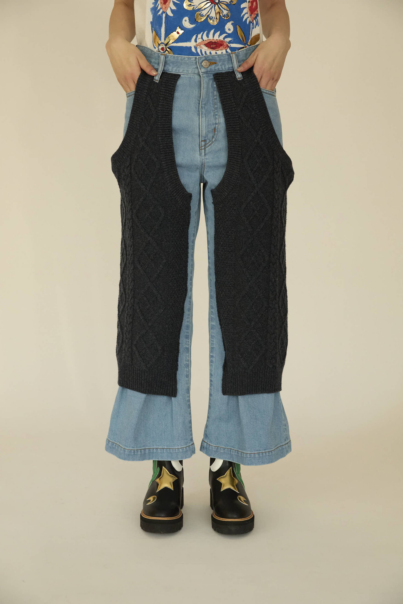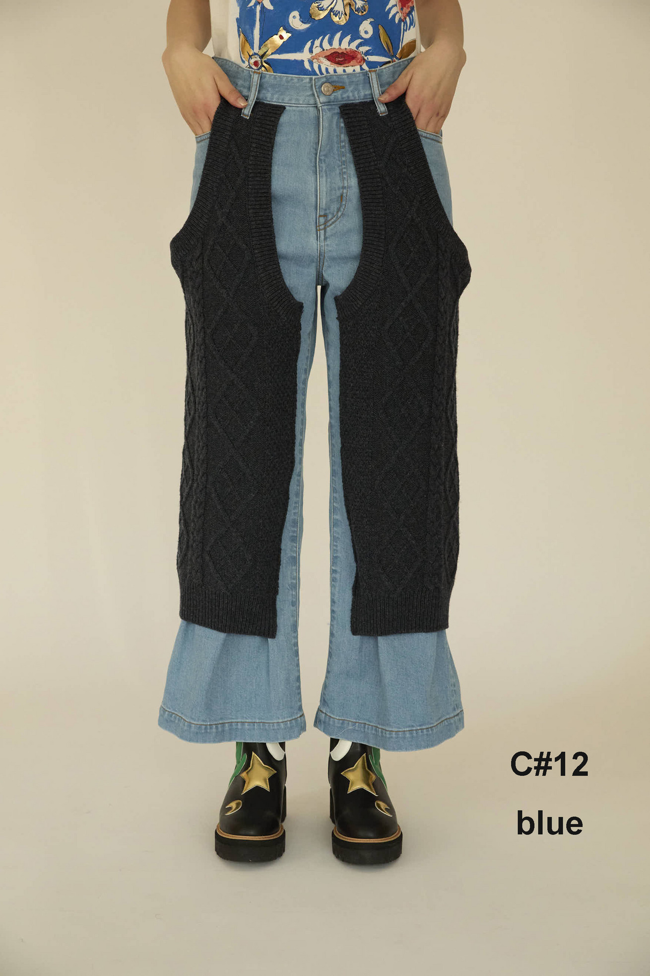 程よいストレッチの入った11ozのデニムをニットと組み合わせたウエスタンライクパンツ。 デニムの生産地である岡山県児島で作っています。 縄の網目のような柄を編み込んだニットは、ウール100%のウォッシャブルウールを使用しているため、家庭での洗濯が可能です。 ケア方法:手洗い可能 ※着用モデル身長:170cm ※着用サイズ: 2(M)