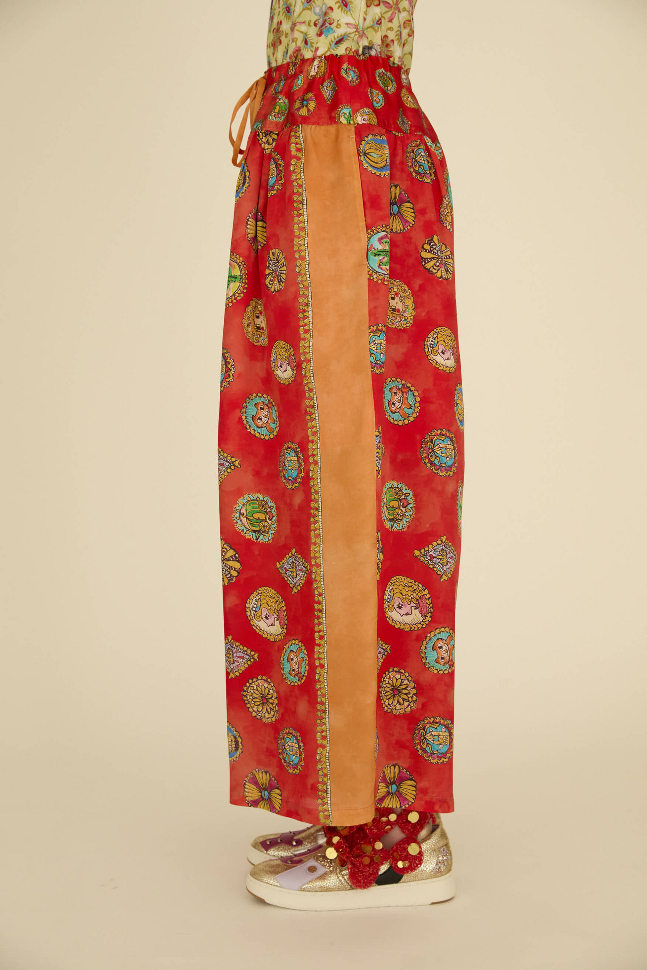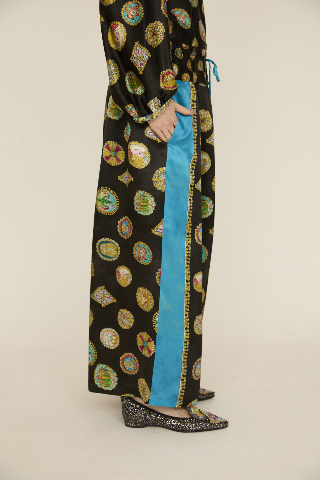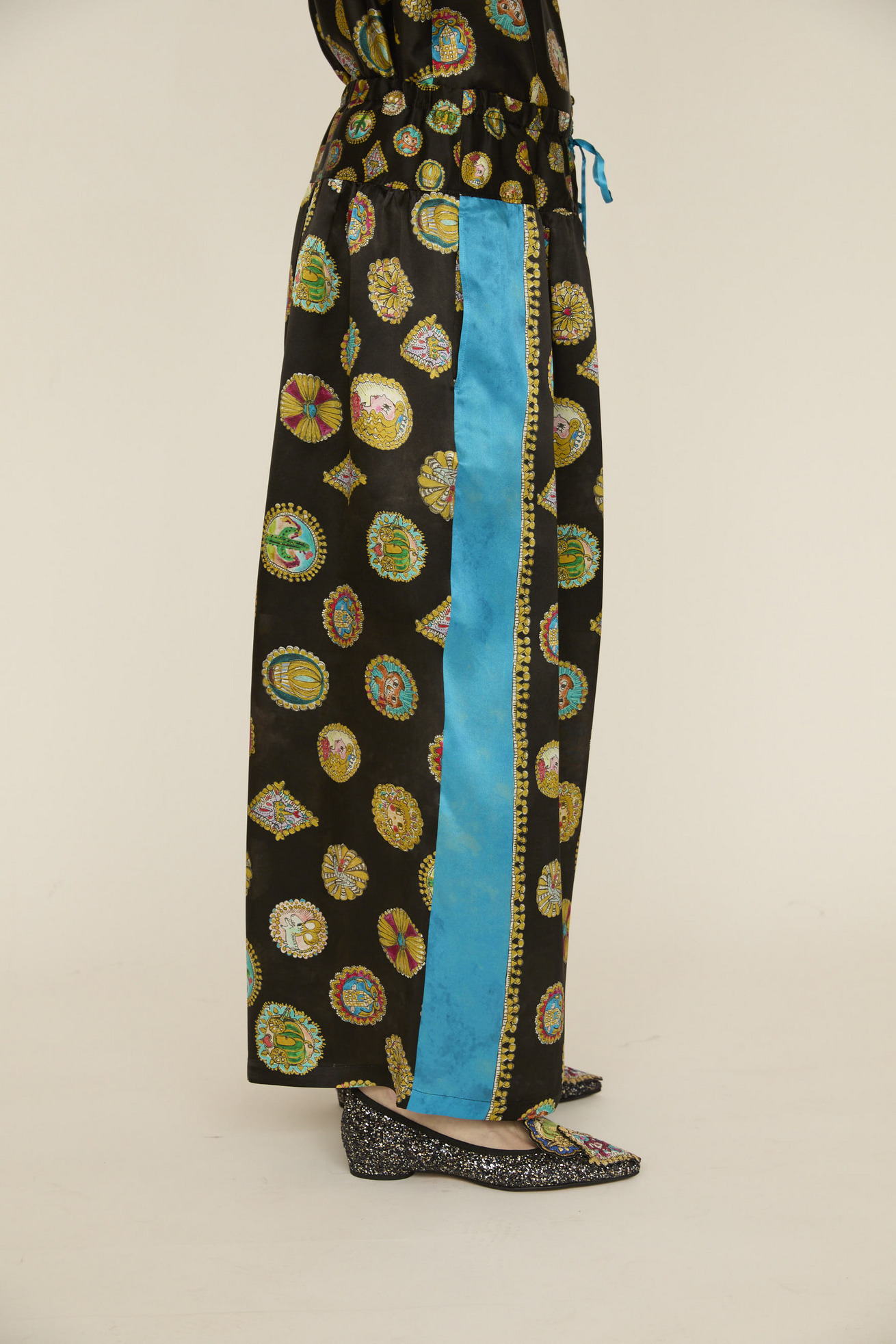 シルクサテンの光沢感がリッチな印象のワイドパンツです。 ウエストの切り替え部分にギャザーを入れて、動くたびにゆらゆらと揺れるシルエットが特徴です。 サイドに合わせた無地のラインがアクセントになっています。 紐には三角モチーフをプラスしています。 ※プリントのモチーフの出方は商品により異なります。モチーフの出方はお選びいただけませんので、予めご了承ください。 〈Concho print〉 丁寧で細かいタッチで描かれたたくさんのコンチョ。プリンセスの横顔、ねこ、サボテン、ネズミ、お城、ガラスの靴、気球、かぼちゃの馬車など、見れば見るほどかわいいコンチョたちをドット柄にしました。 ベース部分のやわらかな水彩タッチのボカシとライン上に入っているアクセントカラーもポイントです。 コンチョはネイティブアメリカンがインディアンジュエリーの装飾として使用していたボタンが起源になっています。シンデレラのストーリーやキャラクターに、ウエ スタン要素もMIXした装飾的で楽しいTSUMORI CHISATOワールドを表現しました。 滑らかで光沢感のあるシルクサテンに中国でプリントしています。 ケア方法:ドライクリーニング ※着用モデル身長: C/#21red:174cm C/#26 black:170cm 173cm ※着用サイズ: 2(M) ※当サイトの商品は実店舗と在庫を共有しており、ご注文完了後に商品を確保できない場合がございます。 その際、改めてキャンセルまたは数量変更のメールをお送りいたします。何卒ご了承いただけますと幸いです。