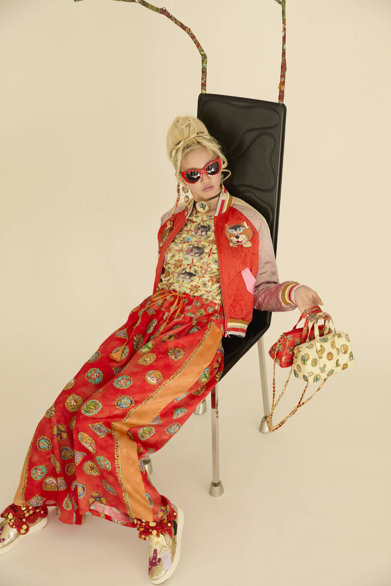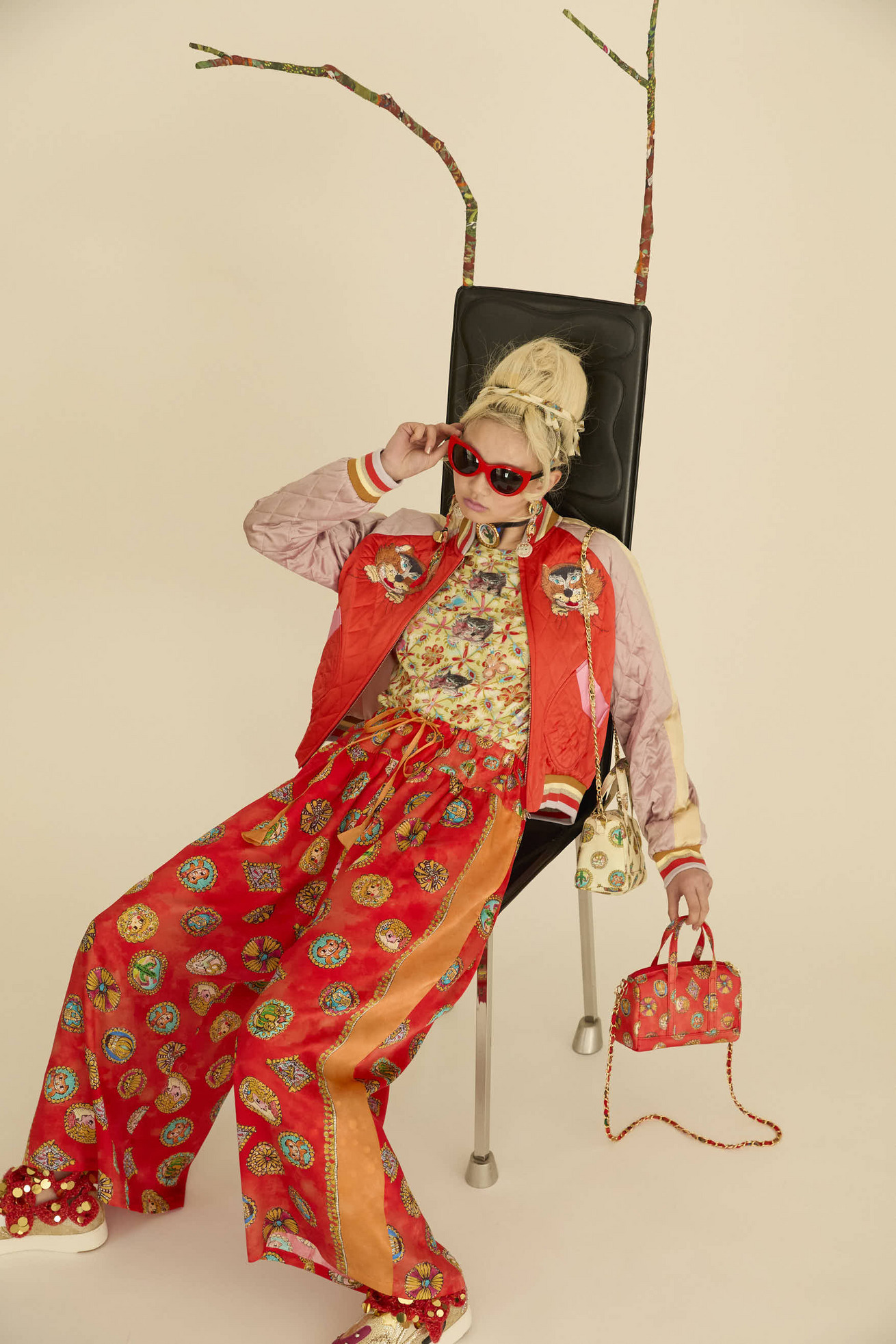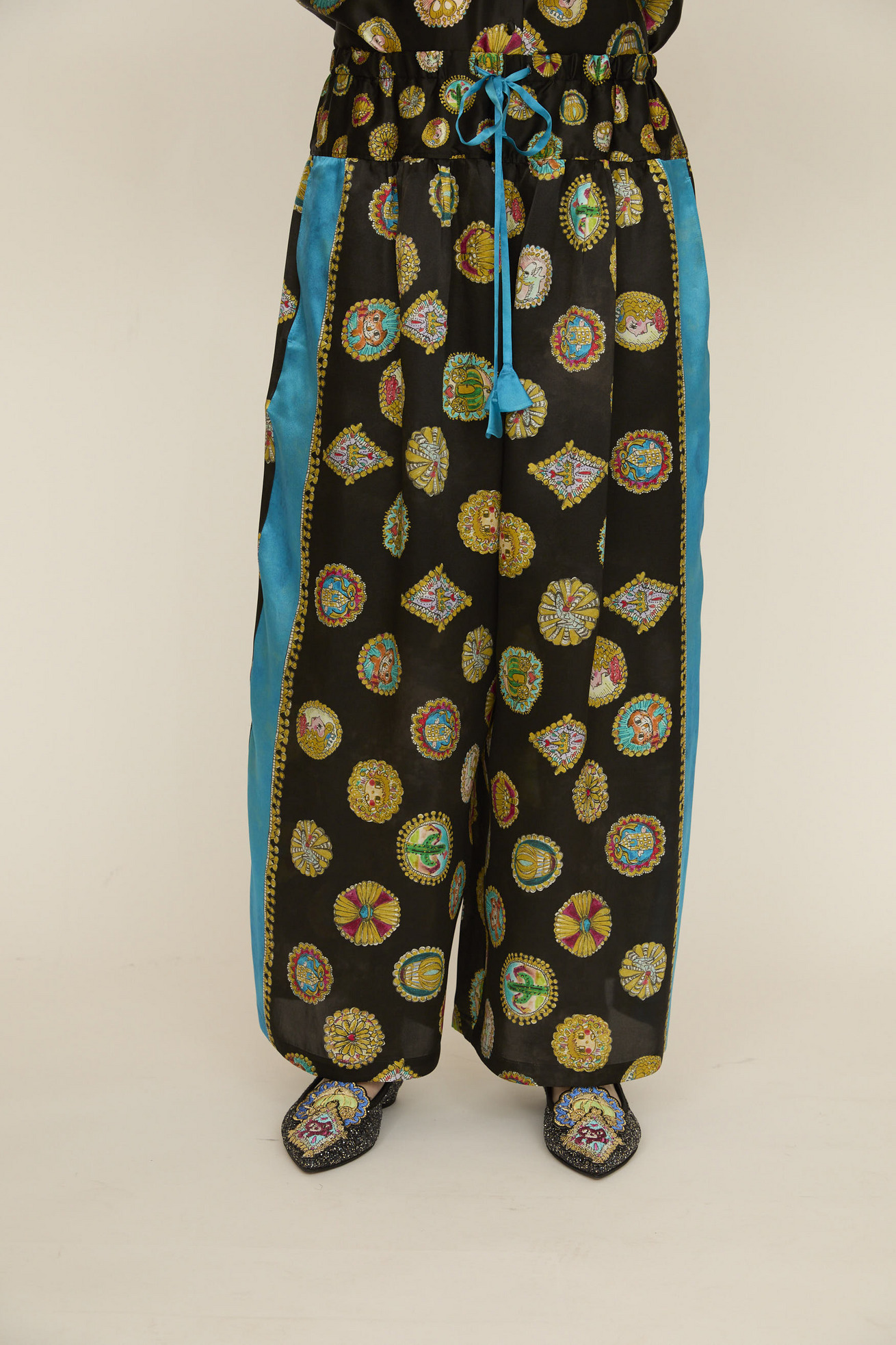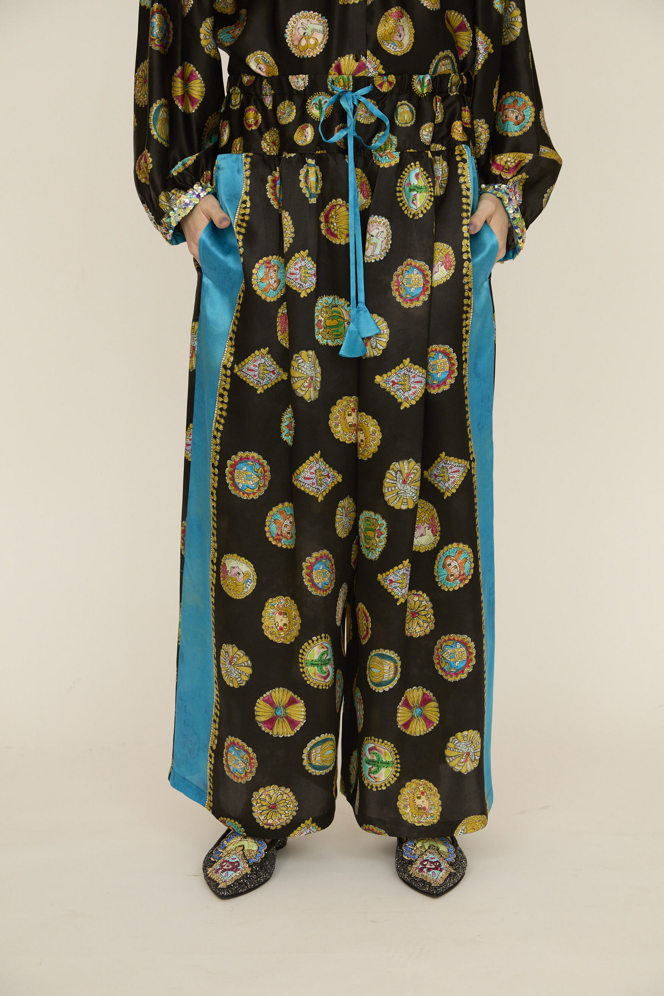 シルクサテンの光沢感がリッチな印象のワイドパンツです。 ウエストの切り替え部分にギャザーを入れて、動くたびにゆらゆらと揺れるシルエットが特徴です。 サイドに合わせた無地のラインがアクセントになっています。 紐には三角モチーフをプラスしています。 ※プリントのモチーフの出方は商品により異なります。モチーフの出方はお選びいただけませんので、予めご了承ください。 〈Concho print〉 丁寧で細かいタッチで描かれたたくさんのコンチョ。プリンセスの横顔、ねこ、サボテン、ネズミ、お城、ガラスの靴、気球、かぼちゃの馬車など、見れば見るほどかわいいコンチョたちをドット柄にしました。 ベース部分のやわらかな水彩タッチのボカシとライン上に入っているアクセントカラーもポイントです。 コンチョはネイティブアメリカンがインディアンジュエリーの装飾として使用していたボタンが起源になっています。シンデレラのストーリーやキャラクターに、ウエ スタン要素もMIXした装飾的で楽しいTSUMORI CHISATOワールドを表現しました。 滑らかで光沢感のあるシルクサテンに中国でプリントしています。 ケア方法:ドライクリーニング ※着用モデル身長: C/#21red:174cm C/#26 black:170cm 173cm ※着用サイズ: 2(M) ※当サイトの商品は実店舗と在庫を共有しており、ご注文完了後に商品を確保できない場合がございます。 その際、改めてキャンセルまたは数量変更のメールをお送りいたします。何卒ご了承いただけますと幸いです。