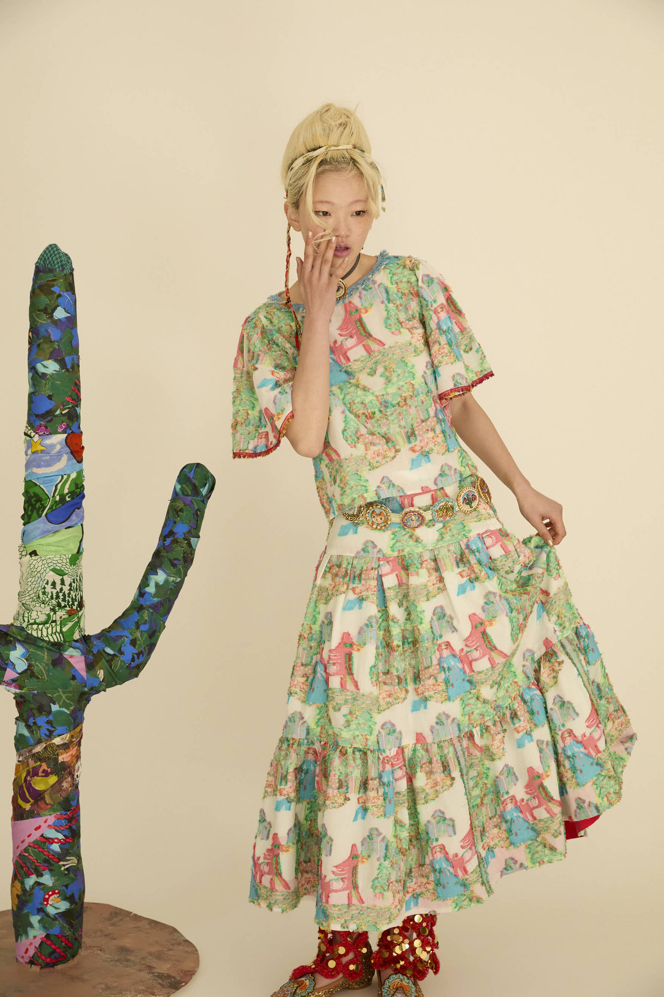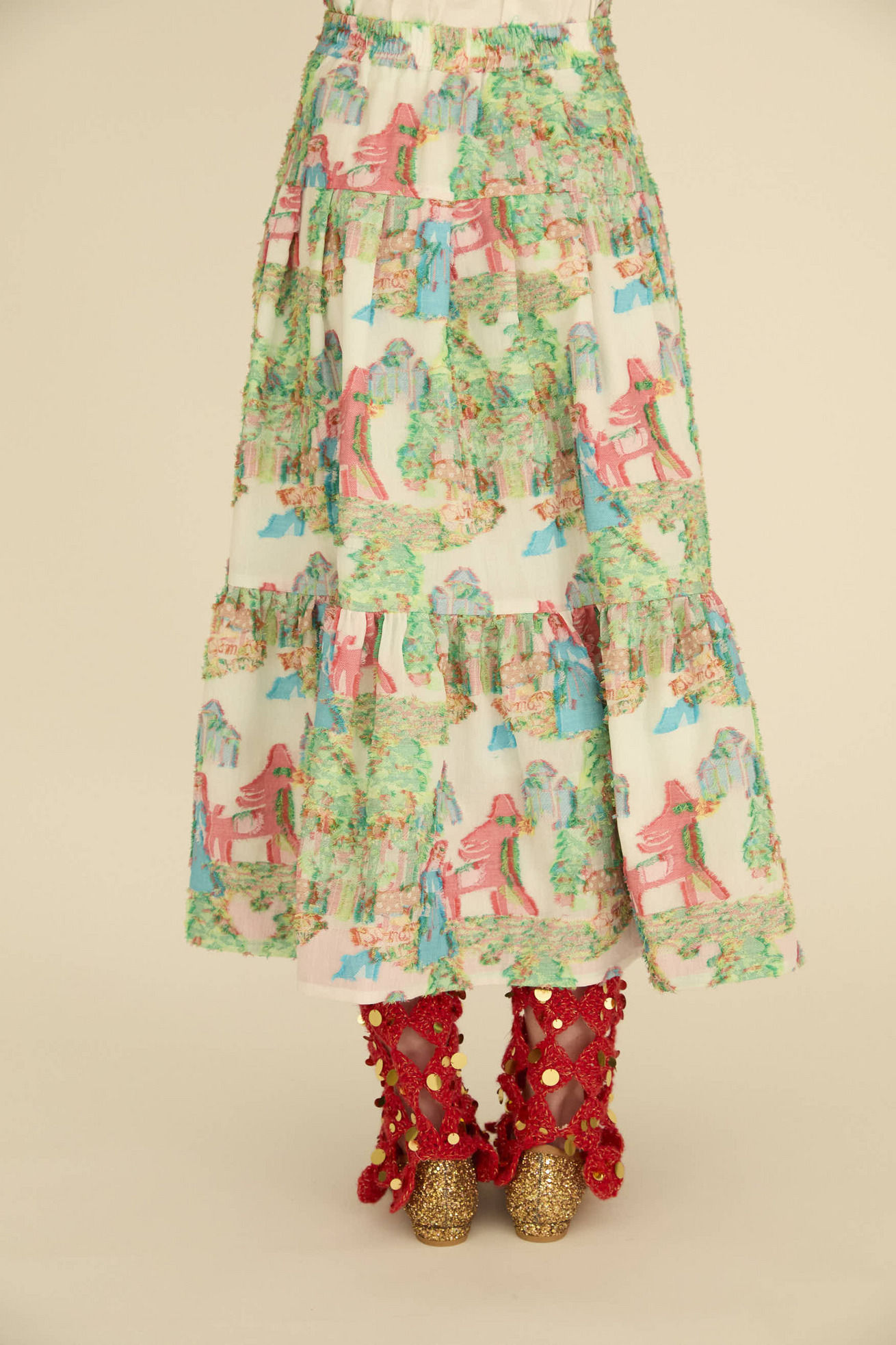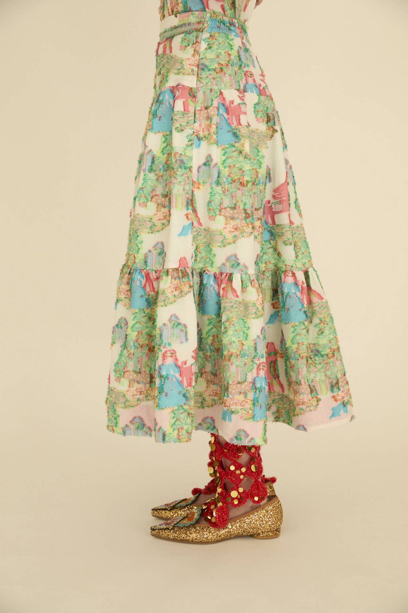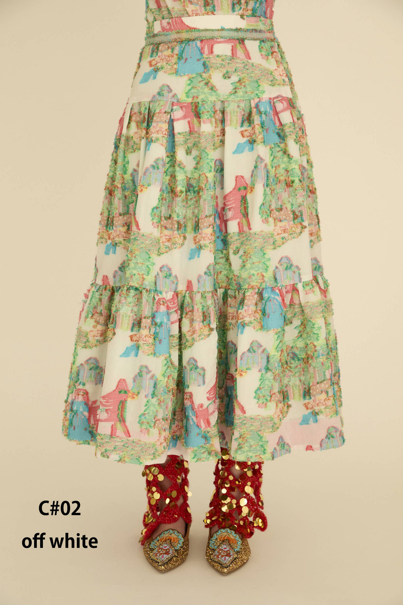 オリジナルのジャガード生地をたっぷり使った三段切り替えのロングスカートです。 タックを入れてふんわりとさせたシルエットは広がりすぎず、甘くなり過ぎずにご利用いただけます。 生地が柔らかく、履き心地の軽いアイテムです。 今シーズンのテーマである、シンデレラの物語に入り込んだようなメルヘンな雰囲気をお楽しみください。 後ろゴム仕様、サイドファスナー有り。 〈Forest Princess JQ〉 森の木々やサボテン、きのこや馬、プリンセス、お城などのモチーフをカットジャカードで表現しました。よく見るとTSUMORI CHISATOの文字も織り込まれています。シンデレラとウエスタンをミックスしたTSUMORI CHISATOのForest princess jaquard. たくさんの緯糸を織り込んで、手作業でカットをすることにより柄を出しています。コットン100%の優しい肌触りが特徴です。 1メートルを織るのに2時間かかる、とても手の込んだ生地です。群馬県桐生市で織っています。 ケア方法:手洗い可能 ※着用モデル身長:174cm ※着用サイズ: 2(M) ※当サイトの商品は実店舗と在庫を共有しており、ご注文完了後に商品を確保できない場合がございます。 その際、改めてキャンセルまたは数量変更のメールをお送りいたします。何卒ご了承いただけますと幸いです。