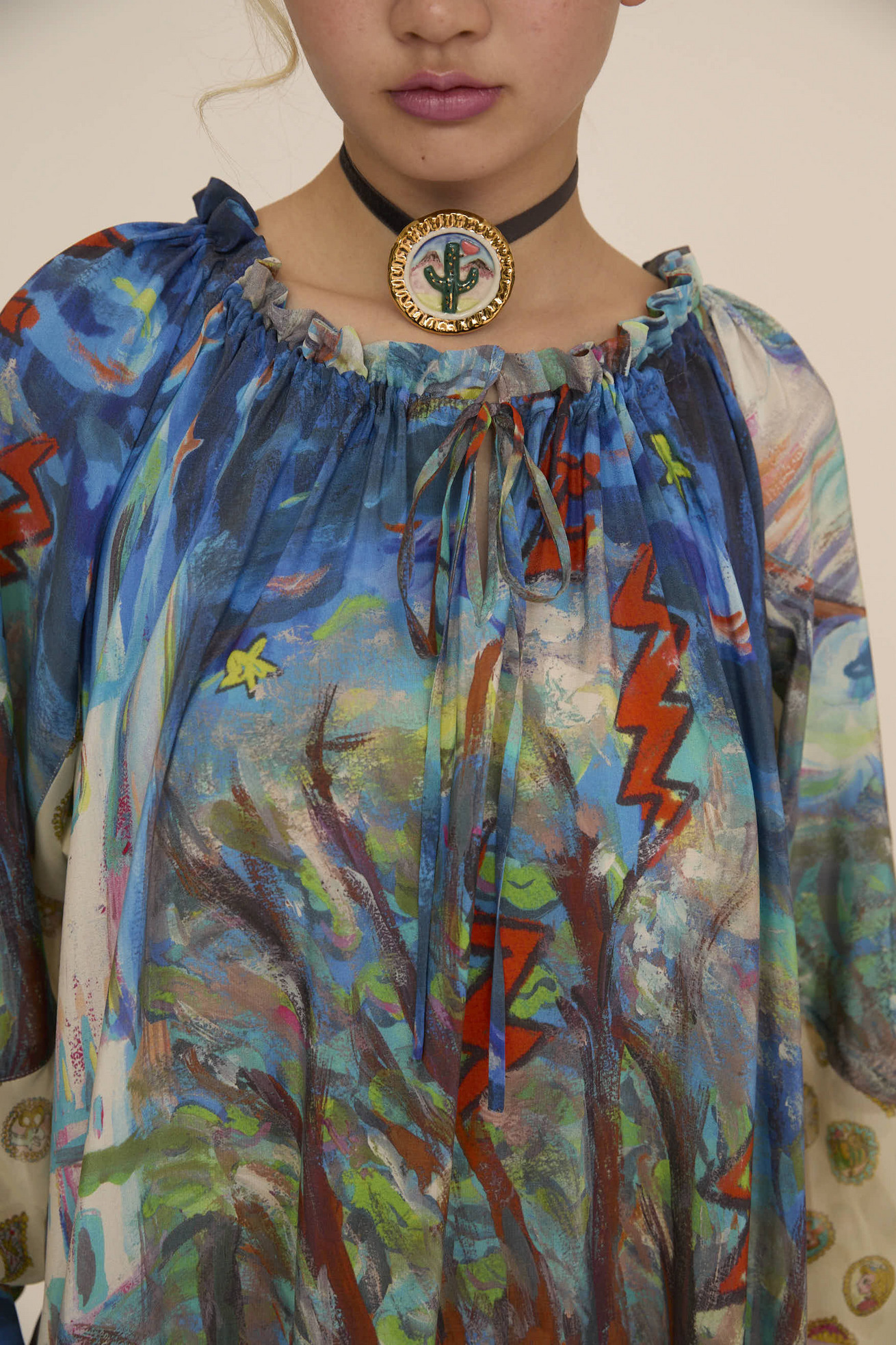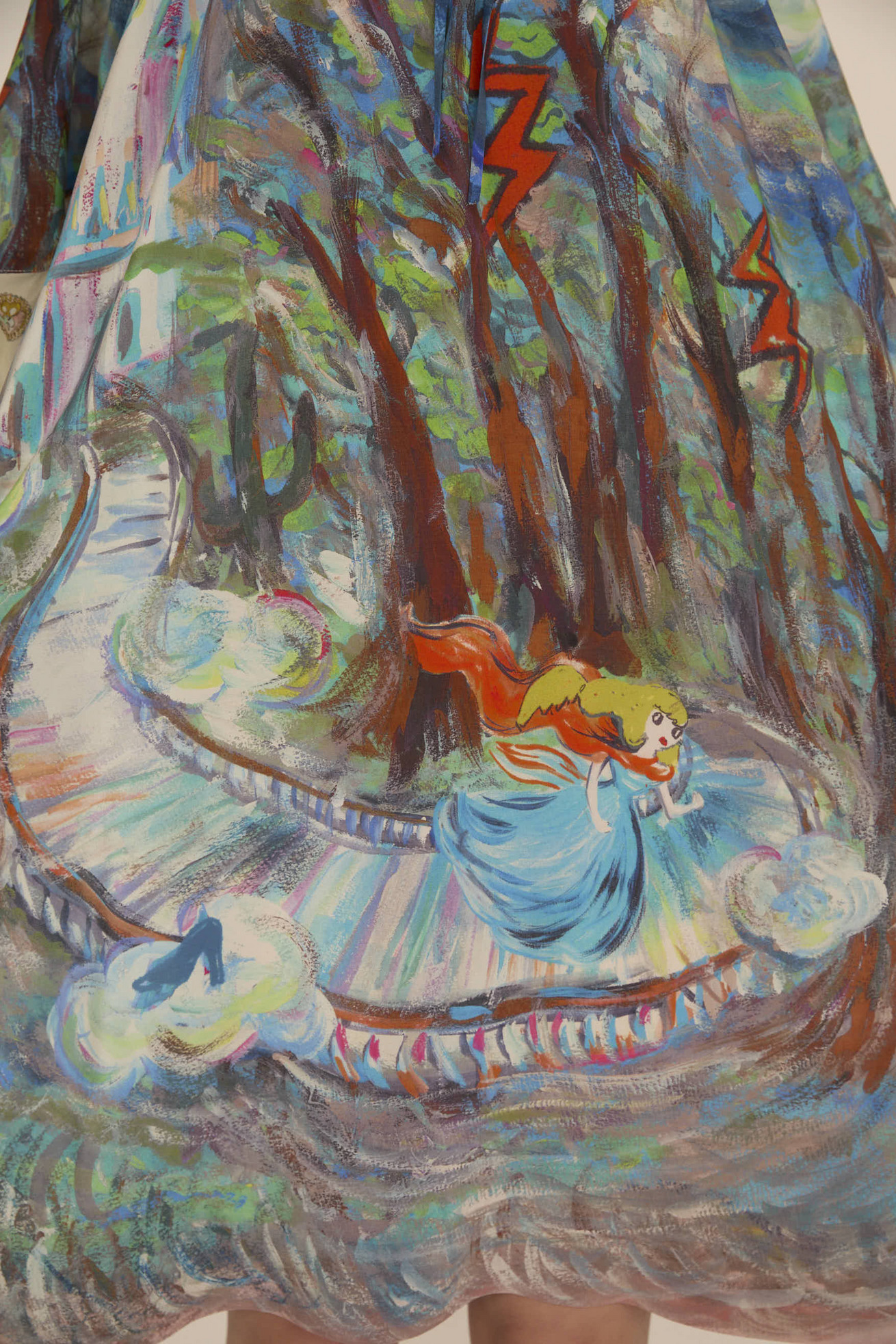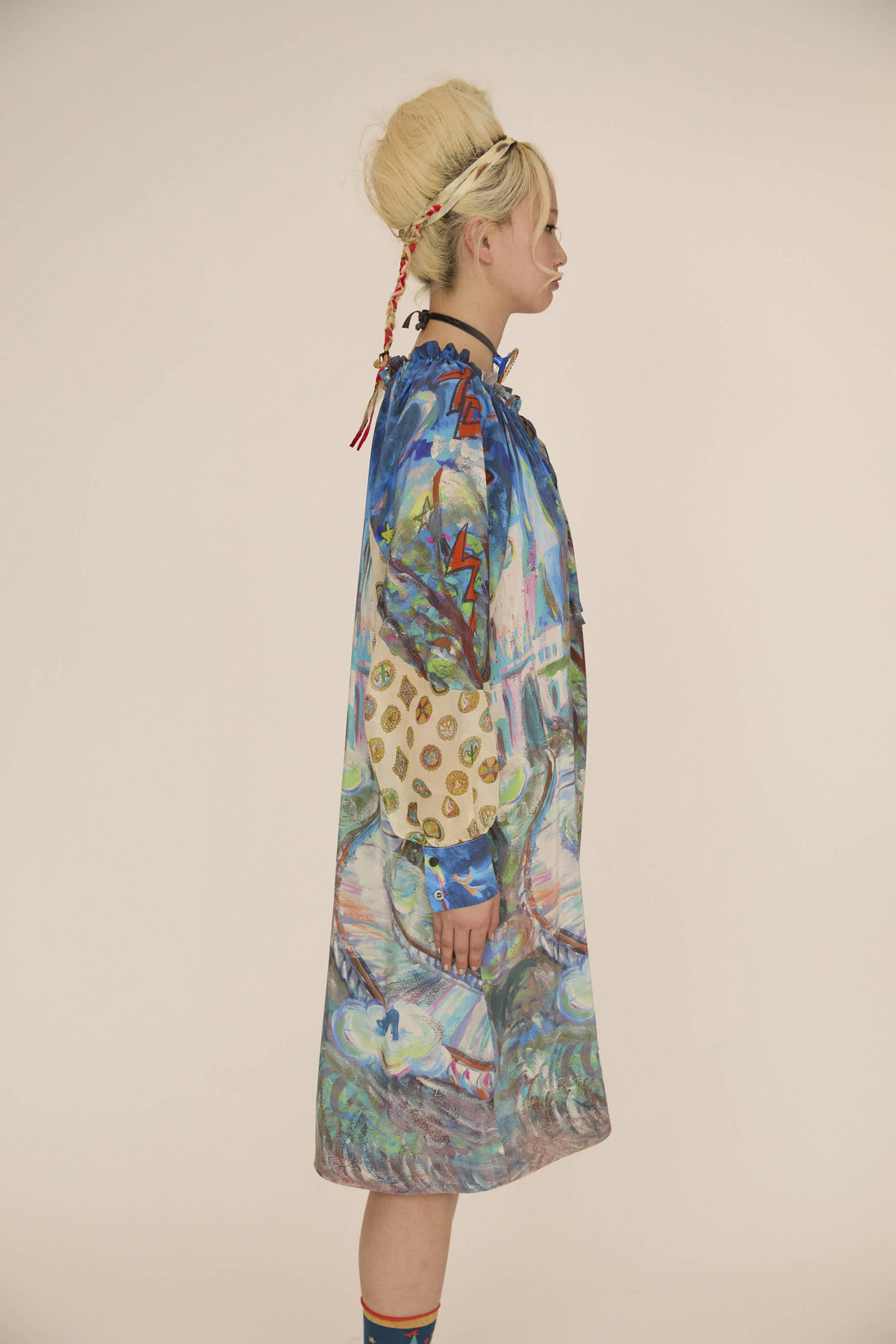 Midnight princessとConcho printを合わせた定番のワンピース。 生地をたっぷり使い、ゆったりとしたシルエットとドレープがキレイなアイテムでです。シルクの軽さと程よい光沢感がリッチな印象に。 襟ぐりのヒモで開きを調整可能。 <Midnight princess silk> プリンセスがお城から駆け降りていく様子を自由なタッチで描き、そのままインクジェットプリントで表現しました。12時を指すお城の時計台、階段を駆け降りるプリンセス、TCの文字になっている雷、雲の上に片方のガラスの靴、踊っているような木々やサボテン、、、絵の具が混ざり合ってできた偶然の色とタッチがポイントです。 滑らかな落ち感と光沢感のあるシルクデシンに京都でインクジェットプリントをしています。 〈Concho print〉 丁寧で細かいタッチで描かれたたくさんのコンチョ。プリンセスの横顔、ねこ、サボテン、ネズミ、お城、ガラスの靴、気球、かぼちゃの馬車など、見れば見るほどかわいいコンチョたちをドット柄にしました。 ライン上に入っているアクセントカラーもポイントです。コンチョはネイティブアメリカンがインディアンジュエリーの装飾として使用していたボタンが起源になっています。シンデレラのストーリーやキャラクターに、ウエ スタン要素もMIXした装飾的で楽しいTSUMORI CHISATOワールドを表現しました。 ケア方法:ドライクリーニング ※着用モデル身長:174cm ※着用サイズ: 2(M) ※当サイトの商品は実店舗と在庫を共有しており、ご注文完了後に商品を確保できない場合がございます。 その際、改めてキャンセルまたは数量変更のメールをお送りいたします。何卒ご了承いただけますと幸いです。