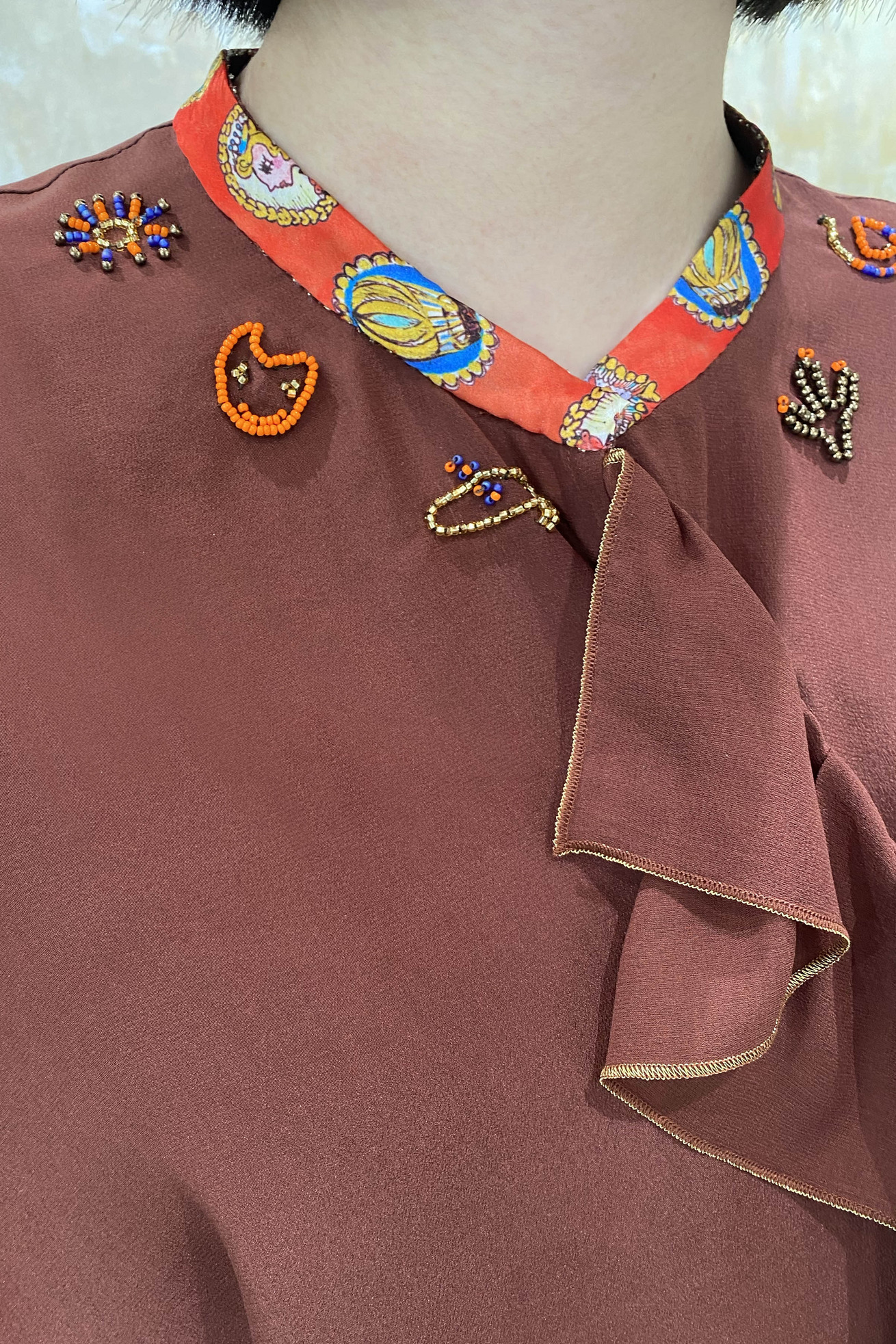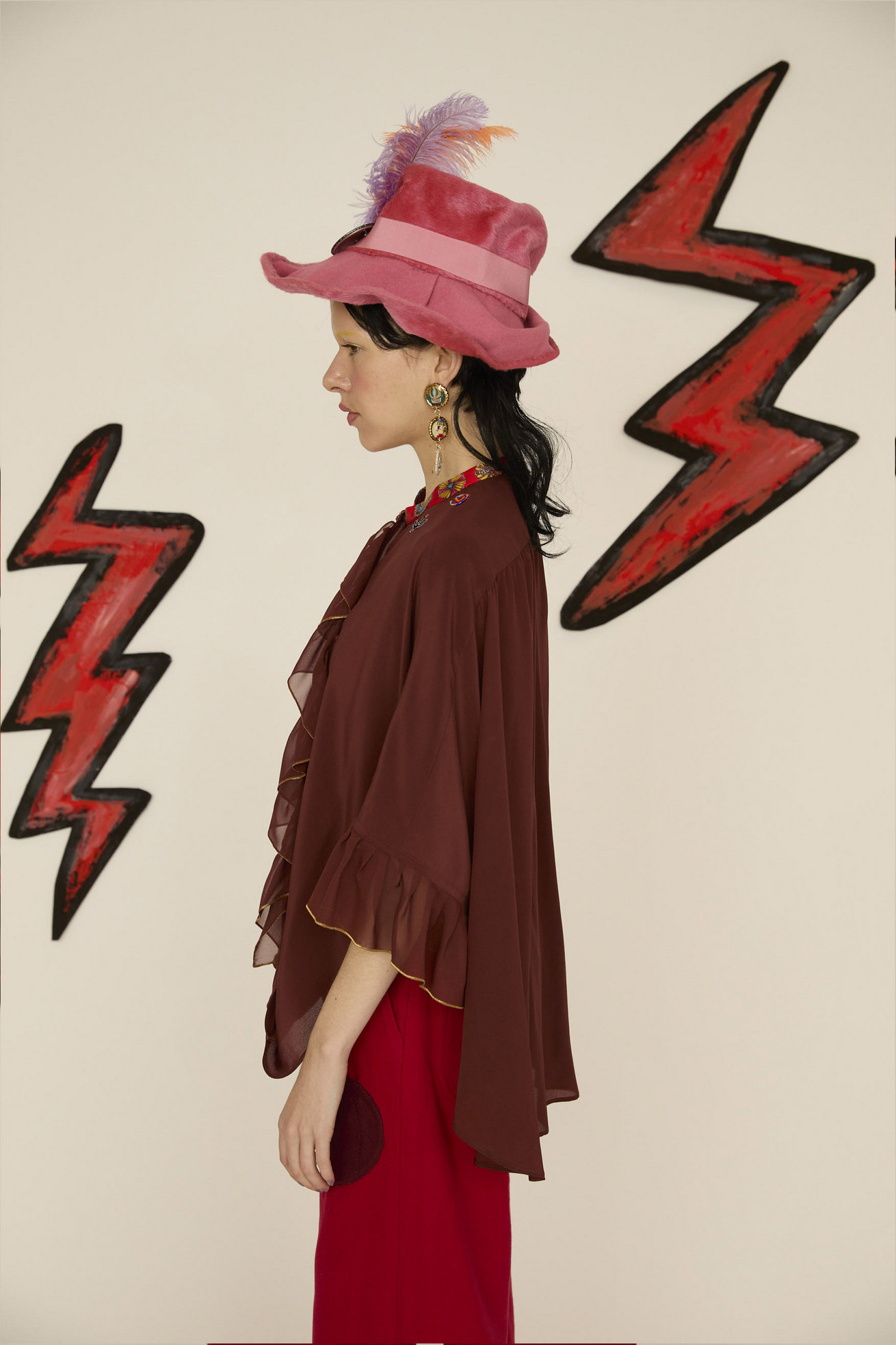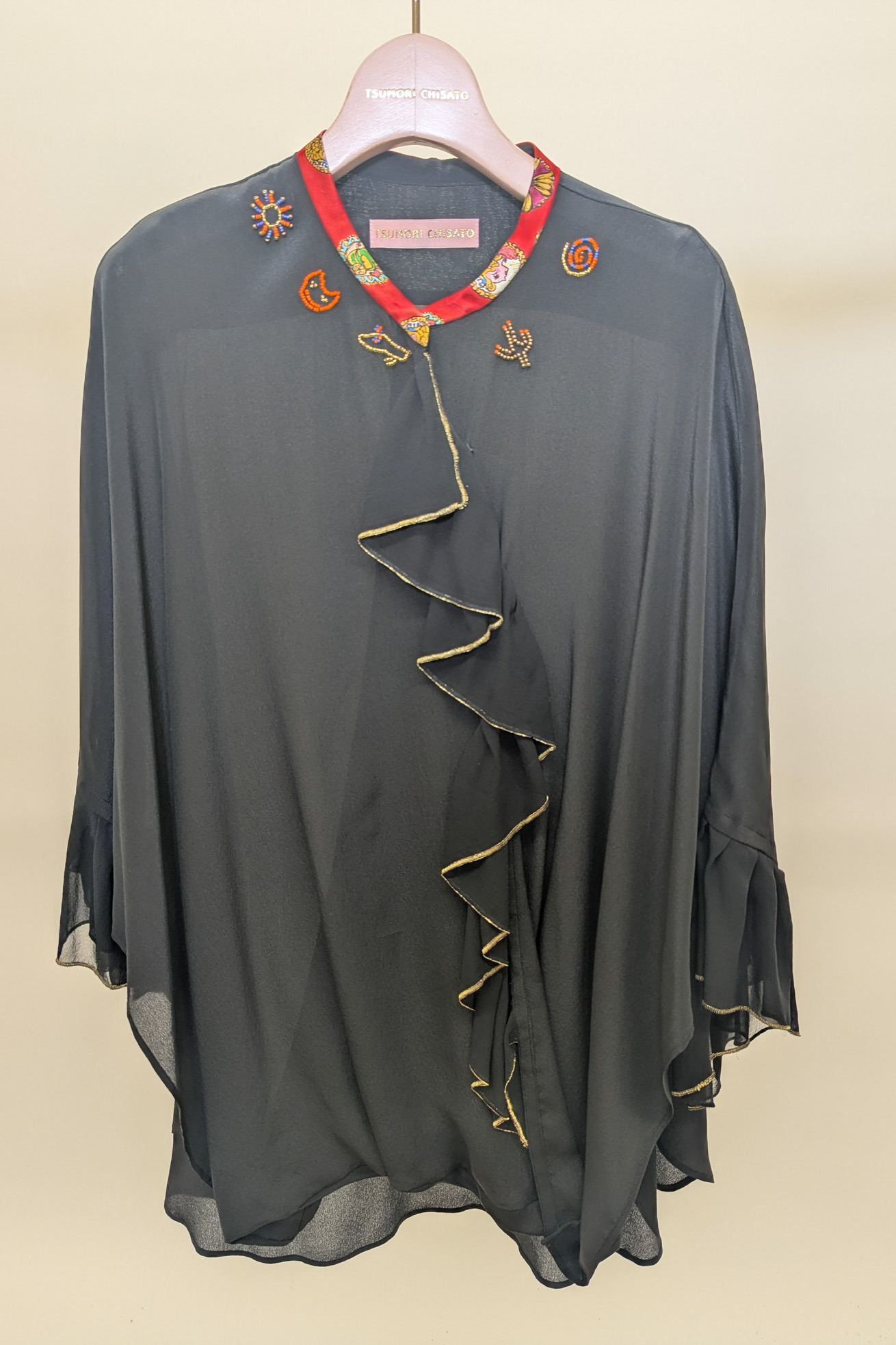 襟周りのパイピング、フリルのゴールド糸を使用したメロー加工がアクセントの前開きブラウスです。 表面に細かく繊細なシボがあり透けにくいシルクデシンを使用し、なめらかで上品なアイテムです。 ケア方法:ドライクリーニング ※着用モデル身長:173cm ※着用サイズ: 2(M) ※当サイトの商品は実店舗と在庫を共有しており、ご注文完了後に商品を確保できない場合がございます。 その際、改めてキャンセルまたは数量変更のメールをお送りいたします。何卒ご了承いただけますと幸いです。