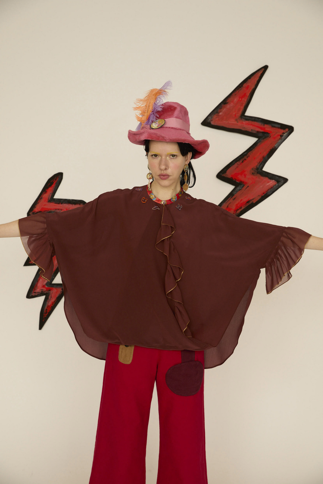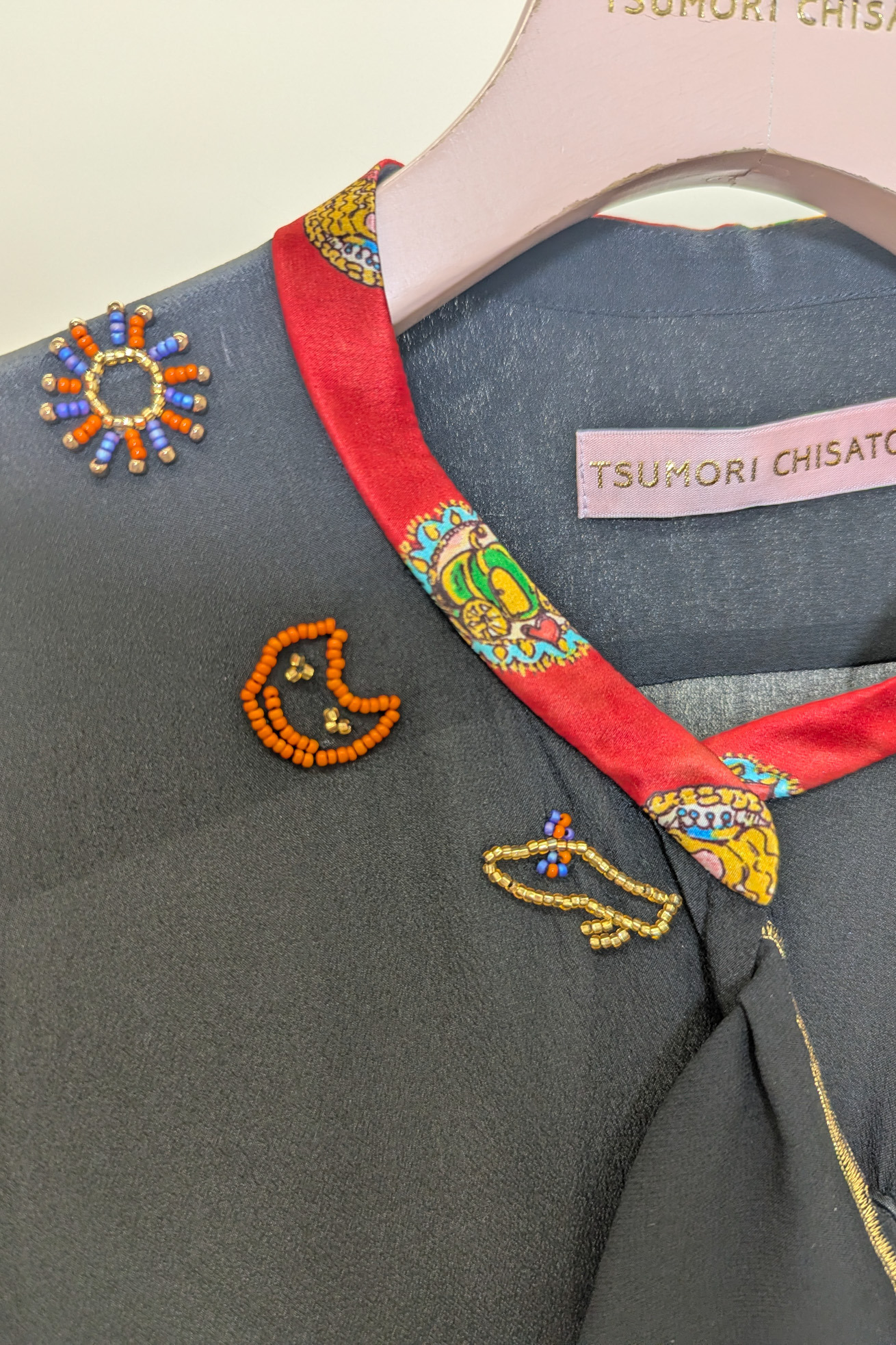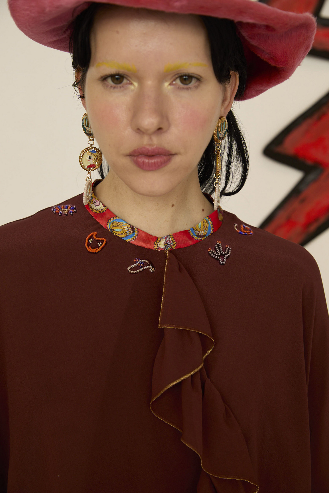 襟周りのパイピング、フリルのゴールド糸を使用したメロー加工がアクセントの前開きブラウスです。 表面に細かく繊細なシボがあり透けにくいシルクデシンを使用し、なめらかで上品なアイテムです。 ケア方法:ドライクリーニング ※着用モデル身長:173cm ※着用サイズ: 2(M) ※当サイトの商品は実店舗と在庫を共有しており、ご注文完了後に商品を確保できない場合がございます。 その際、改めてキャンセルまたは数量変更のメールをお送りいたします。何卒ご了承いただけますと幸いです。