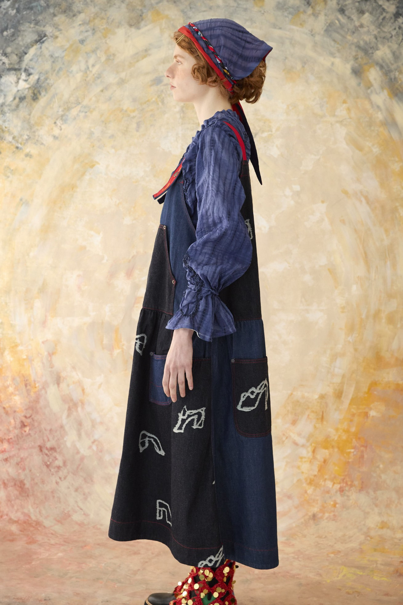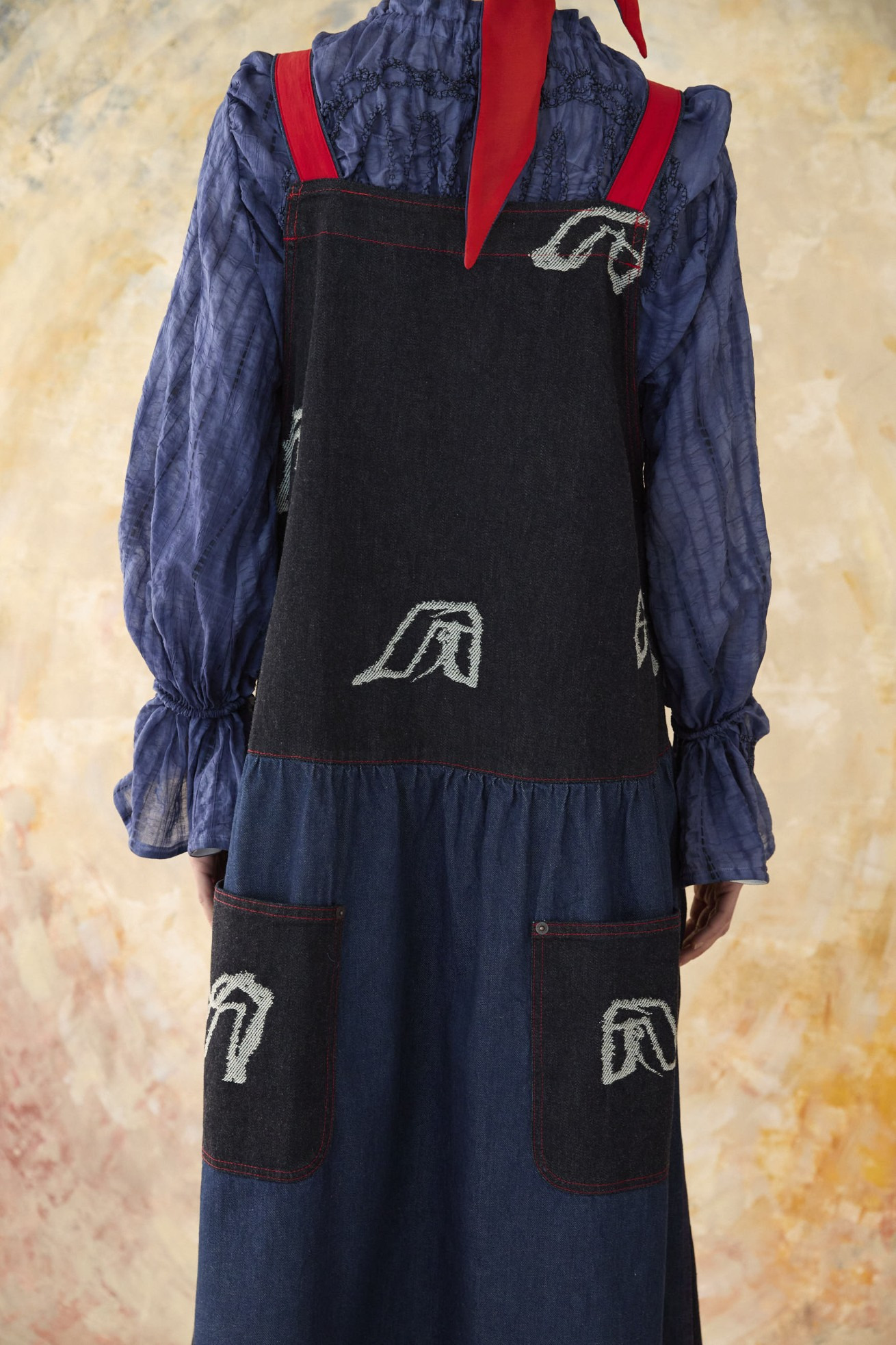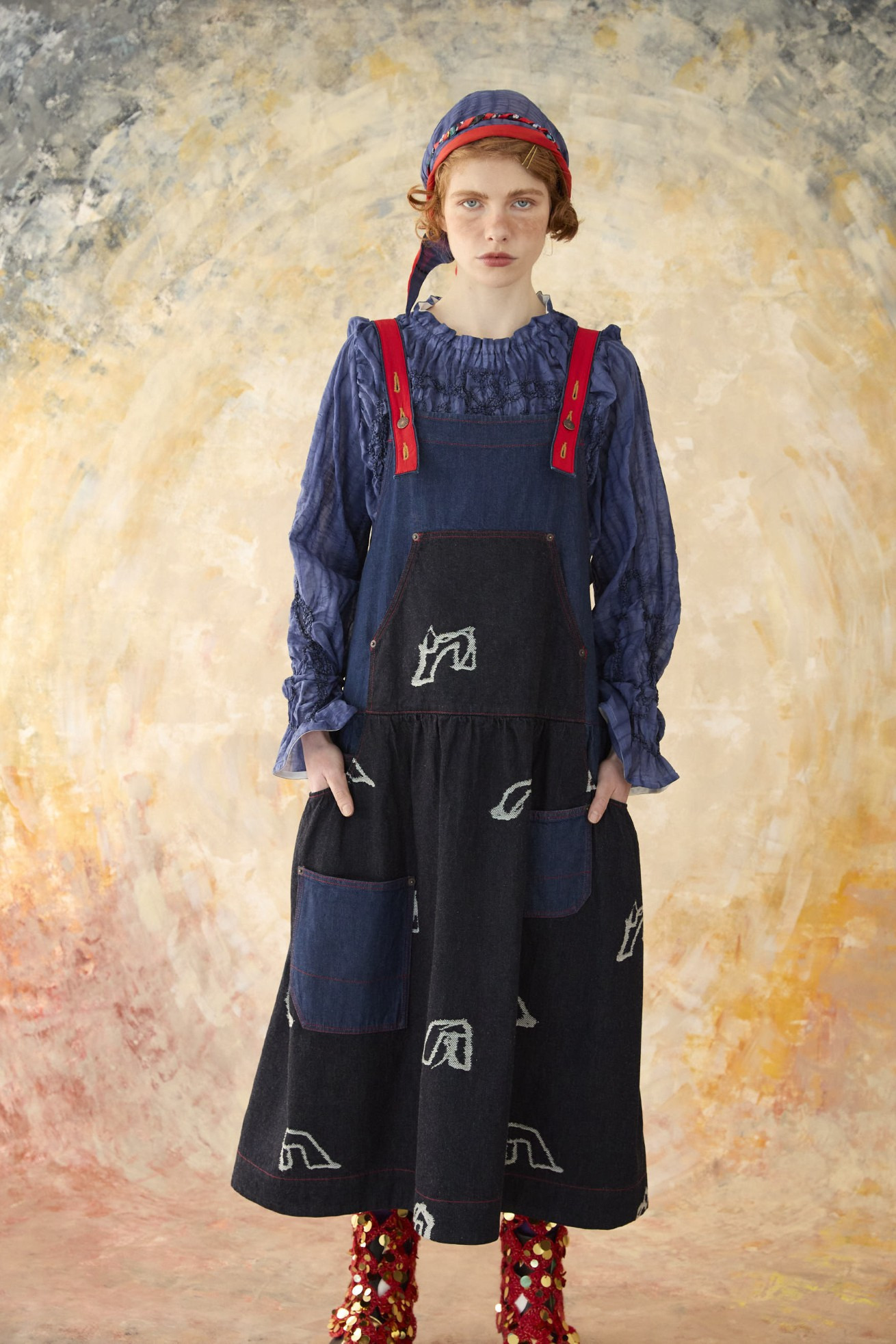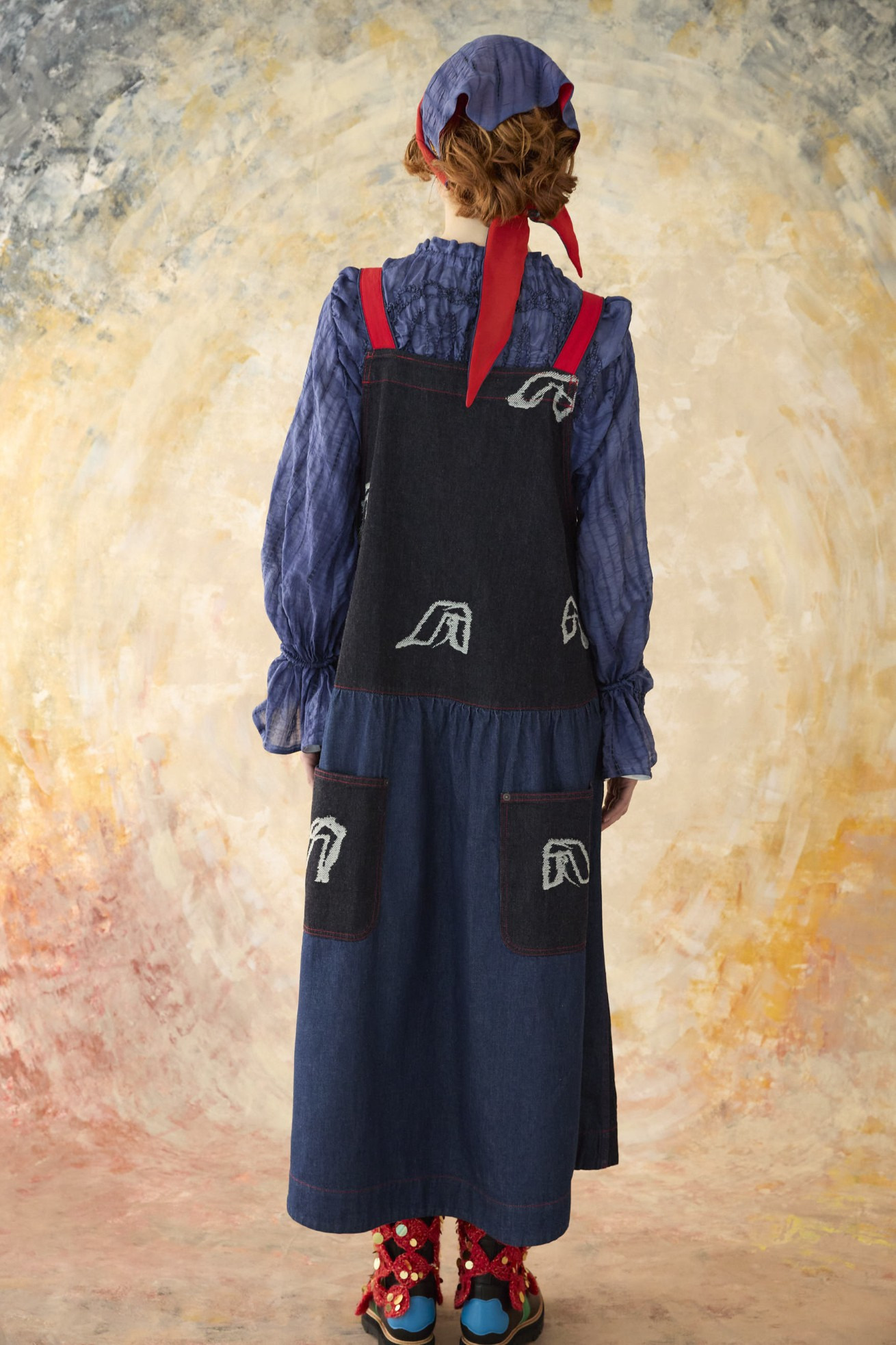 オリジナル生地をミックスしたオーバーシルエットのジャンパースカートです。 前後で5つのポケット、赤いステッチワークと配色がアクセントになっています。 肩紐はボタンで調整可能です。 〈 Glass slippers JQ denim〉 プリンセスが忘れていったガラスの靴をオリジナルのデニムジャカードにしました。 大胆で自由なタッチで描いた靴を細かくジャカード織で表現しています。 経糸緯糸ともにアメリカ綿を主にした糸を使用し、バルキーさもありながら綺麗さのある表面感に仕上げました。 岡山県井原市で織っています。 ※インディゴ染めのため洗濯時に色が出ます。 濃色は淡い色の洋服と合わせると色移りが発生しますのでご注意ください。 ※生地のモチーフの出方は商品により異なります。モチーフの出方はお選びいただけませんので、予めご了承ください。 ケア方法:手洗い可能 ※着用モデル身長:170cm ※着用サイズ: 2(M) ※当サイトの商品は実店舗と在庫を共有しており、ご注文完了後に商品を確保できない場合がございます。 その際、改めてキャンセルまたは数量変更のメールをお送りいたします。何卒ご了承いただけますと幸いです。