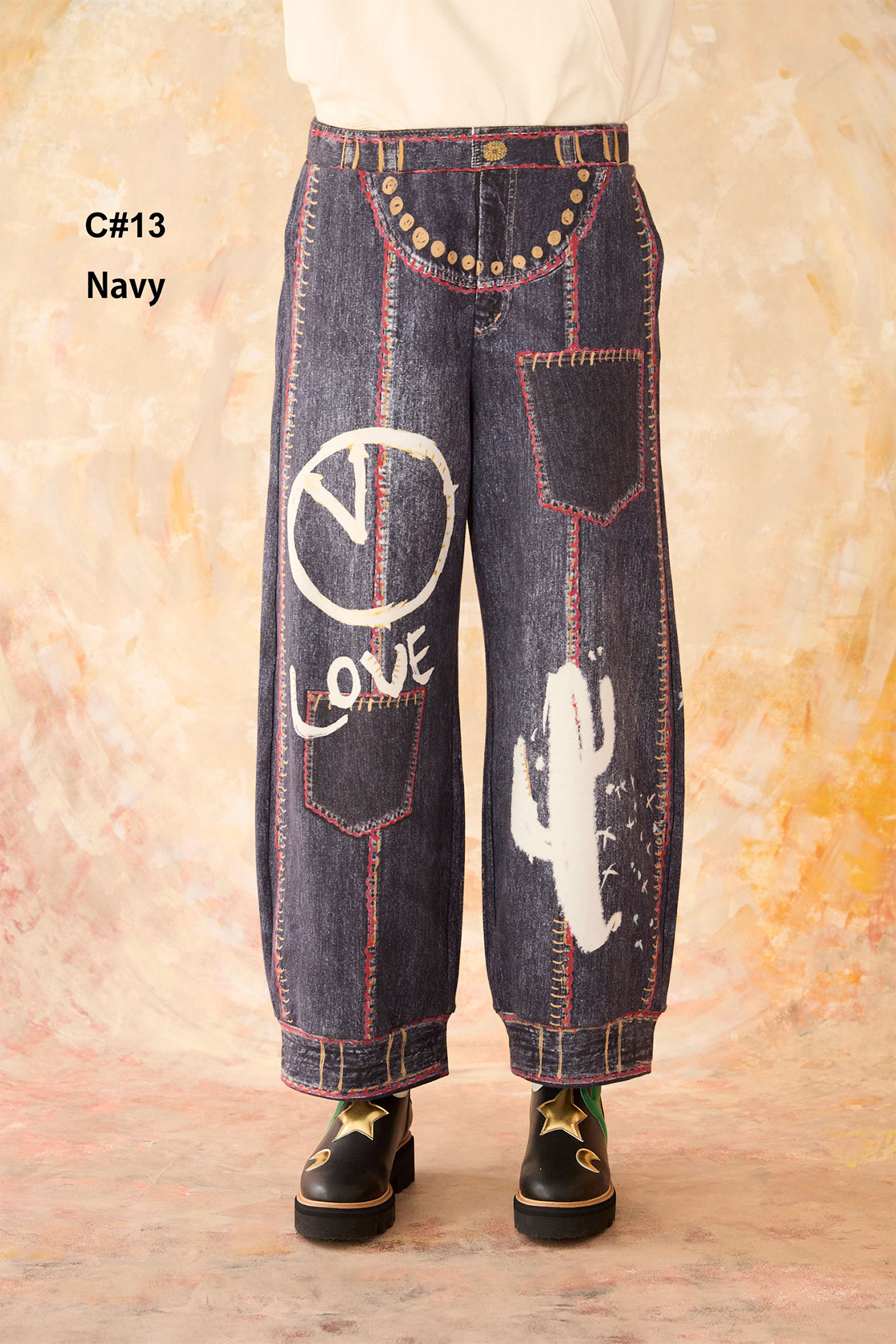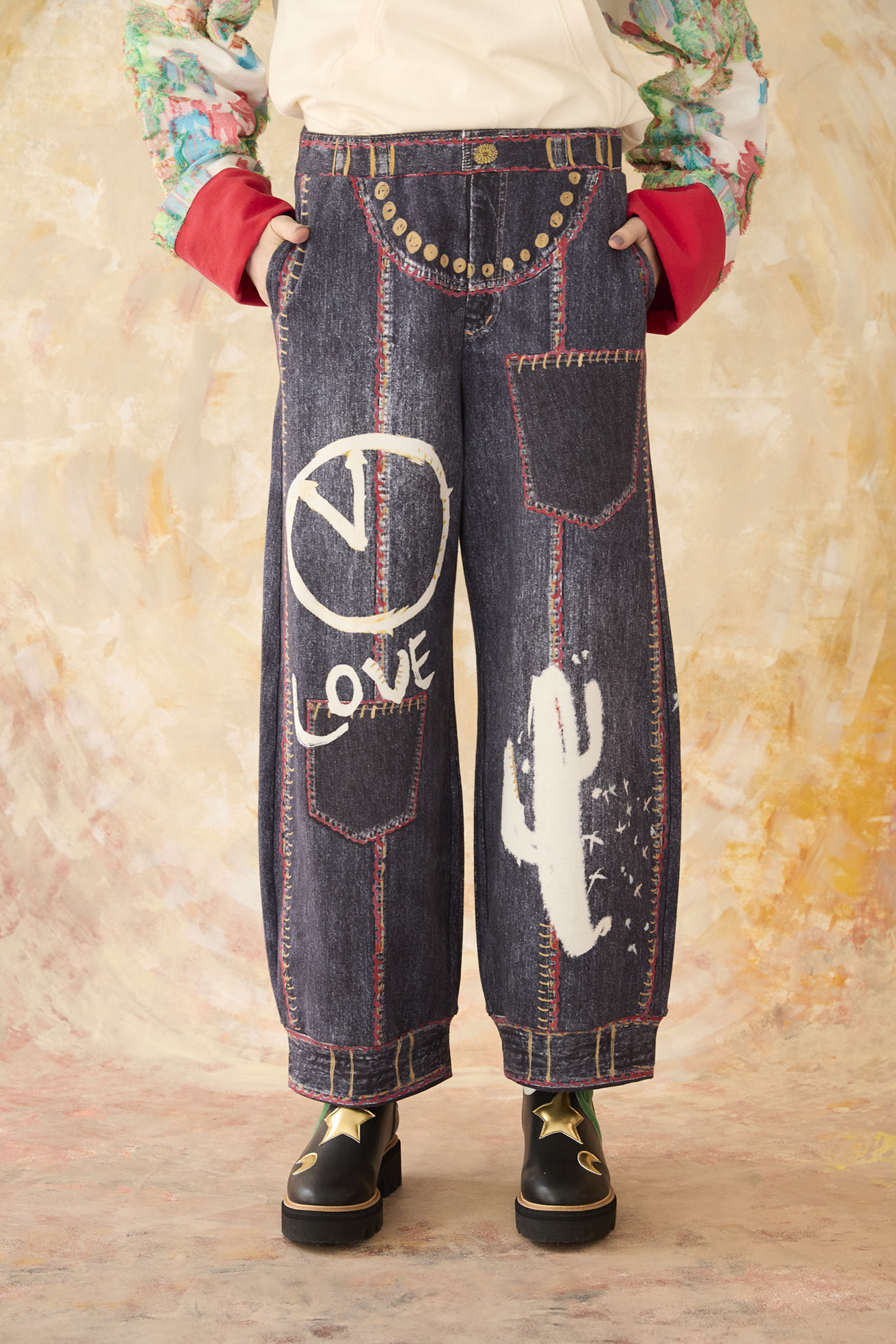 ヴィンテージデニムの風合いをトロンプルイユ風にインクジェットプリントで表現したジョガーパンツ。 フェイクポケット、細かいステッチ、切り替え風のデザインプリントがユニークなアイテムです。手描きタッチの時計、イナズマ、サボテン、ガラスの靴、LOVEの文字もアクセントに。 まるでデニムを履いているかのようなプリントが特徴のアイテムです。 コットン100%の柔らかく伸びのある裏毛生地を使用し、シンプルな形でカジュアルに着れます。両サイド、後ろにはリアルポケット付き。 ケア方法:手洗い可能 ※着用モデル身長: 173cm ※着用サイズ: 2(M) ※当サイトの商品は実店舗と在庫を共有しており、ご注文完了後に商品を確保できない場合がございます。 その際、改めてキャンセルまたは数量変更のメールをお送りいたします。何卒ご了承いただけますと幸いです。
