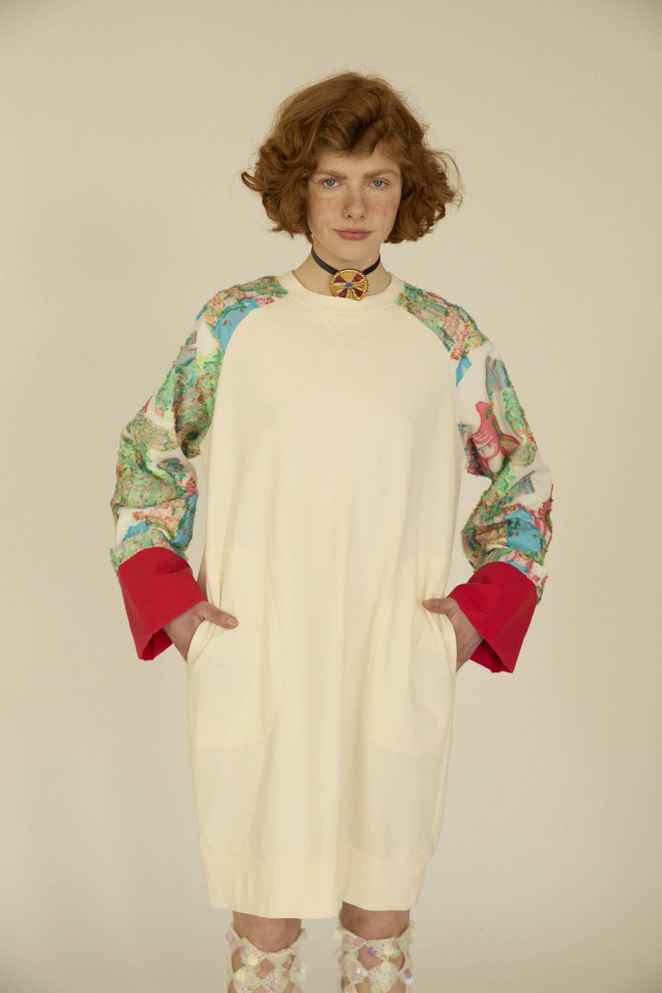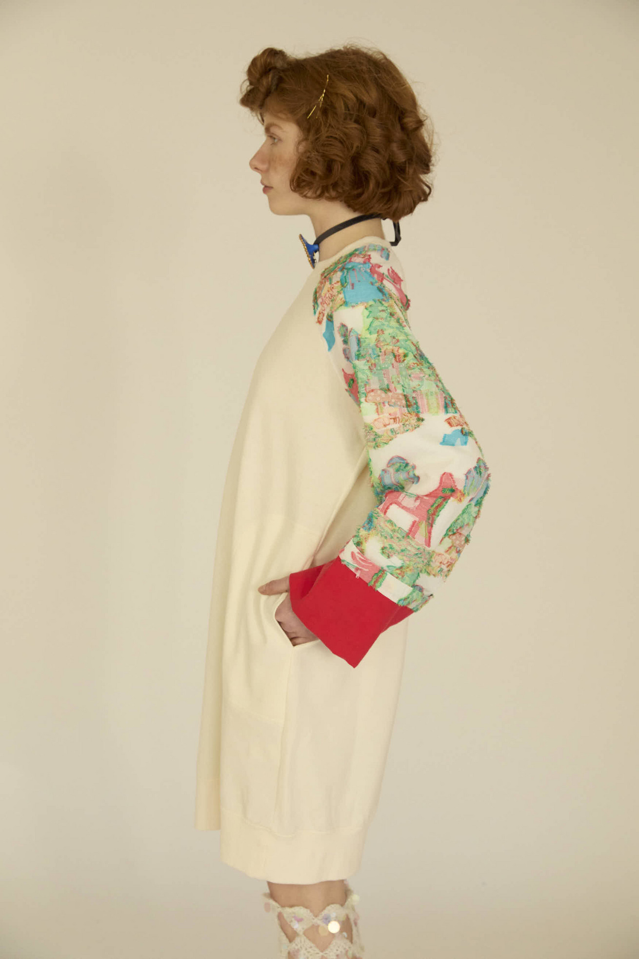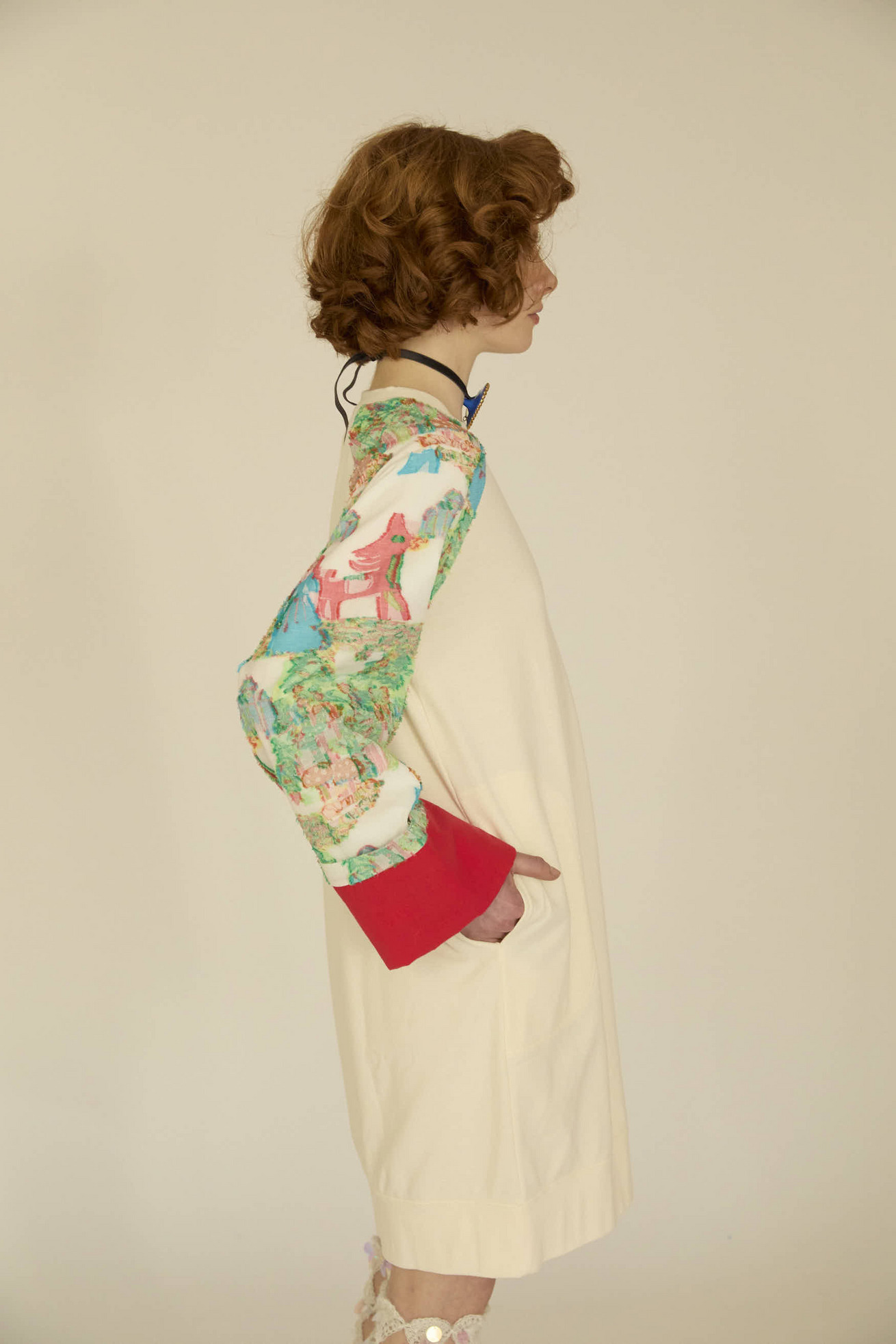 袖にForest Princess JQを使用、身頃にはコットン100%の40/20ミニ裏毛を使用したワンピース。 定番の形をアレンジし、広めの袖幅と折り返してカフス風のデザインが特徴です。 サイドにはスラッシュポケット付き。 〈Forest Princess JQ〉 森の木々やサボテン、きのこや馬、プリンセス、お城などのモチーフをカットジャカードで表現しました。よく見るとTSUMORI CHISATOの文字も織り込まれています。シンデレラとウエスタンをミックスしたTSUMORI CHISATOのForest princess jaquard.たくさんの緯糸を織り込んで、手作業でカットをすることにより柄を出しています。コットン100%の優しい肌触りが特徴です。1メートルを織るのに2時間かかる、とても手の込んだ生地です。 群馬県桐生市で織っています。 ケア方法:手洗い可能 ※着用モデル身長:170cm ※着用サイズ: 2(M) ※当サイトの商品は実店舗と在庫を共有しており、ご注文完了後に商品を確保できない場合がございます。 その際、改めてキャンセルまたは数量変更のメールをお送りいたします。何卒ご了承いただけますと幸いです。
