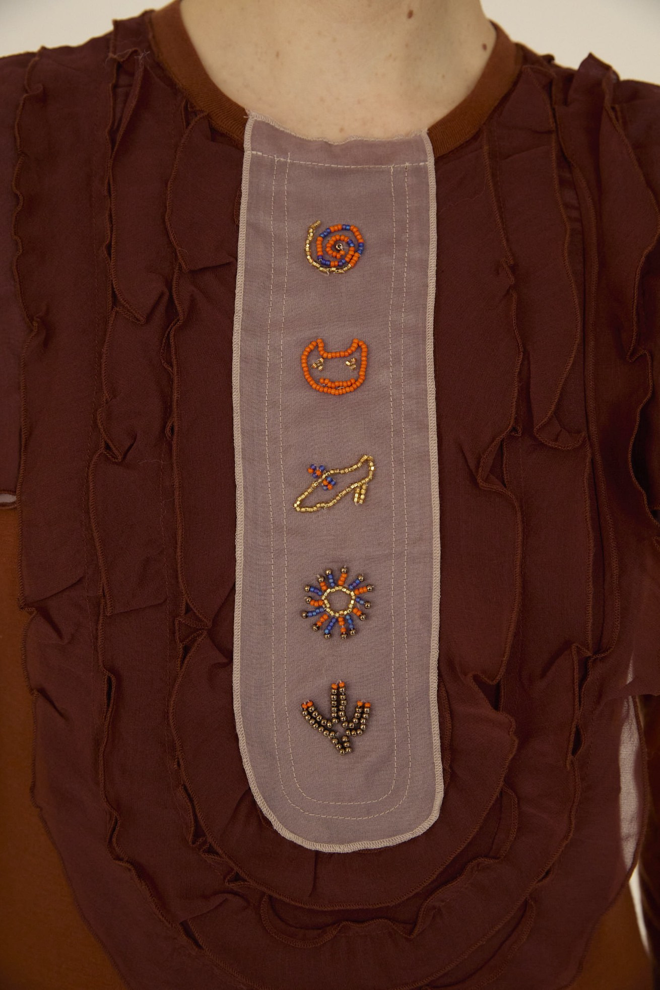 胸元のフリルデザインが特徴的なトップスです。 フロント部分には、ネコやガラスの靴など細かいモチーフをビーズ刺繍で表現しています。 ベースにはリヨセルにカシミアとシルクをブレンドした肌触りが良く、伸縮性の高い生地を使用。 コンパクトなサイズ感ですが、いやな締め付け感がないのが特徴です。 シルクのフリルがひらひらと揺れる華やかさのあるアイテムです。 ケア方法:ドライクリーニング ※着用モデル身長 brown ,blue:173㎝ red:170cm ※着用サイズ: 2(M) ※当サイトの商品は実店舗と在庫を共有しており、ご注文完了後に商品を確保できない場合がございます。 その際、改めてキャンセルまたは数量変更のメールをお送りいたします。何卒ご了承いただけますと幸いです。