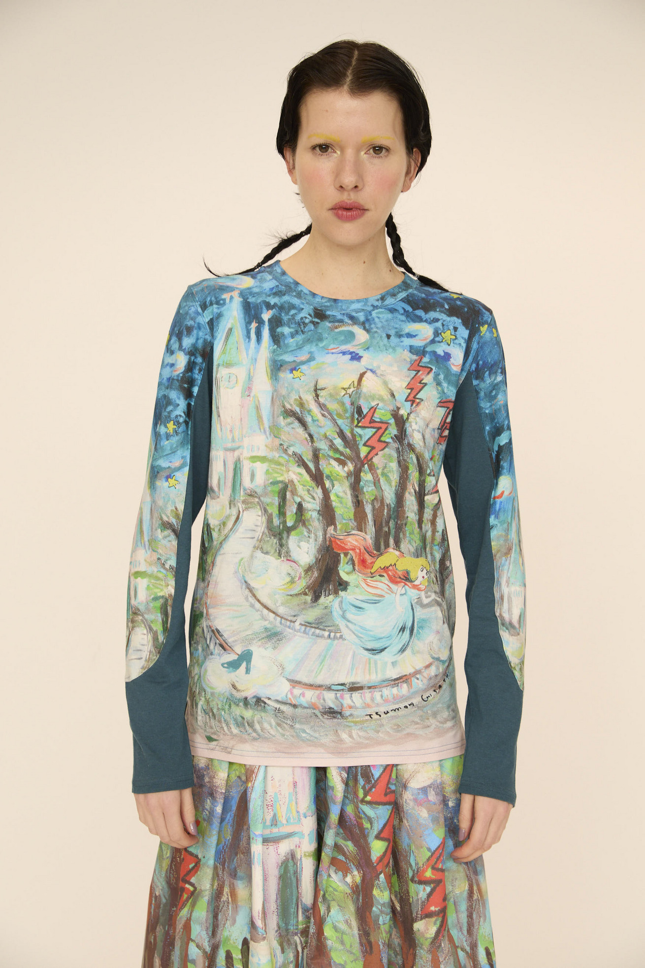 プリンセスがお城から駆け降りていく様子を自由なタッチで描き、そのままインクジェットプリントで表現しました。 12時を指すお城の時計台、階段を駆け降りるプリンセス、TCの文字になっている雷、雲の上に片方のガラスの靴、踊っているような木々やサボテン。 絵の具が混ざり合ってできた偶然の色とタッチがポイントです。 ストレッチ性の高い綿モダールの生地に染料インクジェットで表現しています。 袖に切り替えを入れ、コンパクトなサイズ感の長袖トップスに仕上げました。 ケア方法:ドライクリーニング ※着用モデル身長:173cm ※着用サイズ: 2(M) ※当サイトの商品は実店舗と在庫を共有しており、ご注文完了後に商品を確保できない場合がございます。 その際、改めてキャンセルまたは数量変更のメールをお送りいたします。何卒ご了承いただけますと幸いです。