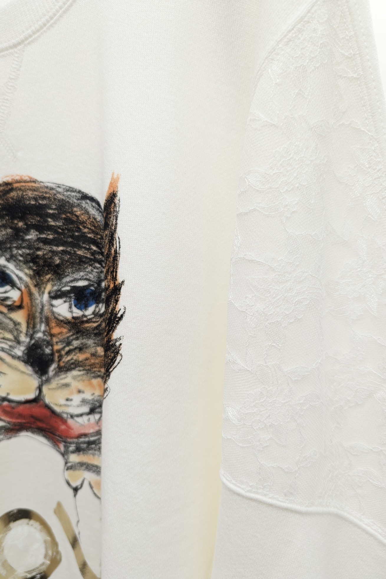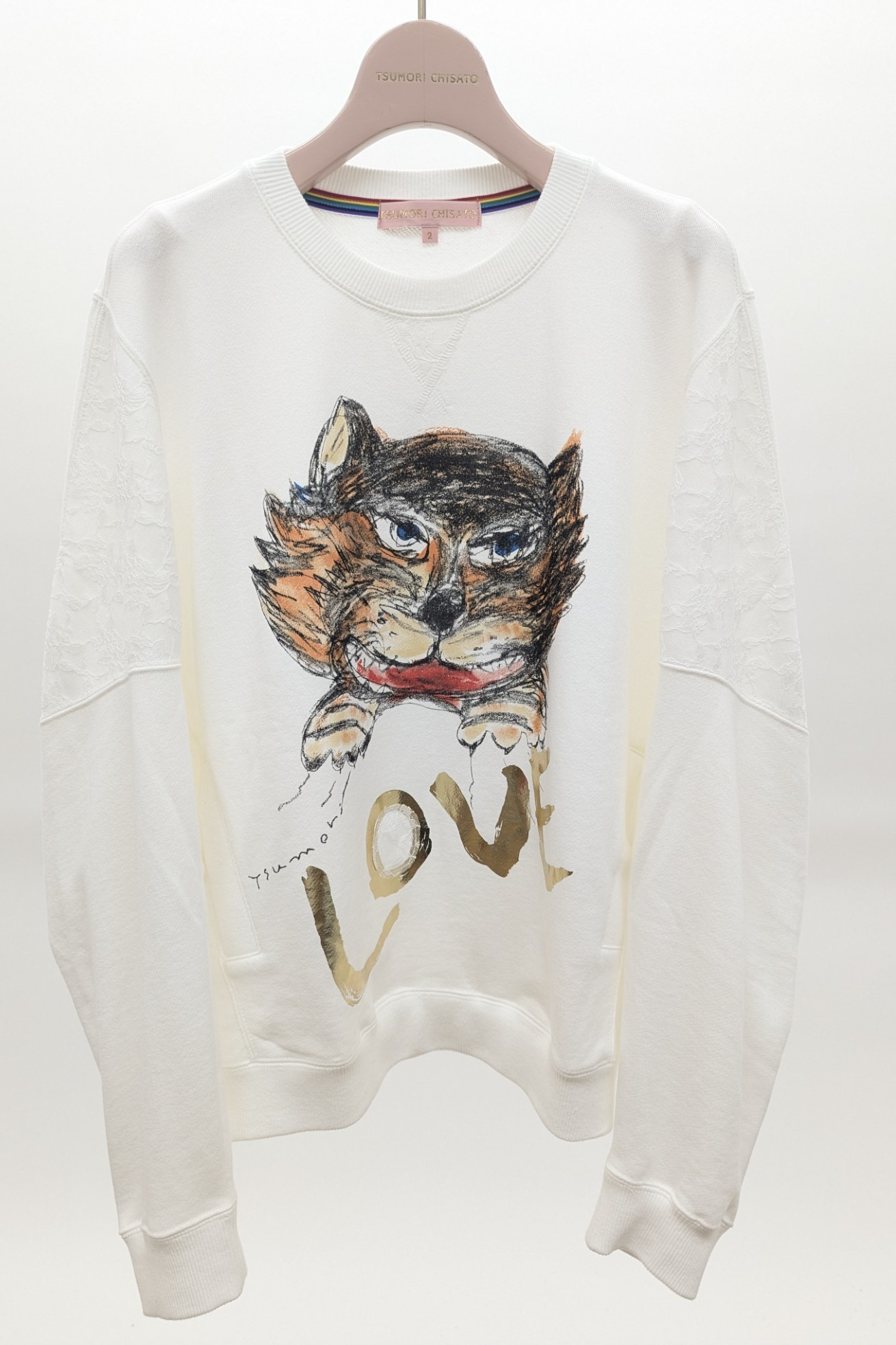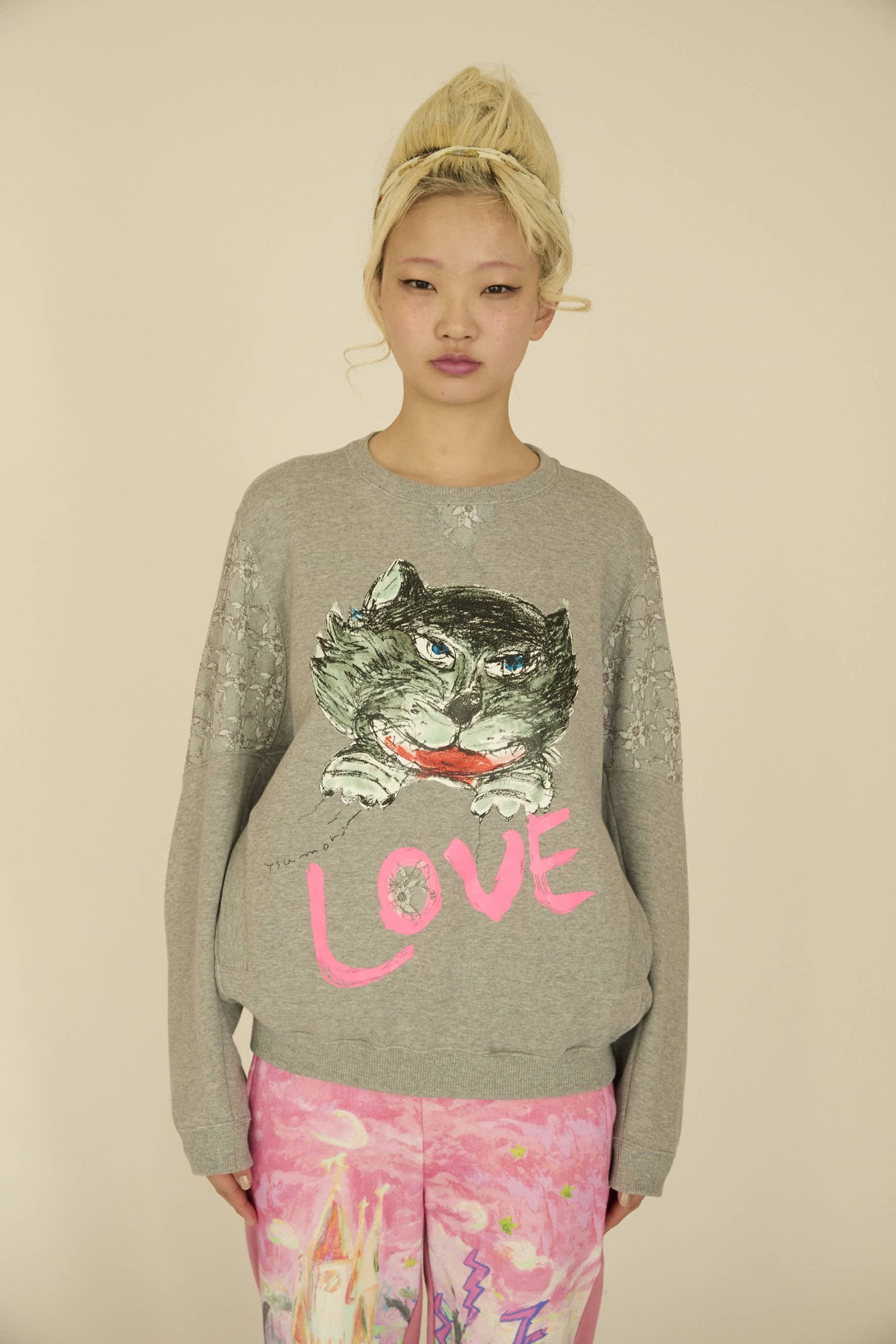 手描きタッチをそのまま表現した、大きなネコとLOVEの文字が存在感のあるトレーナーです。 ドルマンスリーブで全体的にゆったりとしたサイズ感がカジュアルに1枚で着やすいアイテムです。 ベースにはふっくらと柔らかい裏毛を使用。袖と汗止め、文字に部分的にレース生地を合わせてデザインにアクセントを加えています。 サイドにはスラッシュポケット付き。 ケア方法:手洗い可能(ドライクリーニング不可) ※着用モデル身長:174cm ※着用サイズ: 2(M) ※当サイトの商品は実店舗と在庫を共有しており、ご注文完了後に商品を確保できない場合がございます。 その際、改めてキャンセルまたは数量変更のメールをお送りいたします。何卒ご了承いただけますと幸いです。