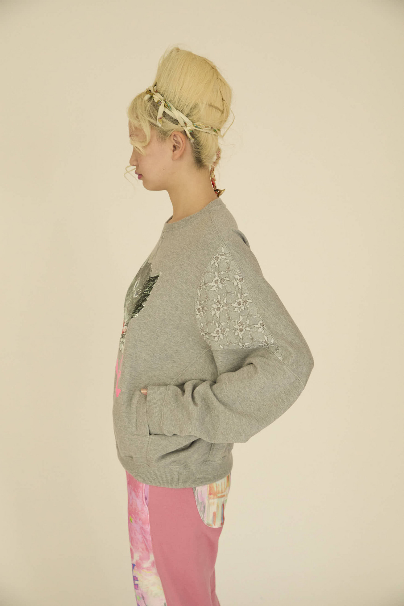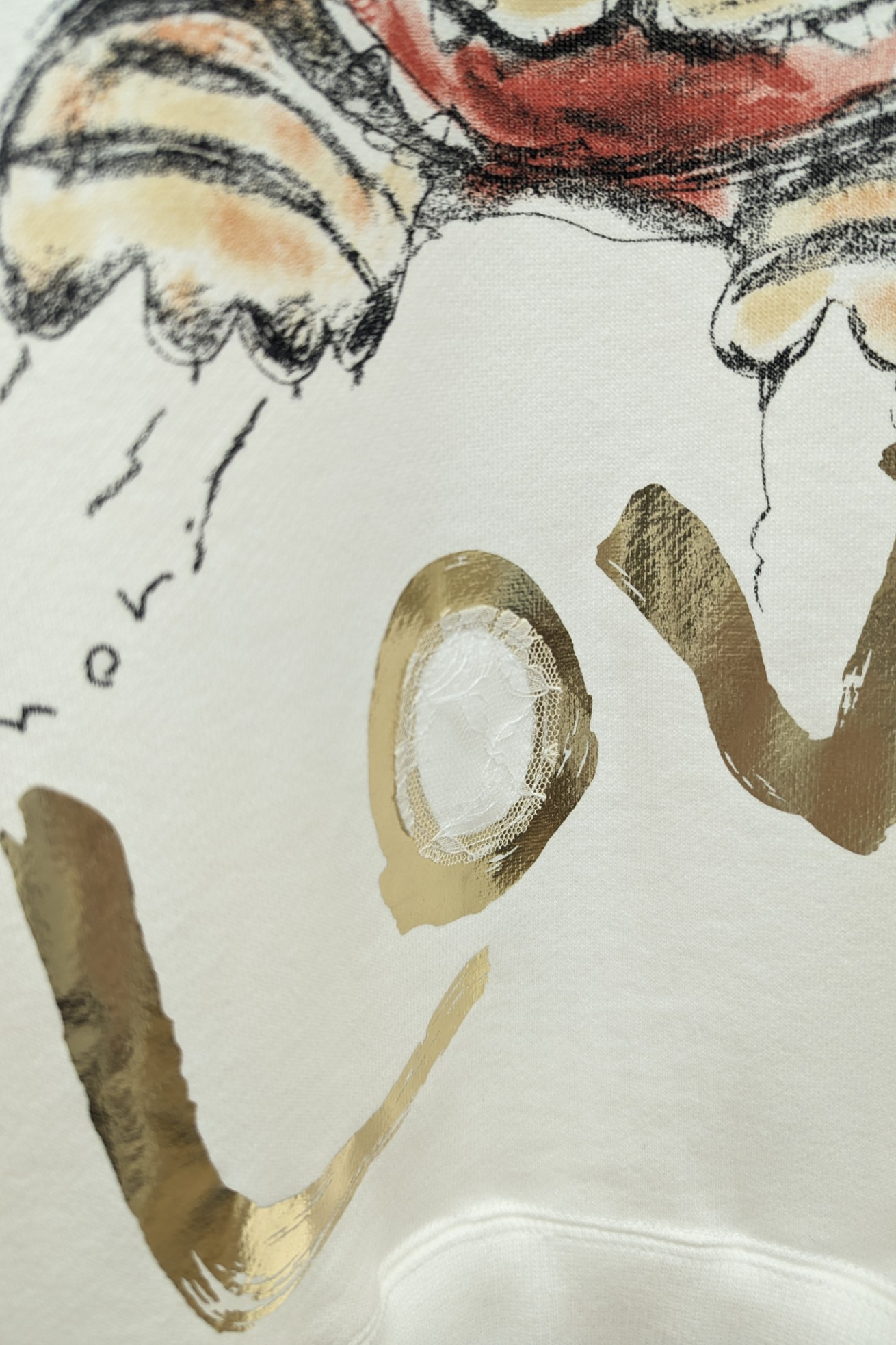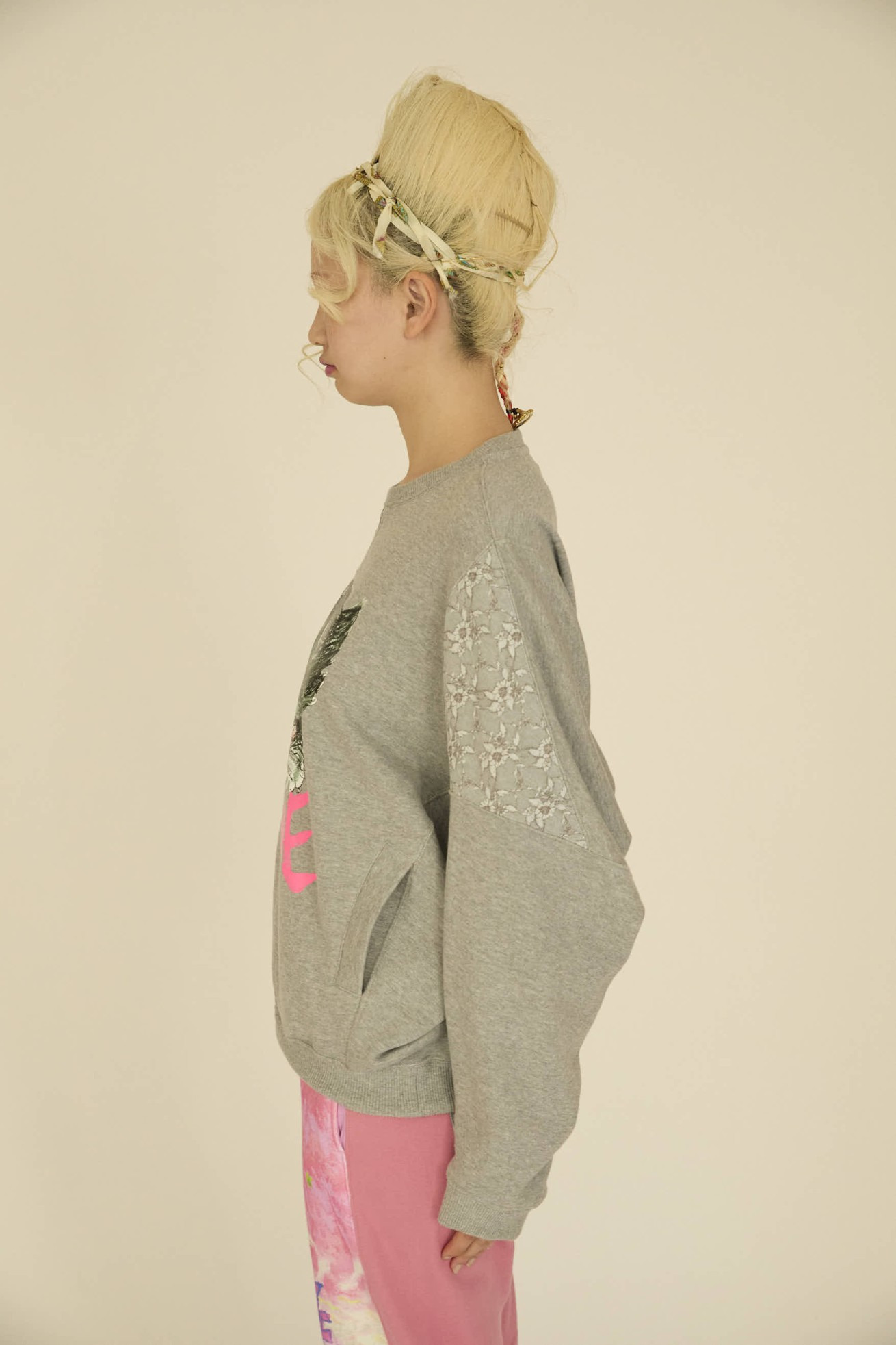 手描きタッチをそのまま表現した、大きなネコとLOVEの文字が存在感のあるトレーナーです。 ドルマンスリーブで全体的にゆったりとしたサイズ感がカジュアルに1枚で着やすいアイテムです。 ベースにはふっくらと柔らかい裏毛を使用。袖と汗止め、文字に部分的にレース生地を合わせてデザインにアクセントを加えています。 サイドにはスラッシュポケット付き。 ケア方法:手洗い可能(ドライクリーニング不可) ※着用モデル身長:174cm ※着用サイズ: 2(M) ※当サイトの商品は実店舗と在庫を共有しており、ご注文完了後に商品を確保できない場合がございます。 その際、改めてキャンセルまたは数量変更のメールをお送りいたします。何卒ご了承いただけますと幸いです。