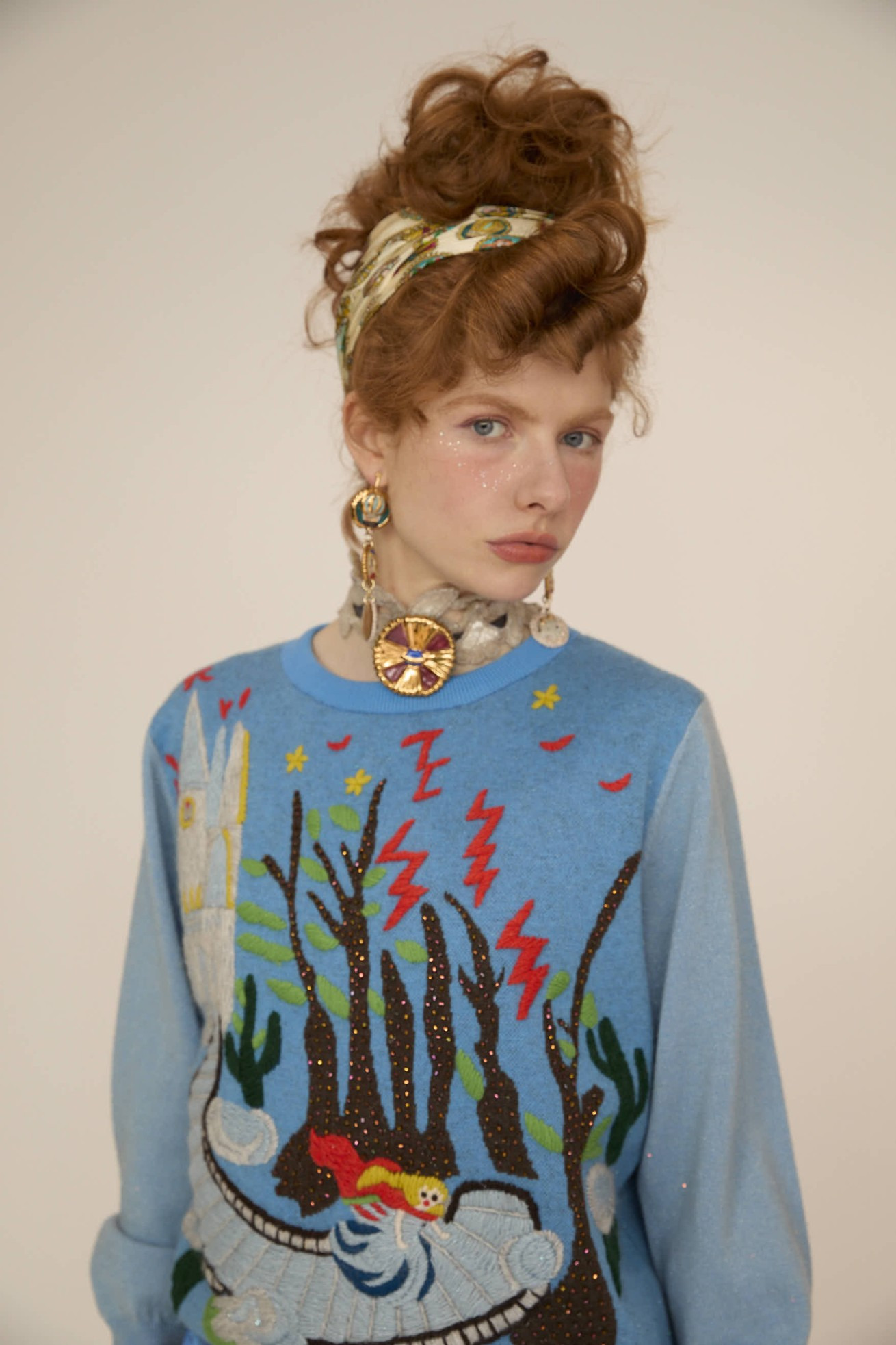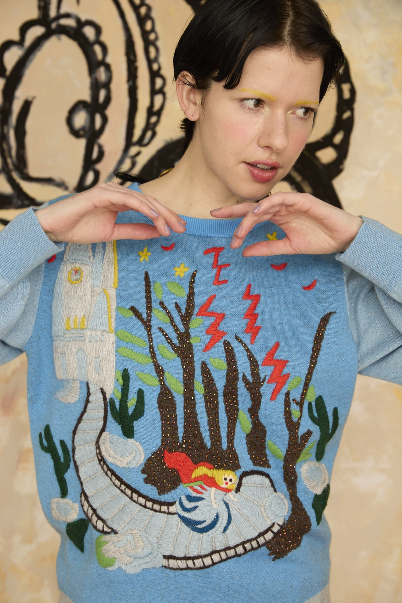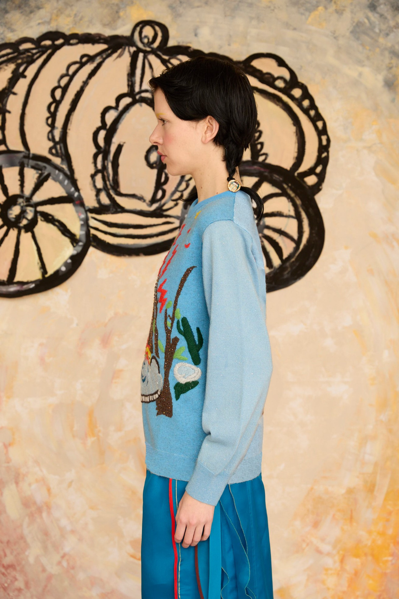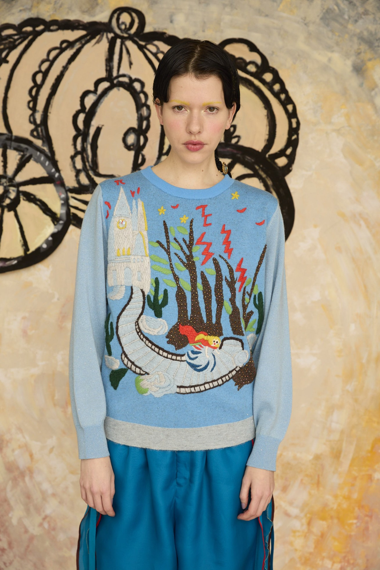 プリンセスがお城から駆け降りていく様子を手刺繍とジャガードニットで表現しています。 12時目前を指すお城の時計台、階段を駆け降りるプリンセス、TCの文字になっている雷、踊っているような木々やサボテンなど、ビーズやスパンコールをプラスした手仕事の詰まった特別な1枚です。 ケア方法:ドライクリーニング ※着用モデル身長:170cm 173cm ※着用サイズ: 2(M) ※当サイトの商品は実店舗と在庫を共有しており、ご注文完了後に商品を確保できない場合がございます。 その際、改めてキャンセルまたは数量変更のメールをお送りいたします。何卒ご了承いただけますと幸いです。
