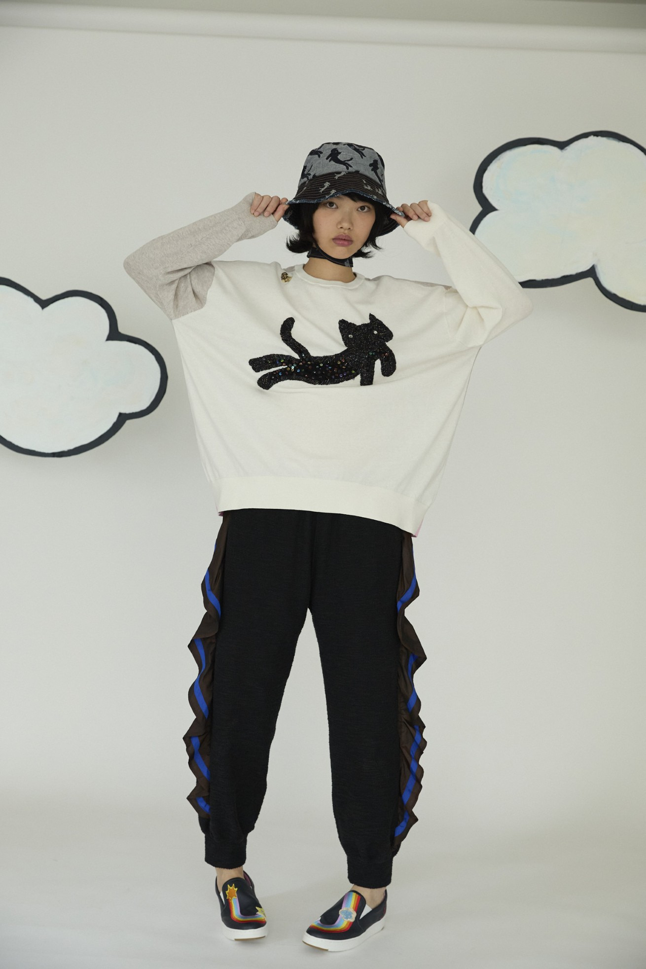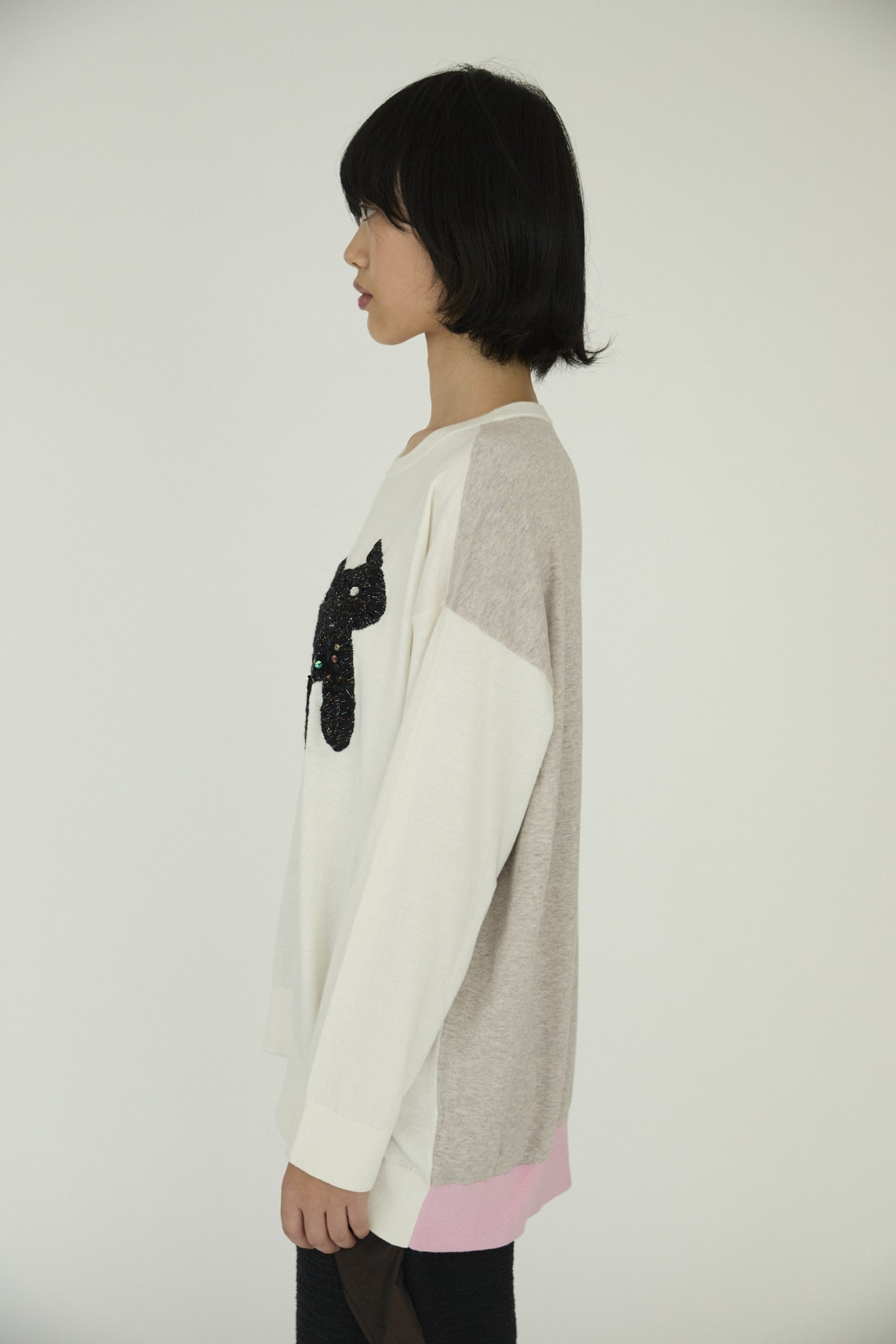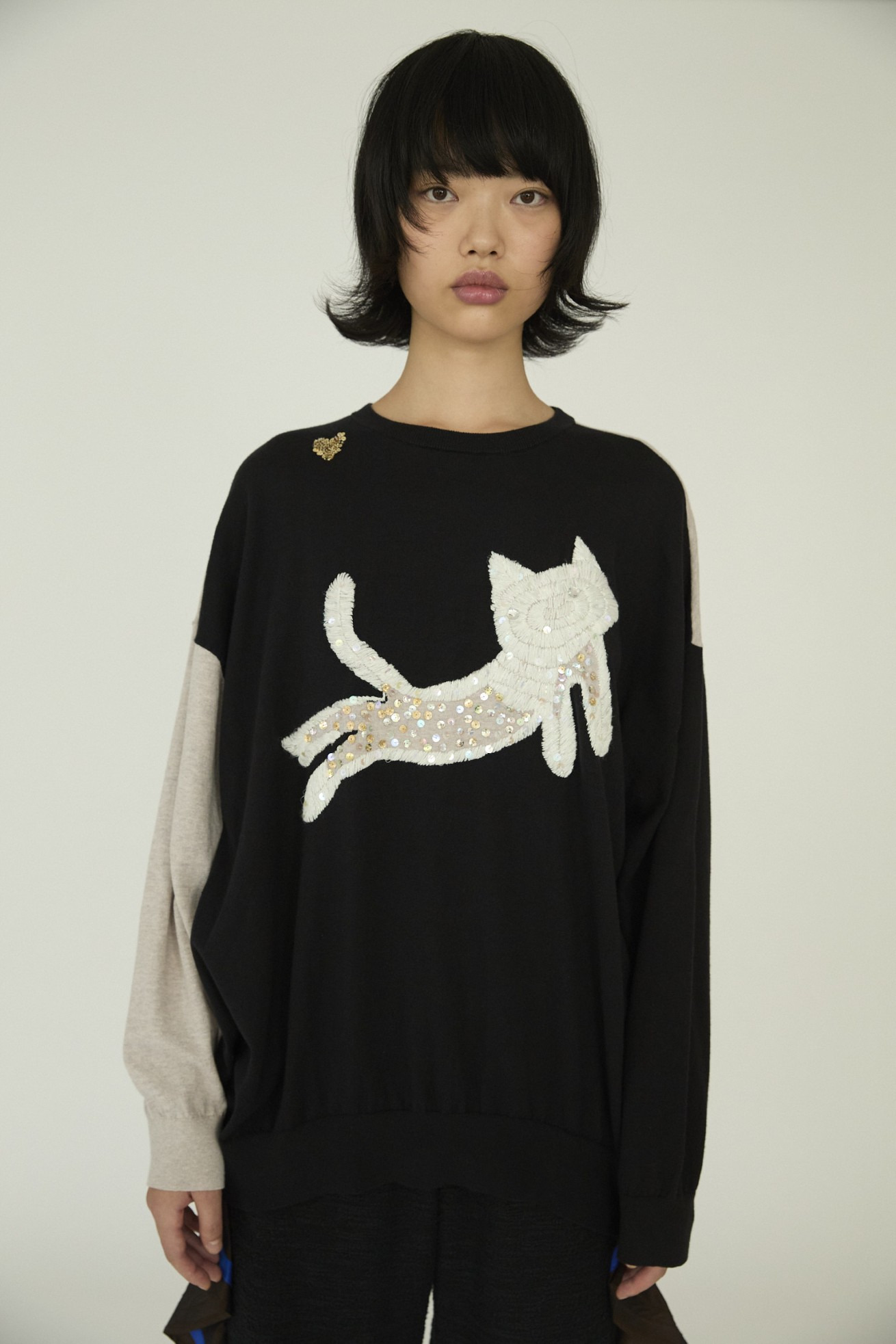 フロントに大きく刺繍されたキラネコがキャッチーなプルオーバーニット。