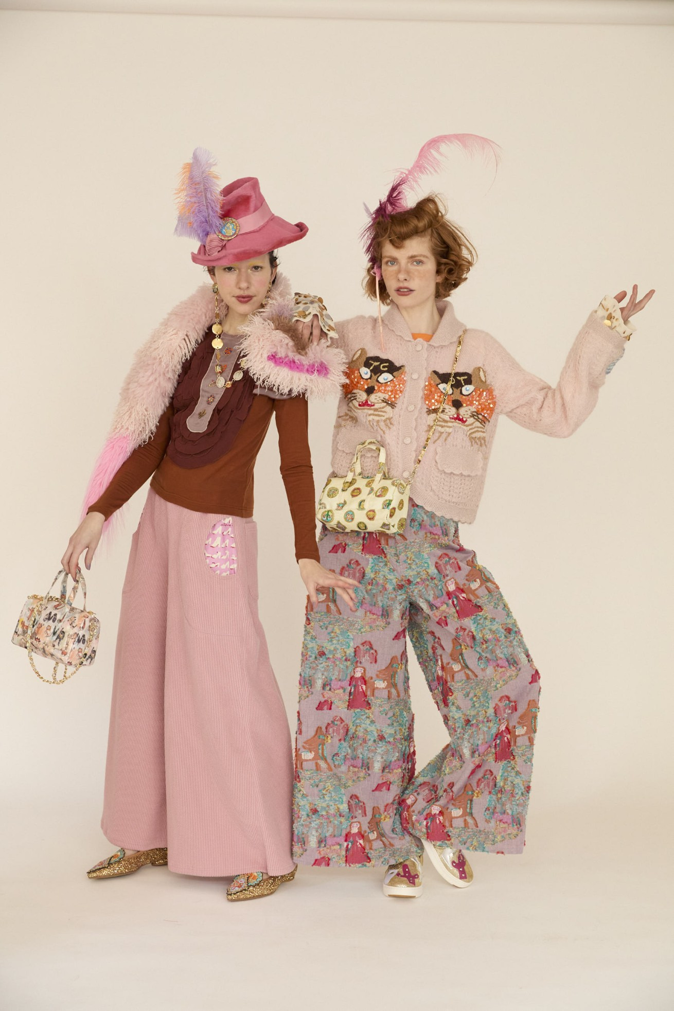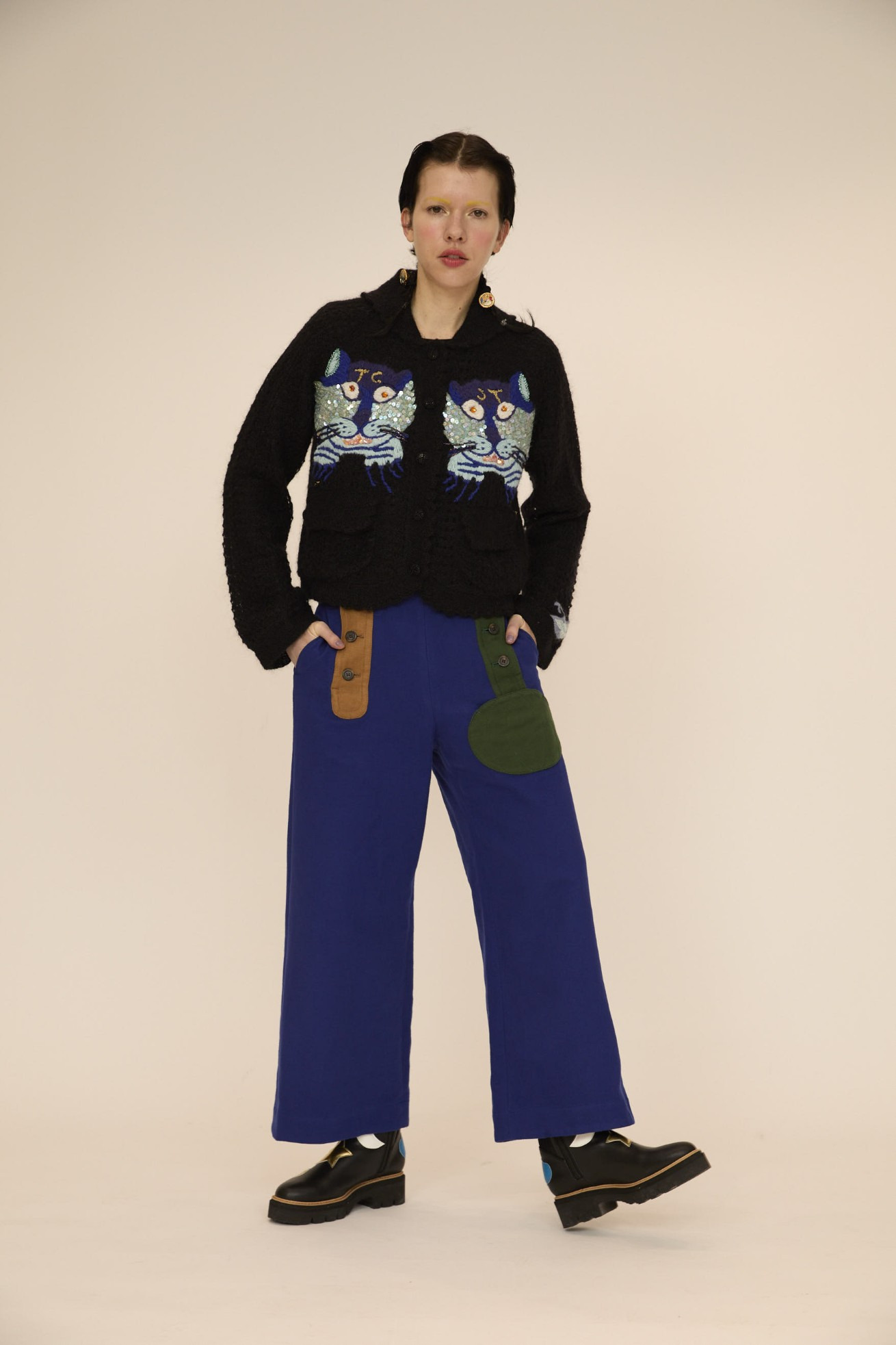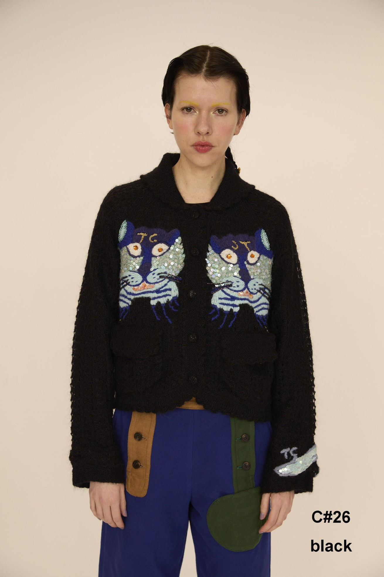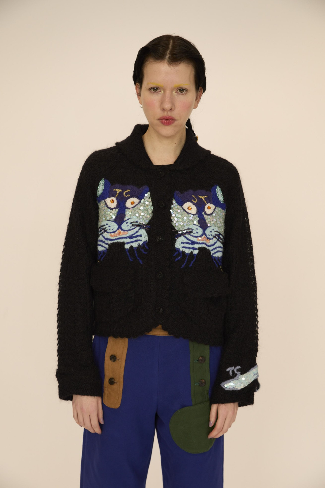 今シーズン登場するネコモチーフを毛糸、スパンコール、ビーズの刺繍で表現したニットカーディガン。