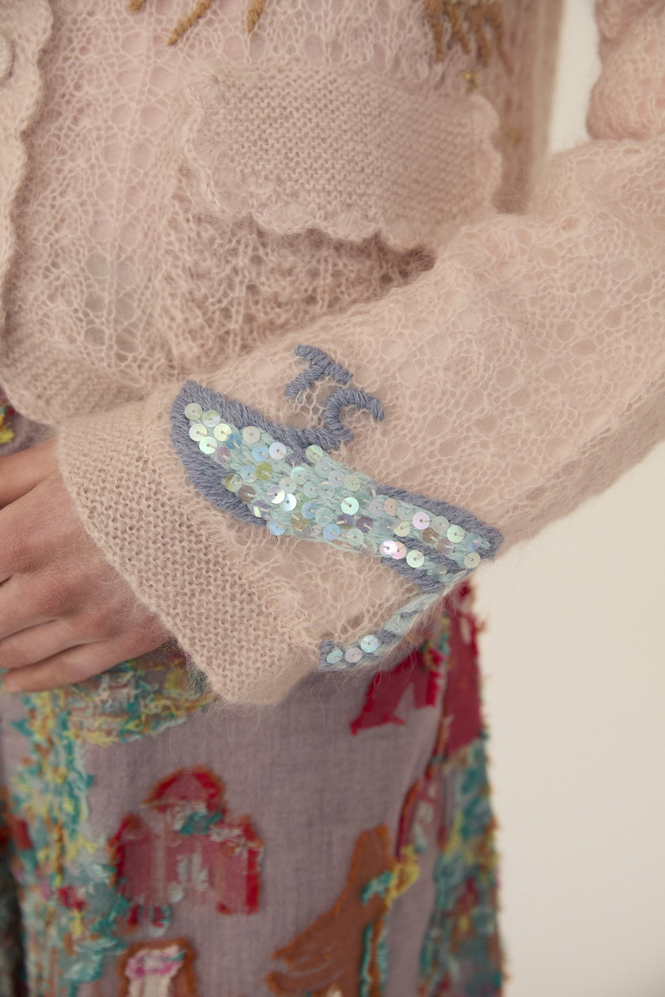 透かし編みで着心地が軽く、裏地にはシルクの羽二重を使用。スカラップの前立てやポケット、襟、ニットのくるみボタンにもビーズ刺繍を入れ、細部に手作業のつまった1枚です。袖裾にはガラスの靴がビーズ刺繍で入っています。