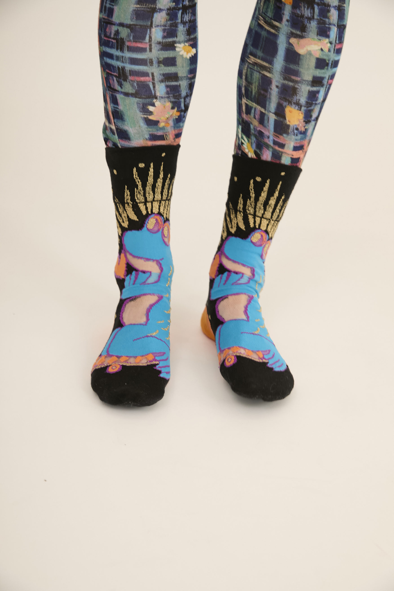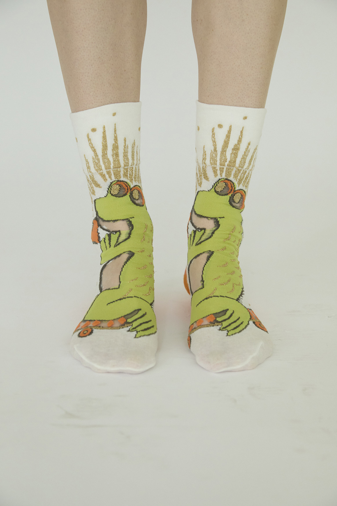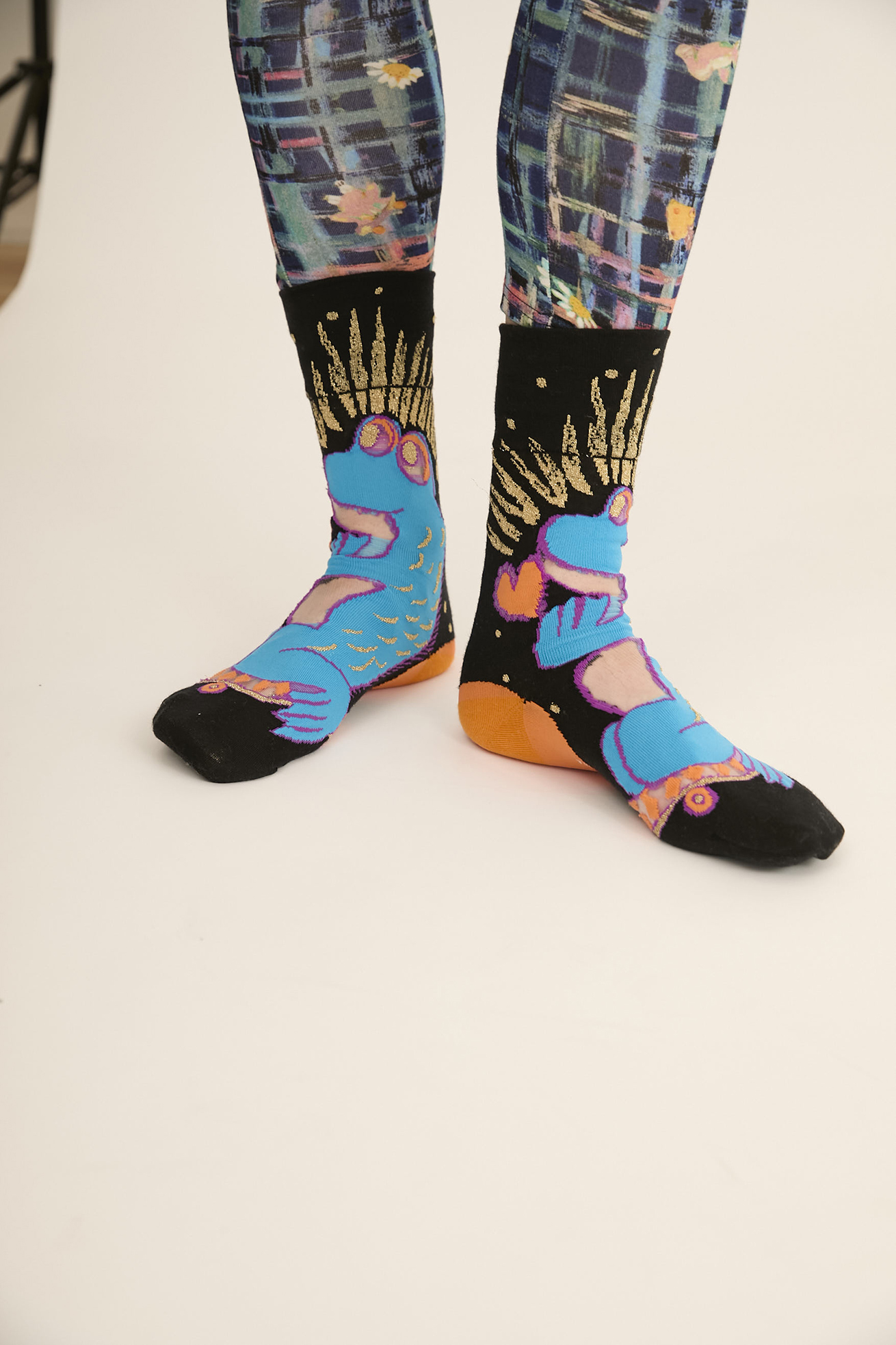 スケボーの上に座って走る、甦るパワーを持ったヨミガエルのソックスです。 目の部分とお腹の部分、スケボーの柄をシースルーにしています。 東京都板橋区で作っています。 ※着用モデル身長:170cm 173cm ※当サイトの商品は実店舗と在庫を共有しており、ご注文完了後に商品を確保できない場合がございます。 その際、改めてキャンセルまたは数量変更のメールをお送りいたします。何卒ご了承いただけますと幸いです。