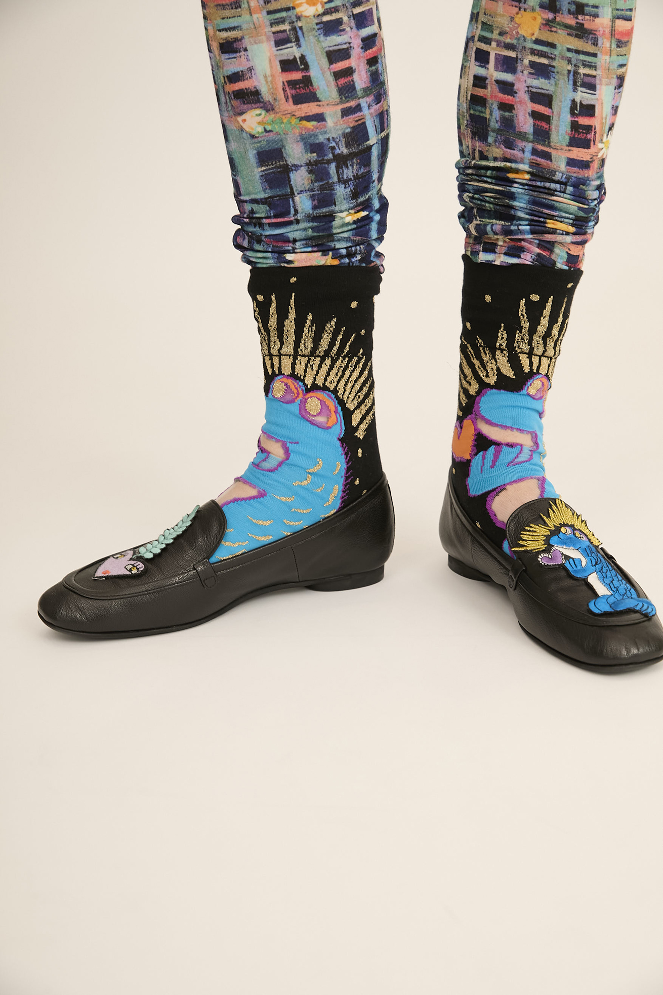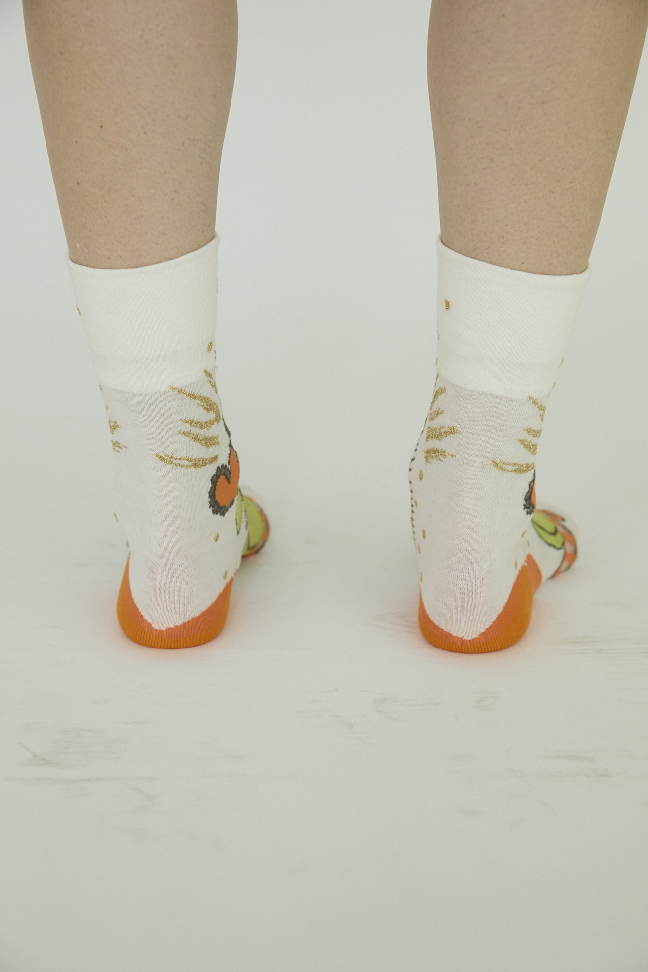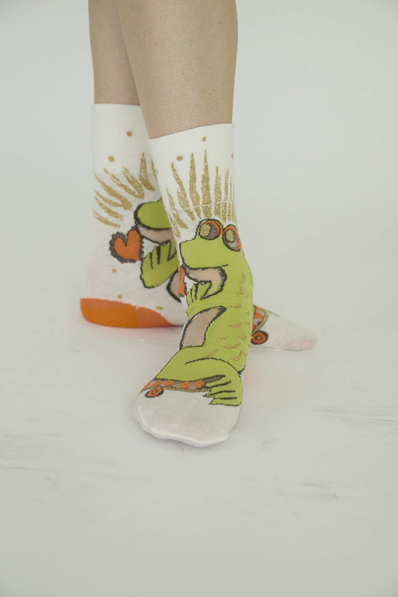スケボーの上に座って走る、甦るパワーを持ったヨミガエルのソックスです。 目の部分とお腹の部分、スケボーの柄をシースルーにしています。 東京都板橋区で作っています。 ※着用モデル身長:170cm 173cm ※当サイトの商品は実店舗と在庫を共有しており、ご注文完了後に商品を確保できない場合がございます。 その際、改めてキャンセルまたは数量変更のメールをお送りいたします。何卒ご了承いただけますと幸いです。