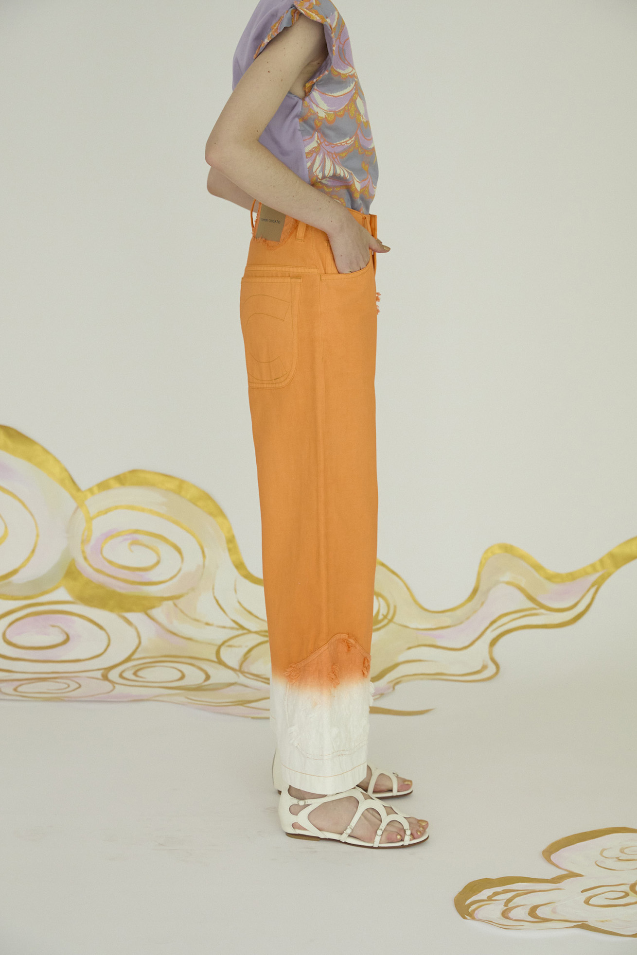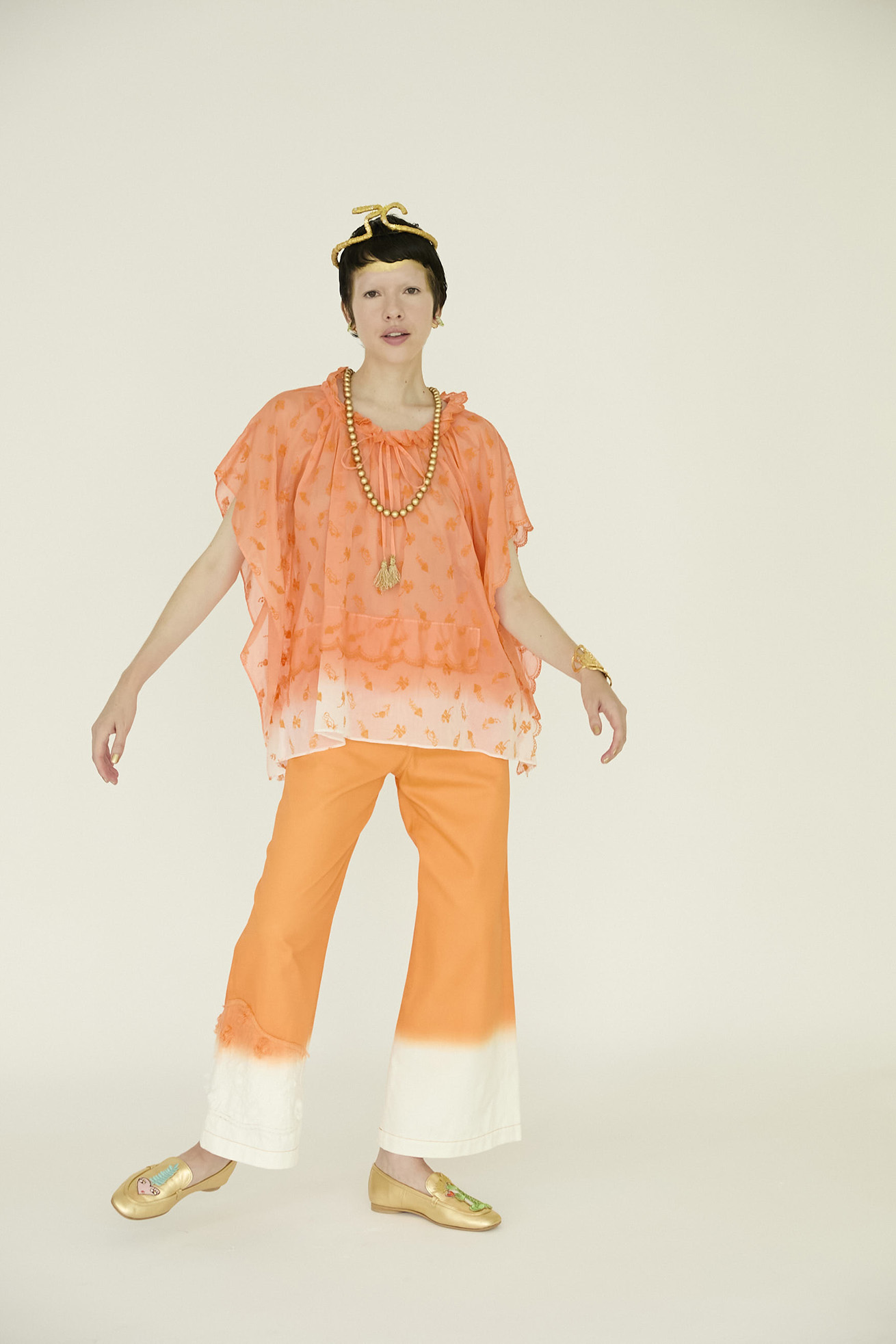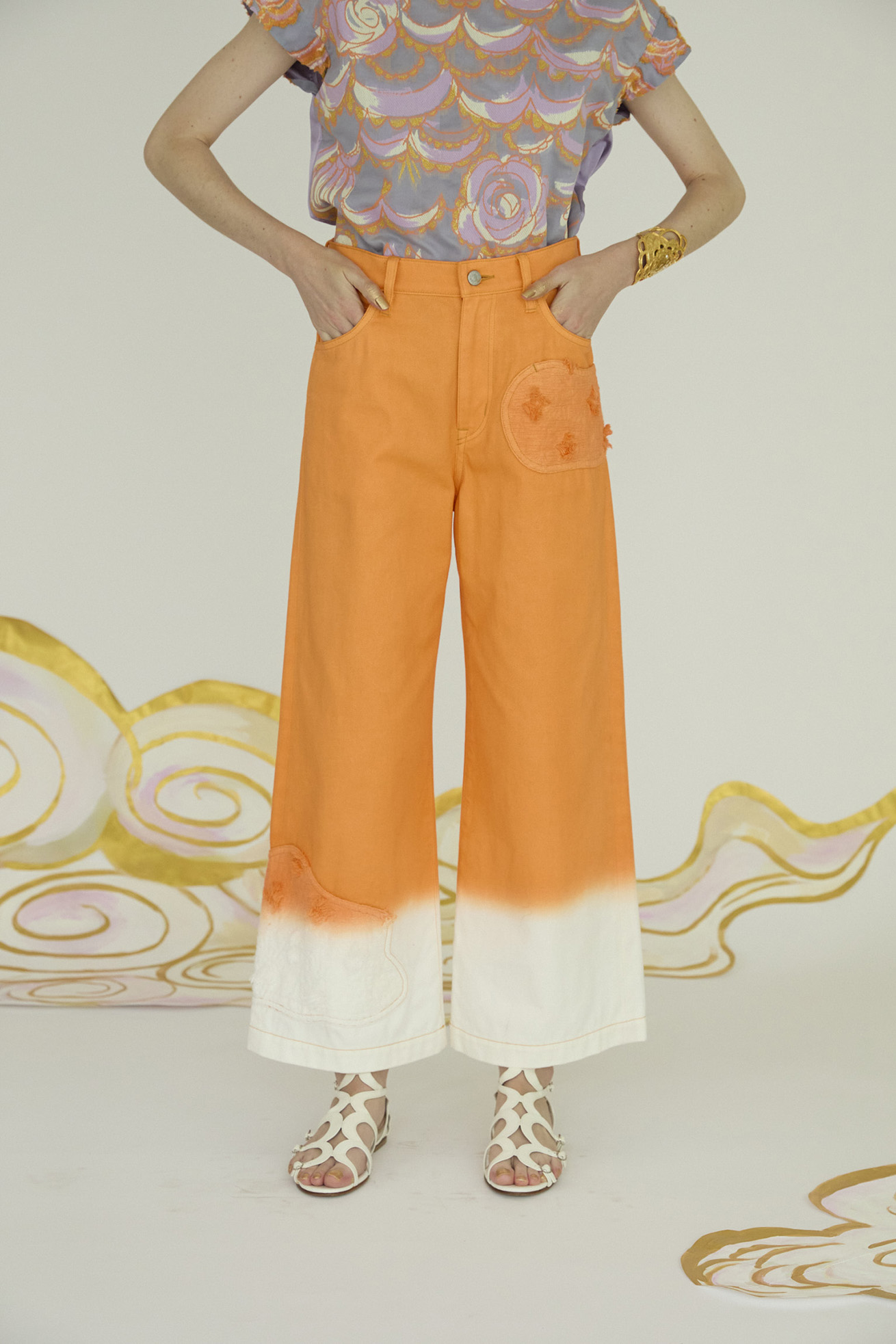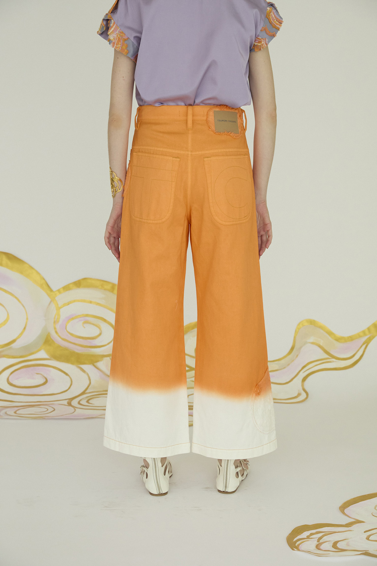 鮮やかで綺麗な色の段染めが目を惹くセミワイドパンツ。 東京の染色工場で加工し、 染色部分と染色していない部分の差が楽しい、手仕事ならではの手の込んだ商品です。 生地はタンブラー加工を施す事できれい目でふっくらと仕上げたチノクロスを使用。素材の存在感がありながらも重くなり過ぎず、ほんのり光沢がある上品なカジュアル感、洗いこむことで糸が膨らみ風合いが増すのも特徴です。 裾とサイドの雲切り替えには、太さに強弱のあるCotton100%スラブ糸を使用し、部分的に緯糸をカットしてフリンジ状にしたギリシャメーカーの生地を合わせてアクセントに。 こちらの商品は手洗い可能です。 ※着用モデル身長:173cm ※着用サイズ: 2(M) ※当サイトの商品は実店舗と在庫を共有しており、ご注文完了後に商品を確保できない場合がございます。 その際、改めてキャンセルまたは数量変更のメールをお送りいたします。何卒ご了承いただけますと幸いです。