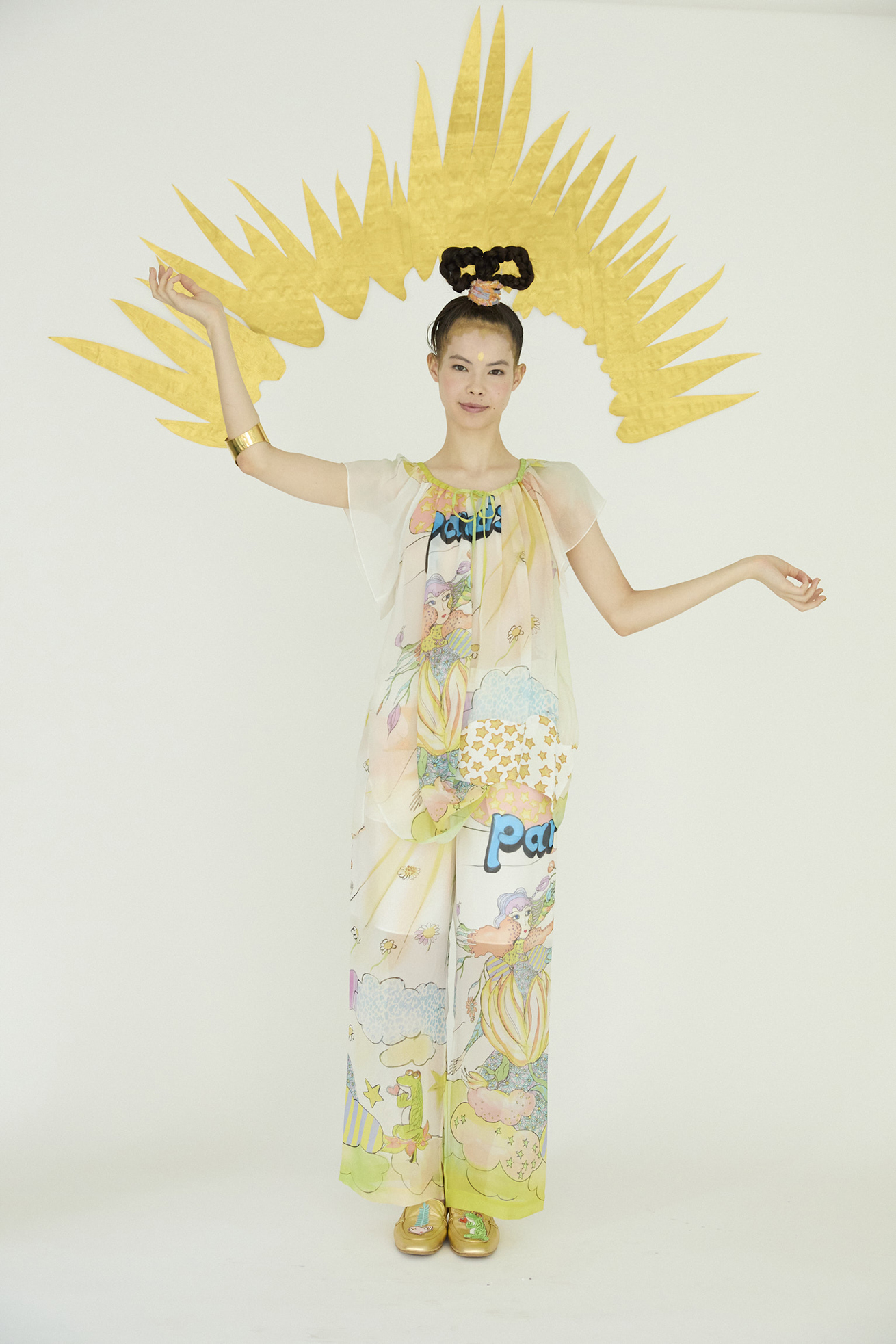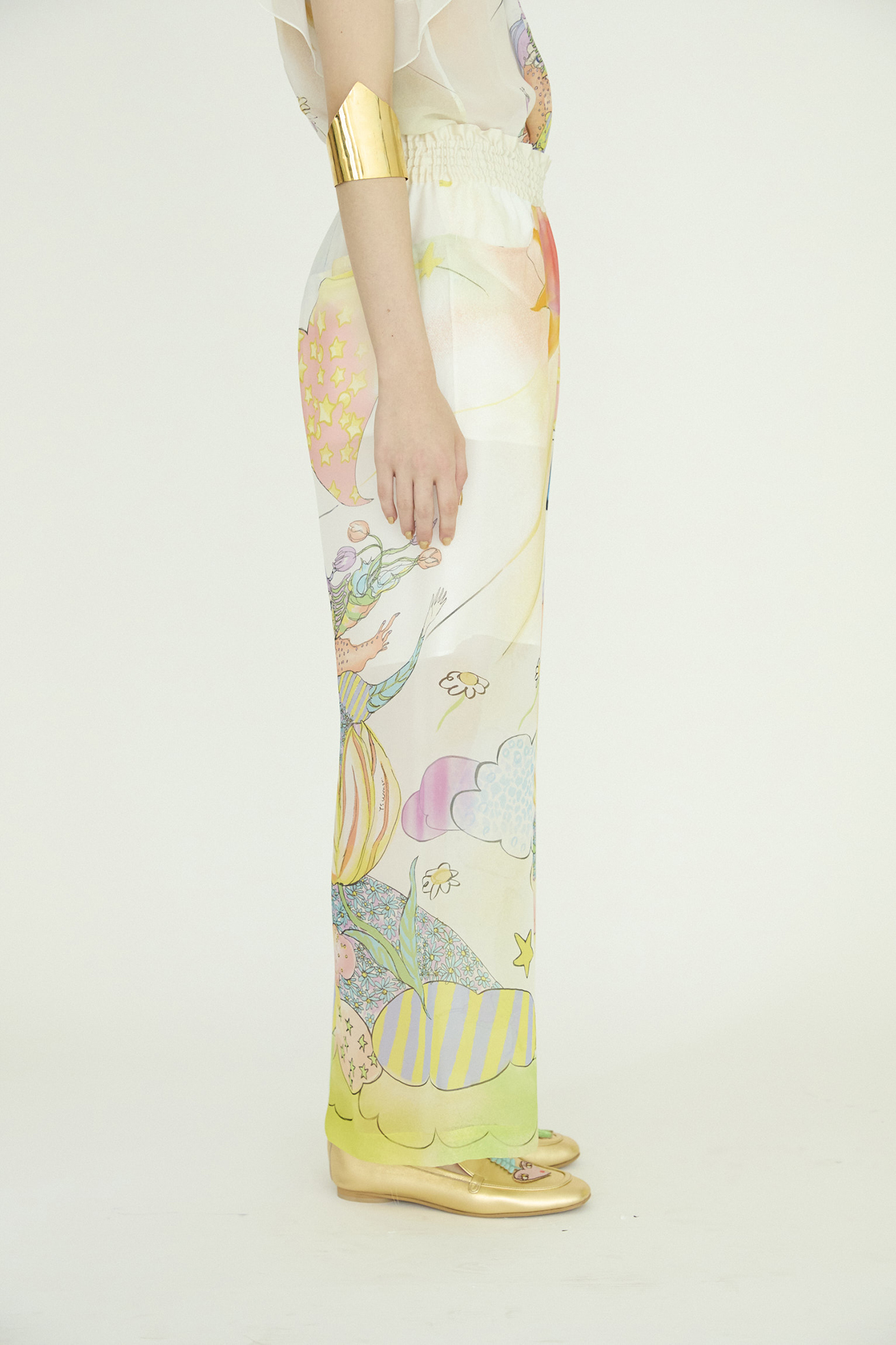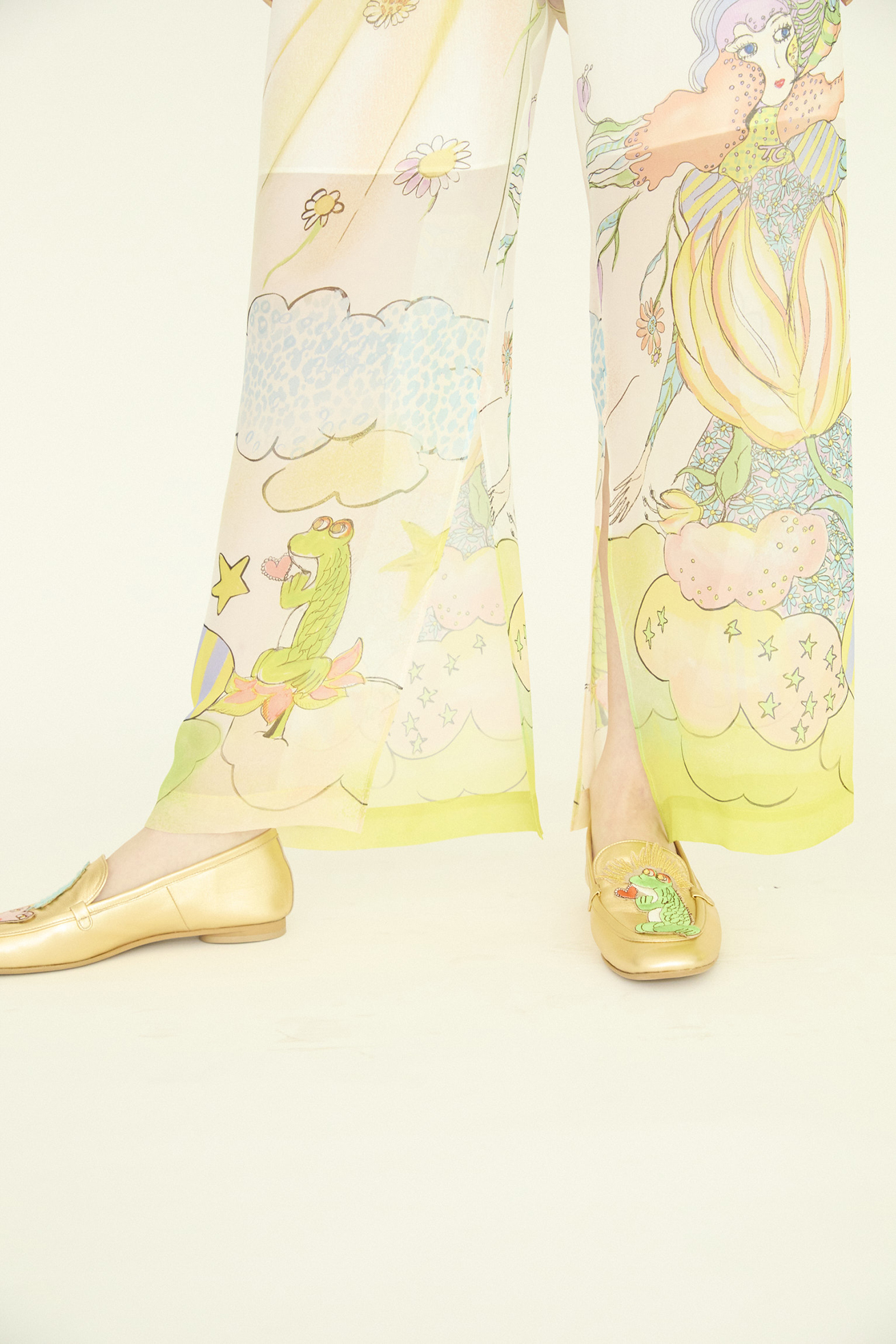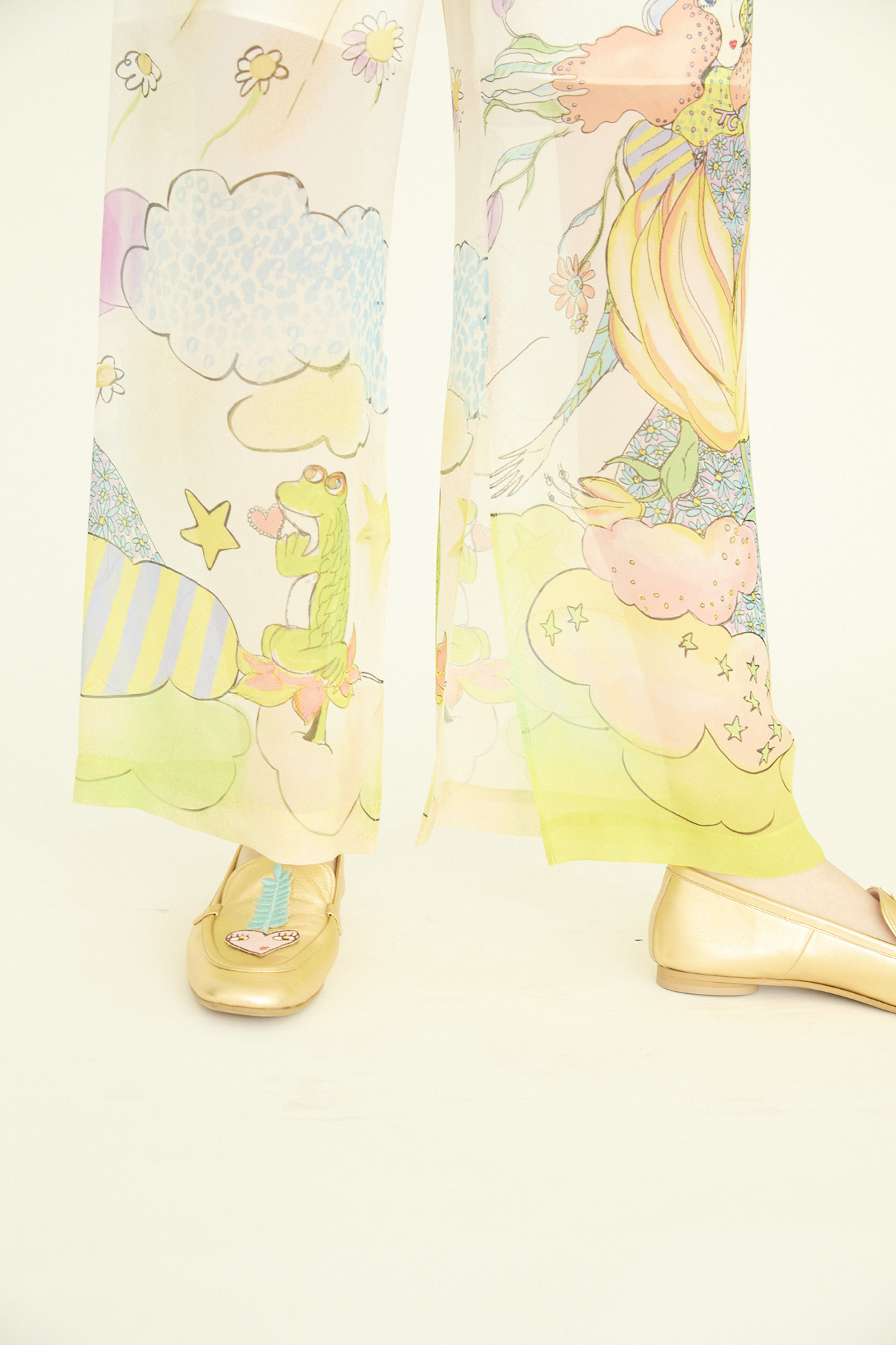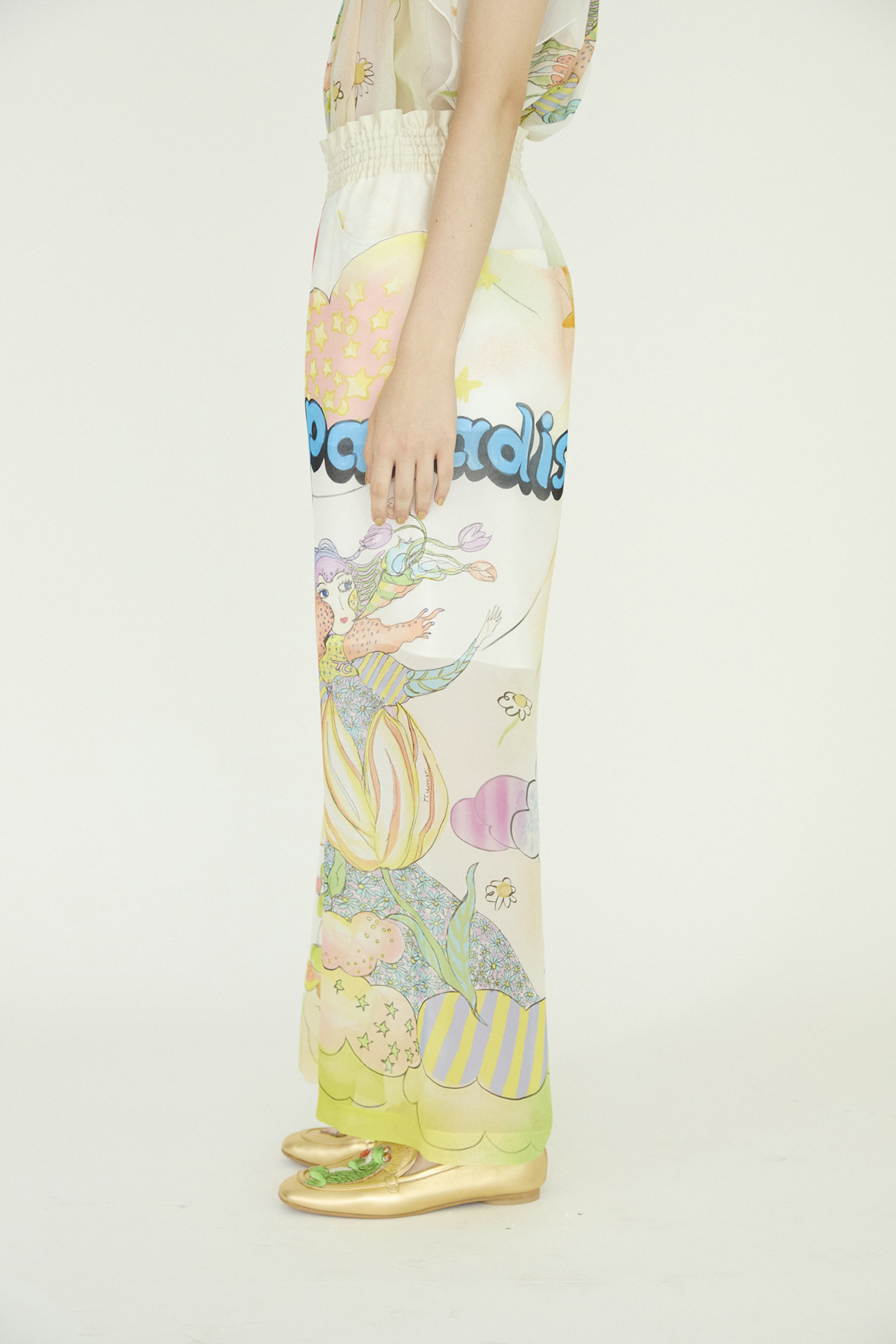 Bloom girlのプリントを活かし、左右に縫い目が出ないようにデザインしたパンツです。 内側の深めのスリットが、歩くたびにひらひらと揺れる生地感が涼しげで妖艶なアイテムです。 ウエストはゴム仕様で履きやすく、前後に4つのポケット付き。 〈Bloom girl〉 花を咲かせるパワーを持ったBloom girl。たくさんの花がふわふわと舞って空に浮かんでいく。蓮の花の上のカエル、Paradisの文字。優しく光る太陽。空に浮かぶ雲と一緒にふわふわと浮かんでいるような花の楽園をイメージして、繊細なカラーをインクジェットプリントで表現しました。透け感のあるシルクシフォンに中国でプリントしています。 ※着用モデル身長:170cm ※着用サイズ: 2(M) ※当サイトの商品は実店舗と在庫を共有しており、ご注文完了後に商品を確保できない場合がございます。 その際、改めてキャンセルまたは数量変更のメールをお送りいたします。何卒ご了承いただけますと幸いです。