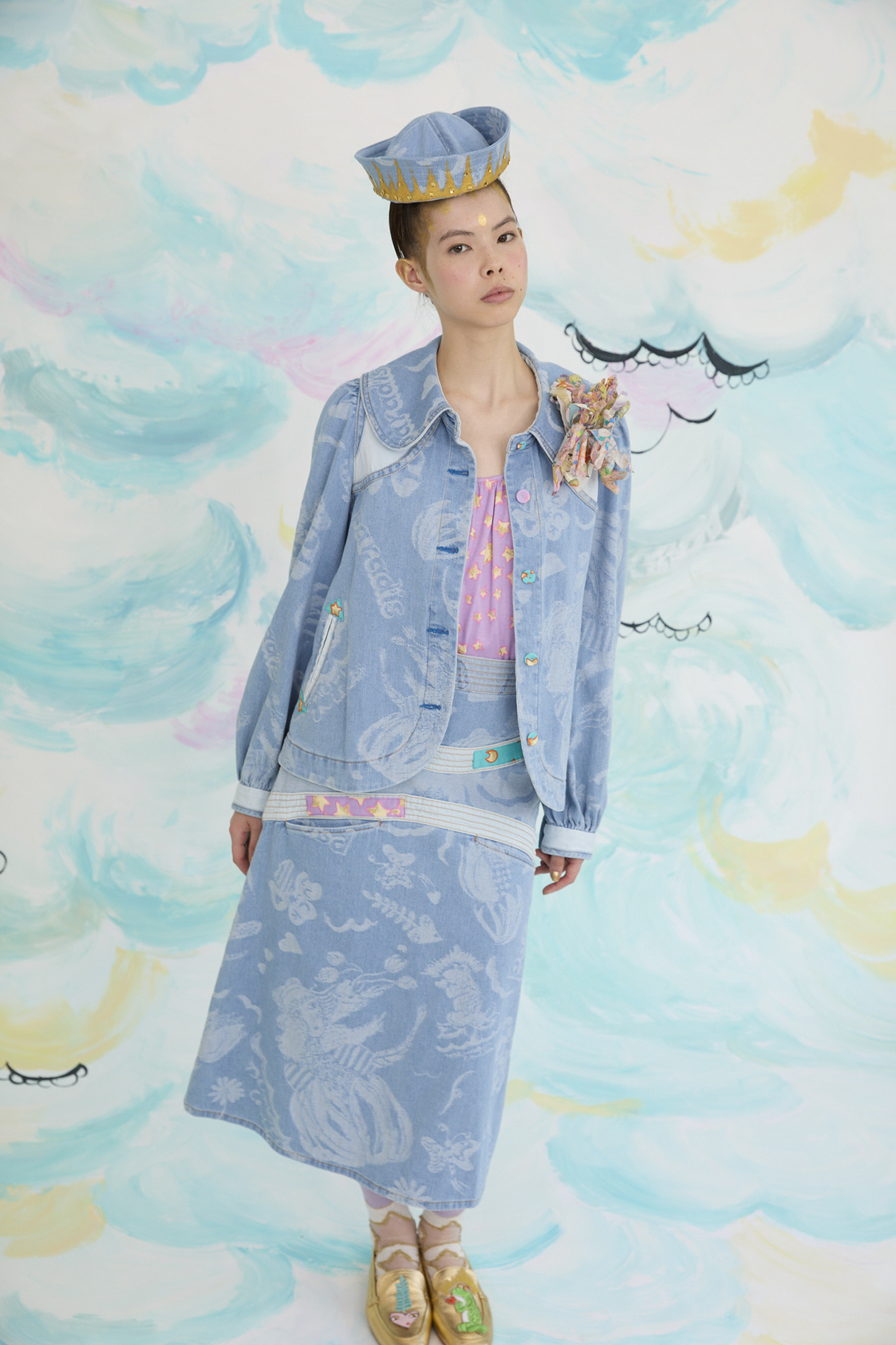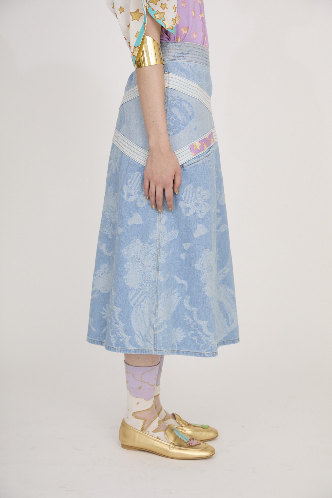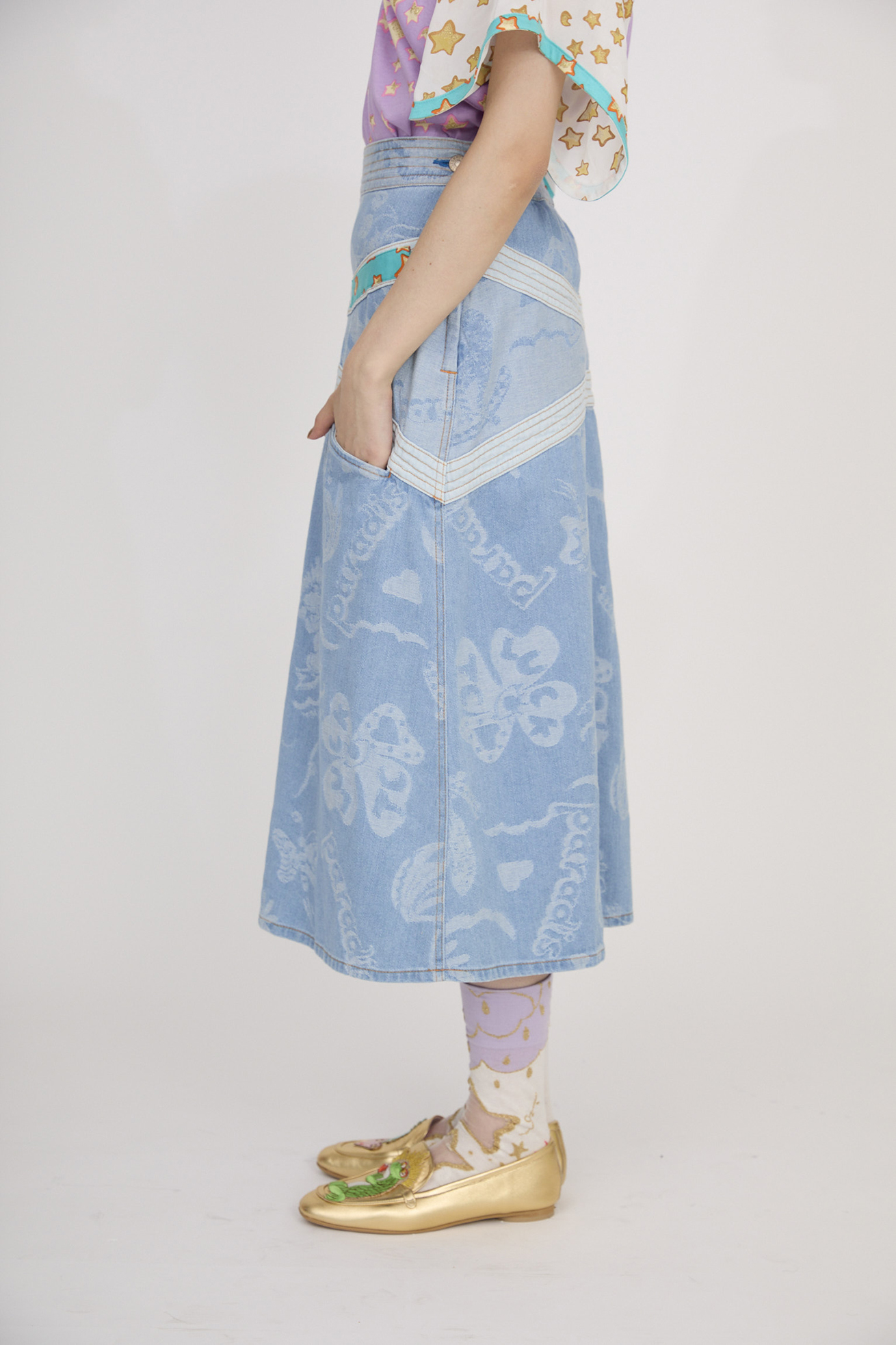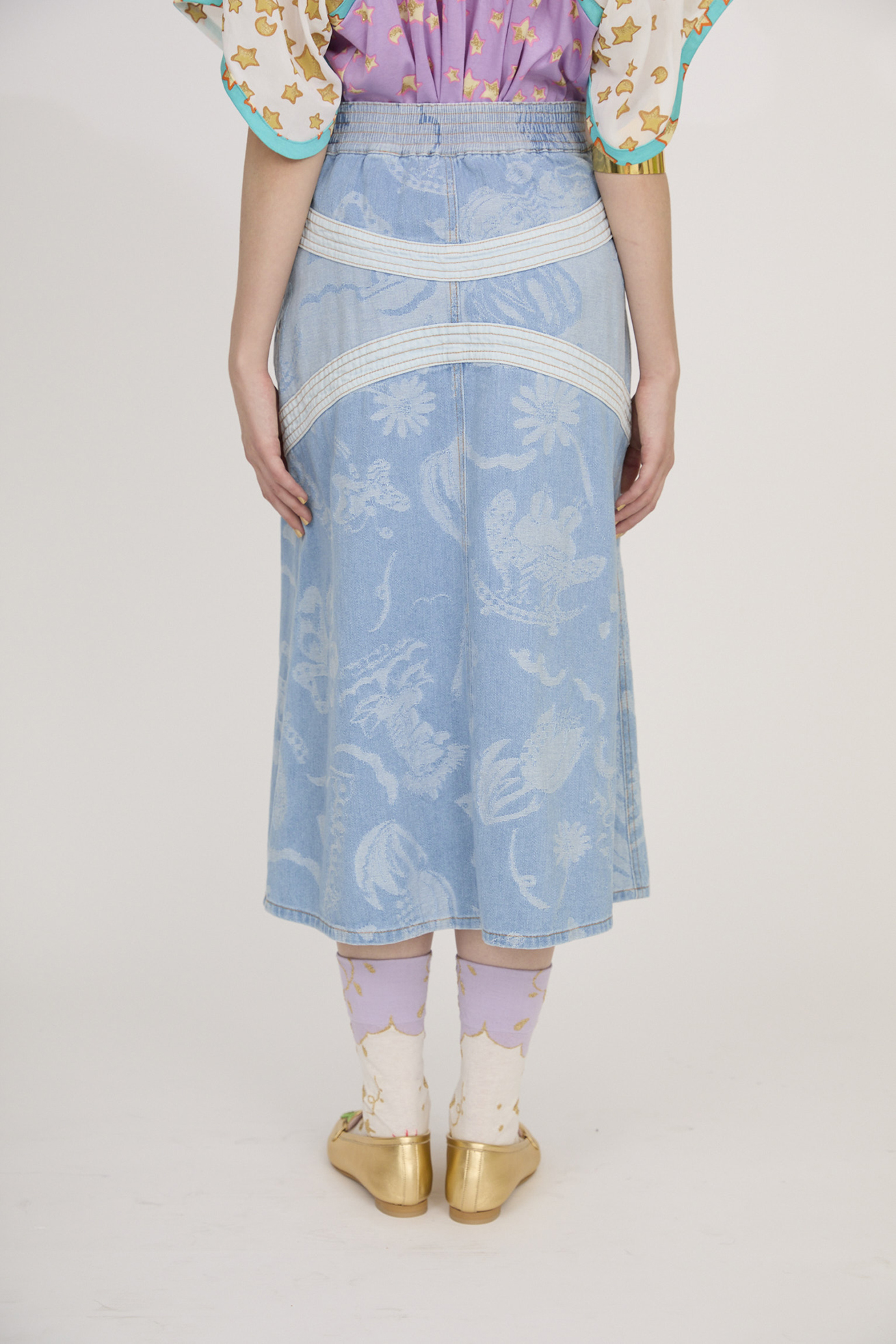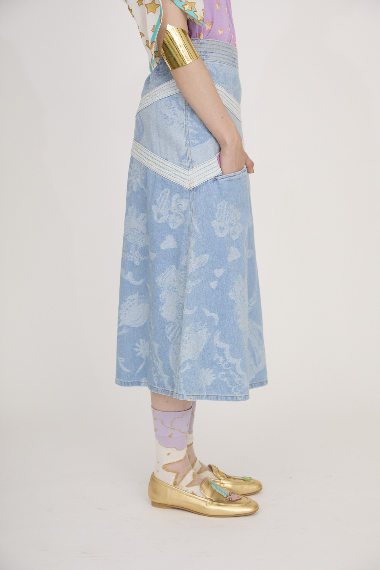 花を咲かせるパワーを持った女の子とたくさんの花、蓮の花の上のカエル、四葉、ちょうちょ、Paradisの文字をオリジナルのデニムジャカードにして、切り替えがアクセントのスカートに仕上げました。 切り替えの下から広がるシルエットがスッキリとした印象で、きれいにコーディネートができるアイテムです。 切り替え部分に無地のデニムとCat star生地をポイントでプラスしています。 繊細かつ大胆なタッチを、細かくジャカード織で表現しています。経糸緯糸ともにアメリカ綿を主にした糸を使用し、バルキーさもありながら、綺麗さのある表面感に仕上げました。 生地は岡山県井原市で織っています。こちらの商品は手洗い可能です。 ※インディゴ染めのため洗濯時に色が出ます。濃色は淡い色の洋服と合わせると色移りが発生しますのでご注意ください。 〈Cat star〉 大小たくさんの星たちの中に、よく見るとネコ型の星がキラキラ。集まったり散らばったりしながらキラキラ輝く星たちをグリッターと染料のハンドプリントで表現しました。ハンドプリントならではのプリント表現、グリッタープリントが特別感のあるかわいいテキスタイルです。 ※着用モデル身長:170cm ※着用サイズ: 2(M) ※当サイトの商品は実店舗と在庫を共有しており、ご注文完了後に商品を確保できない場合がございます。 その際、改めてキャンセルまたは数量変更のメールをお送りいたします。何卒ご了承いただけますと幸いです。