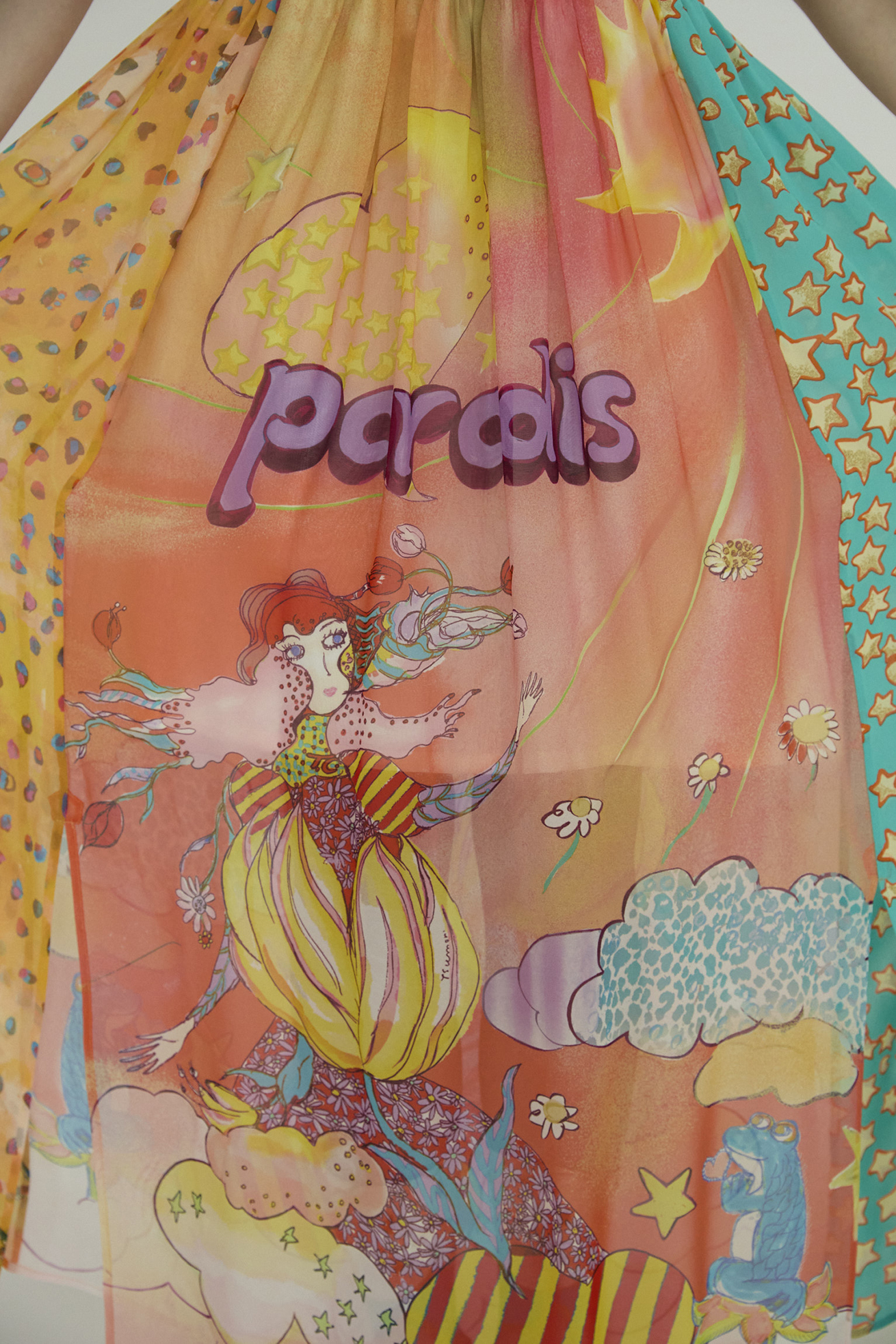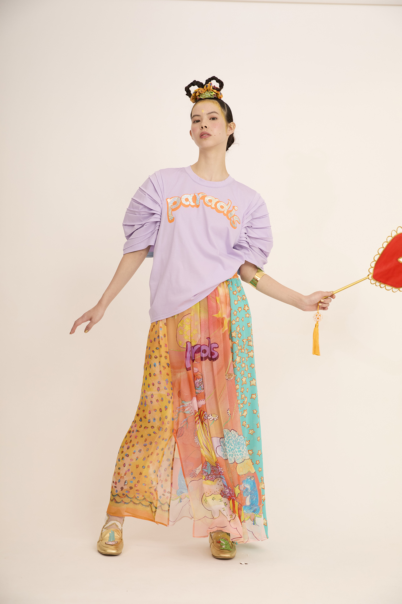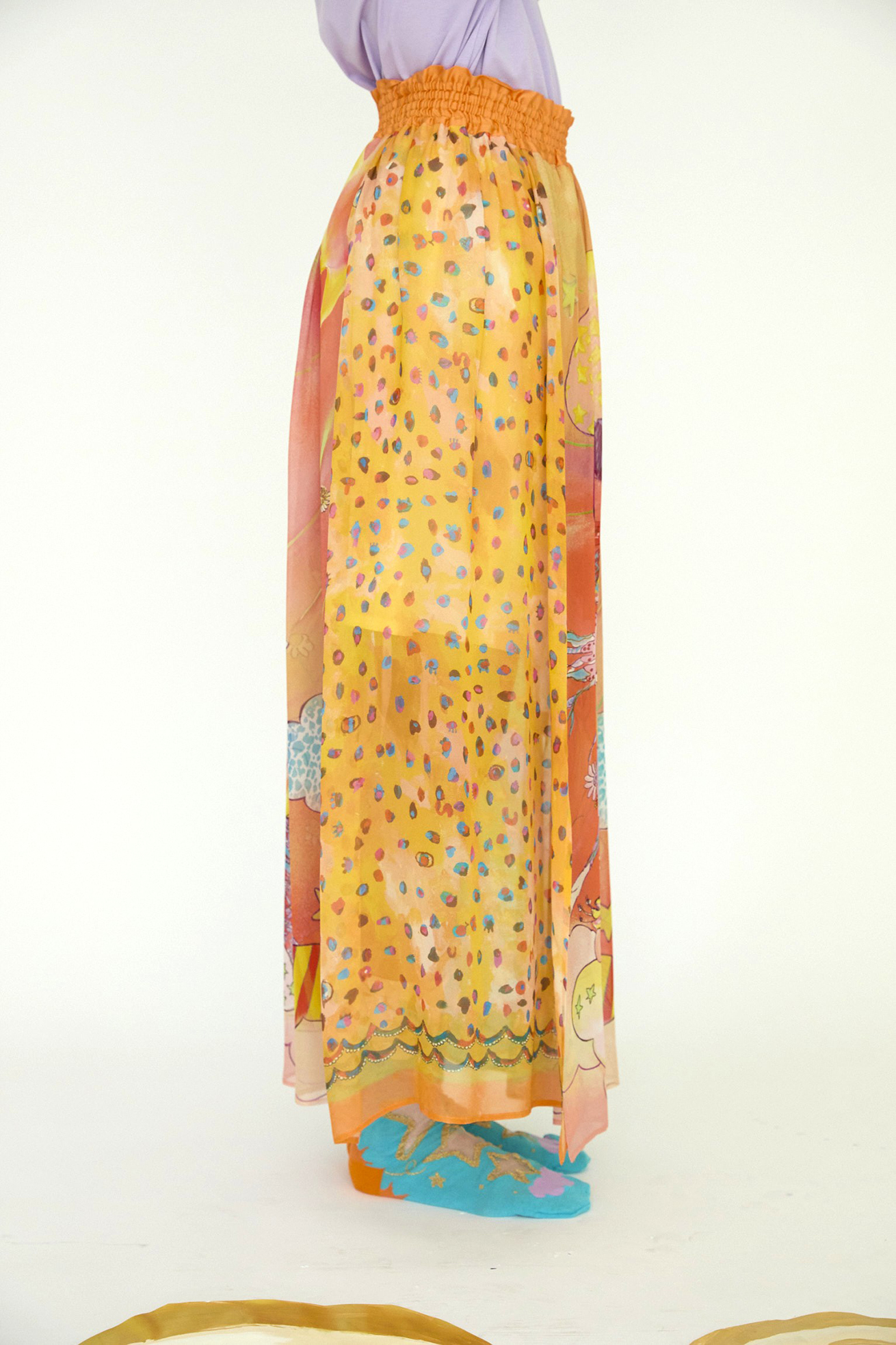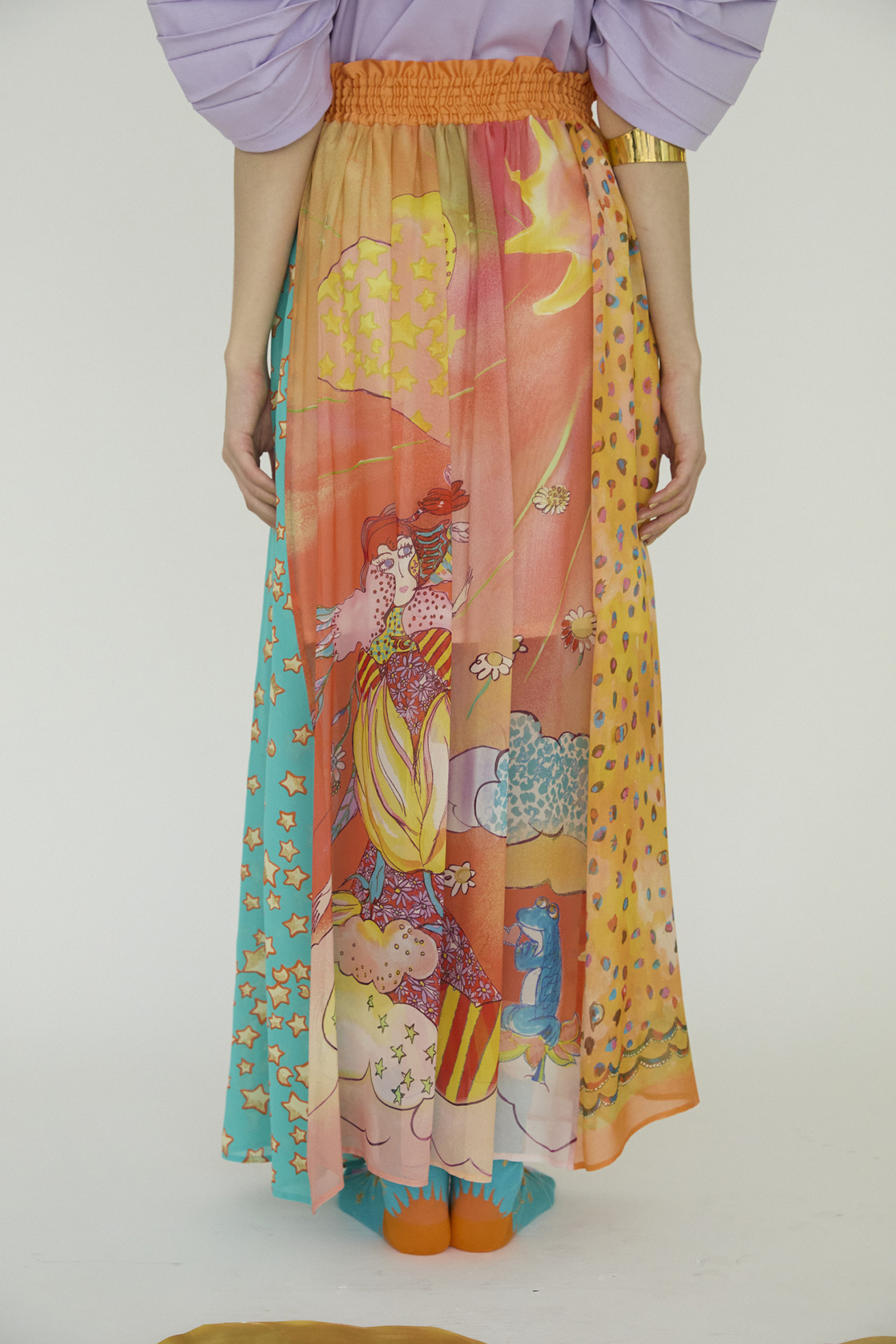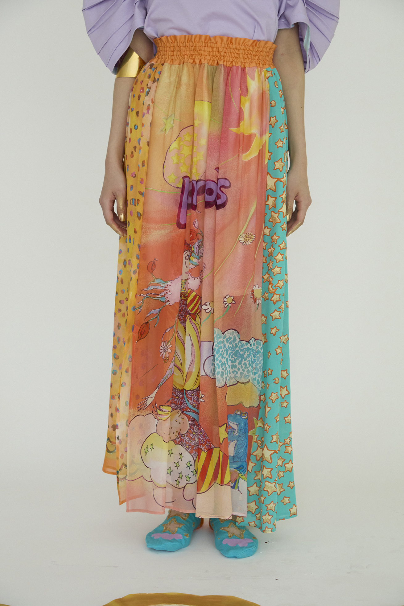 センターには Bloom girl、サイドに Colorful leopard、 Cat starの生地を合わせたロングスカート。 ウエスト部分はゴム仕様で履きやすく、プリントの切り替え部分に2か所スリットが入ることで動きのあるシルエットがキレイなアイテムです。裏地が付いています。 〈Bloom girl〉 花を咲かせるパワーを持ったBloom girl。たくさんの花がふわふわと舞って空に浮かんでいく。蓮の花の上のカエル、Paradisの文字。優しく光る太陽。空に浮かぶ雲と一緒にふわふわと浮かんでいるような花の楽園をイメージして、繊細なカラーをインクジェットプリントで表現しました。透け感のあるシルクシフォンに中国でプリントしています。 〈Colorful leopard〉 カラフルな色彩で描かれた豹柄プリント。きらりと輝く豹の目や、まつ毛ぱっちりの目、あしあと型やハート型…よく見ると発見のあるTSUMORI CHISATOらしいカラフルレオパードです。厚く塗り重ねた絵の具のタッチ、スカラップ模様とアク セントカラーがチャームポイント。透け感があり、柔らかく肌触りの良いシルクシフォンに、中国でインクジェットプ リントしています。 〈Cat star〉 大小たくさんの星たちの中に、よく見るとネコ型の星がキラキラ。集まったり散らばったりしながらキラキラ輝く星たちをグリッターと染料のハンドプリントで表現しました。ハンドプリントならではのプリント表現、グリッタープリントが特別感のあるかわいいテキスタイルです。透け感のあるコットンシルクローンにプリントしています。横浜でプリント加工をしています。 ※着用モデル身長:170cm ※着用サイズ: 2(M) ※当サイトの商品は実店舗と在庫を共有しており、ご注文完了後に商品を確保できない場合がございます。 その際、改めてキャンセルまたは数量変更のメールをお送りいたします。何卒ご了承いただけますと幸いです。