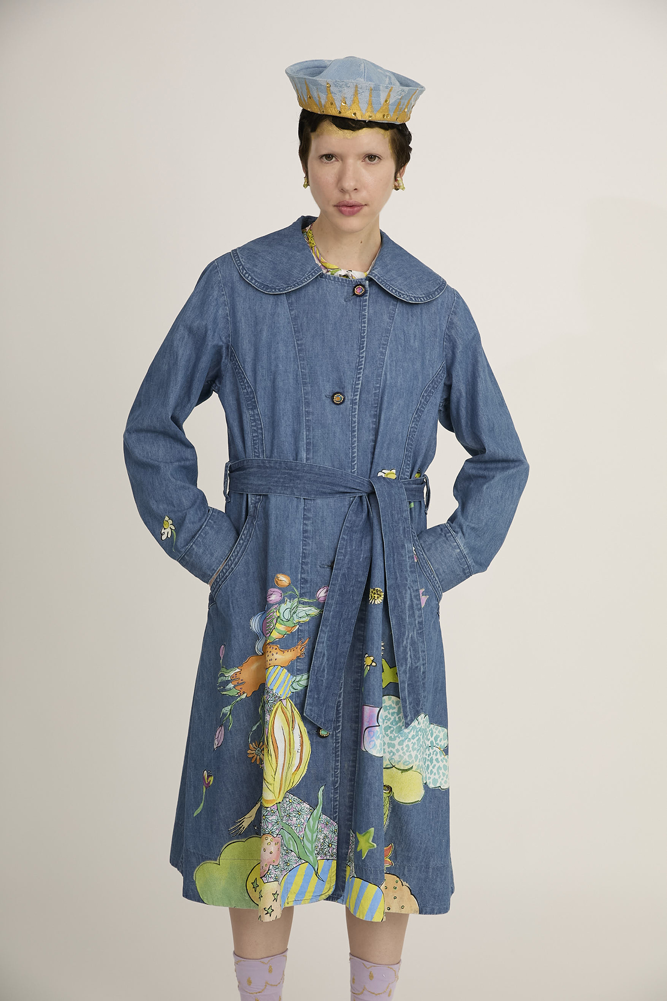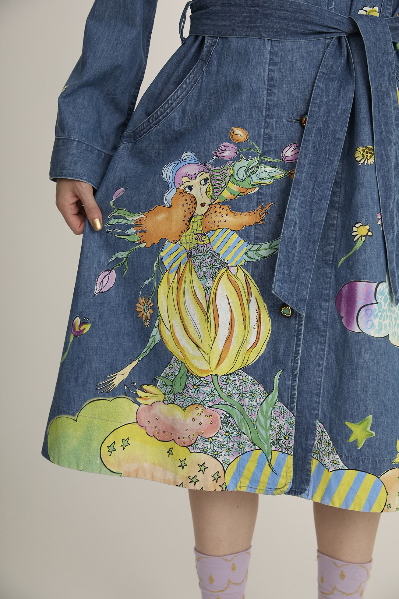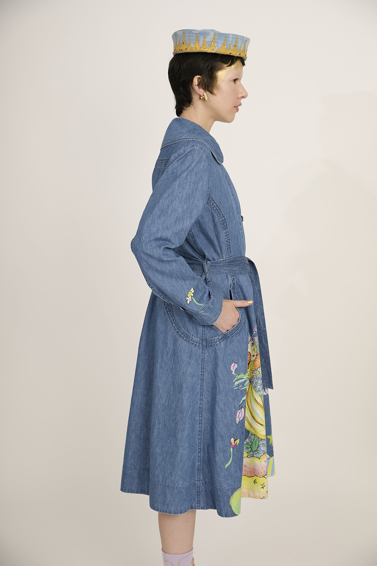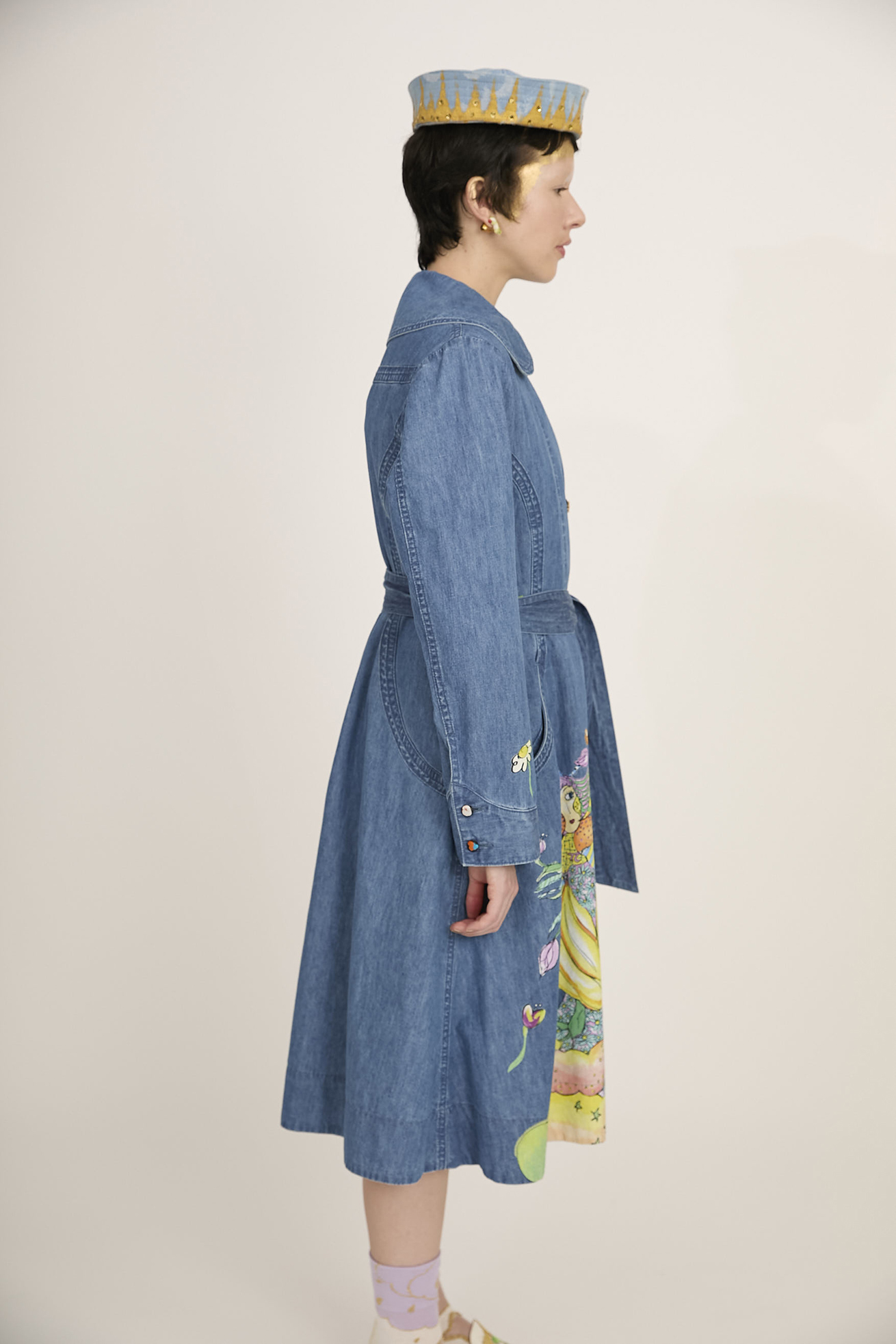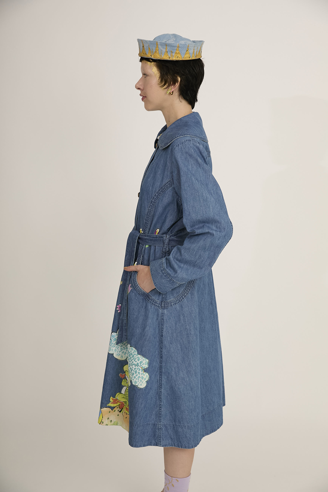 大きな襟とAラインのシルエットが綺麗なデニムワンピースです。colorful leopardのくるみボタンにビーズ刺繍をプラスしたフロントのボタンもアクセントになっています。 サッシュベルト付で、ワンピースとしても薄手のコートとしてもおすすめです。 こちらの商品は手洗い可能です。 〈Bloom girl〉 花を咲かせるパワーを持ったBloom girl。たくさんの花がふわふわと舞って空に浮かんでいく。蓮の花の上のカエル、Paradisの文字。優しく光る太陽。 空に浮かぶ雲と一緒にふわふわと浮かんでいるような花の楽園をイメージして繊細なカラーをインクジェットプリントで表現しました。5.6ozのライトデニムに製品でストーンバイオ加工後にインクジェットプリントをしています。岡山県児島で 作っています 。 ※着用モデル身長:173cm ※着用サイズ: 2(M) ※当サイトの商品は実店舗と在庫を共有しており、ご注文完了後に商品を確保できない場合がございます。 その際、改めてキャンセルまたは数量変更のメールをお送りいたします。何卒ご了承いただけますと幸いです。