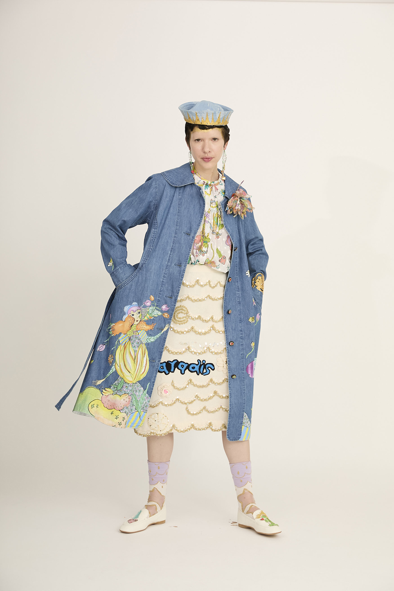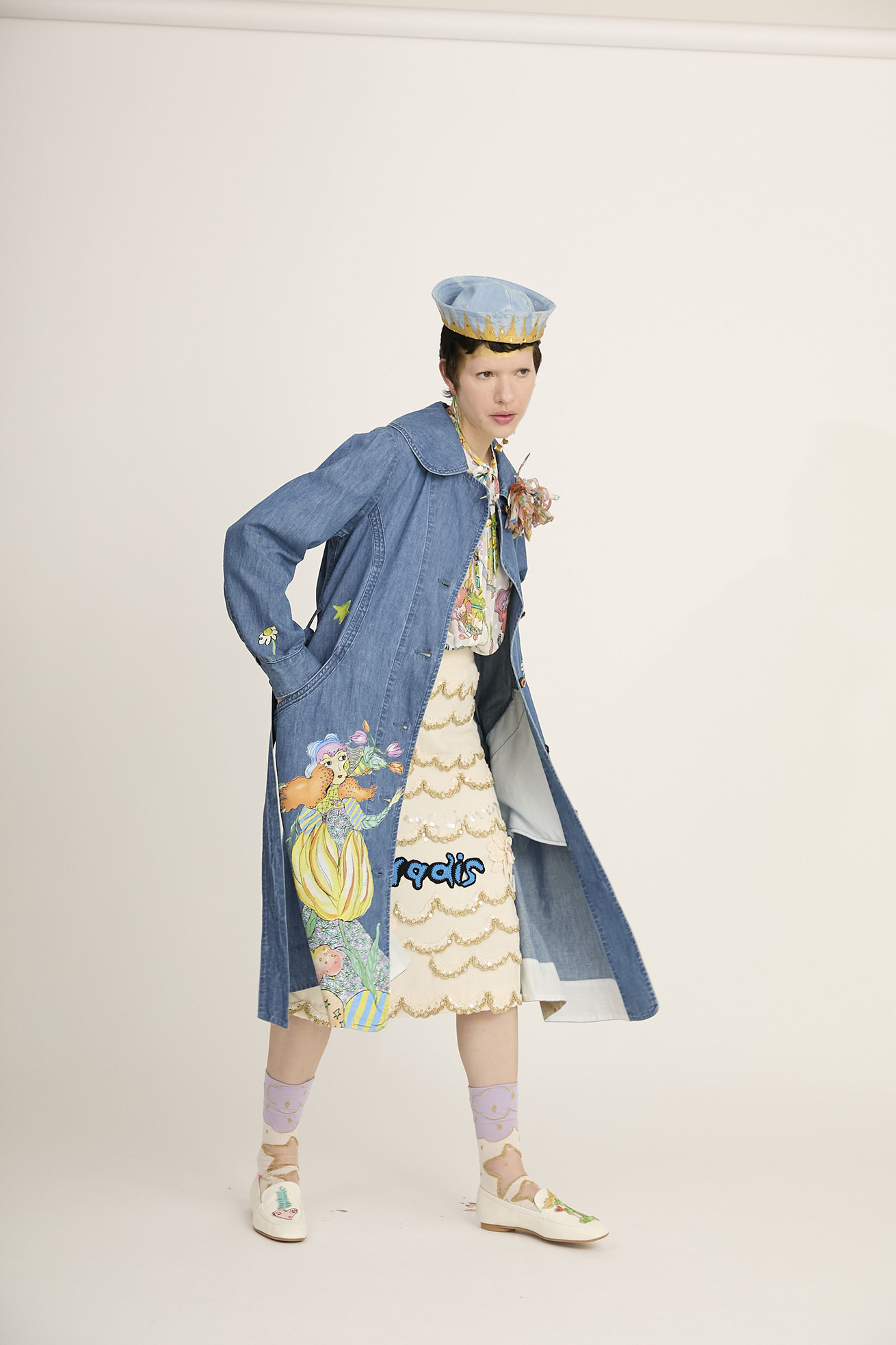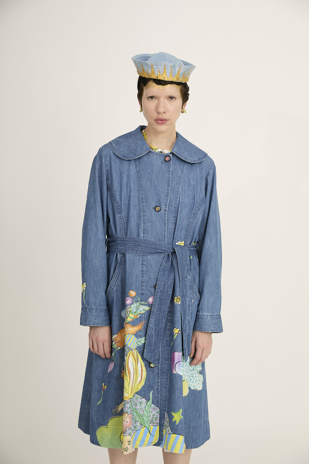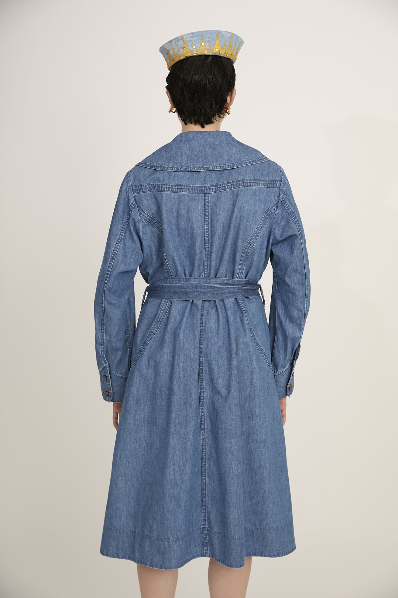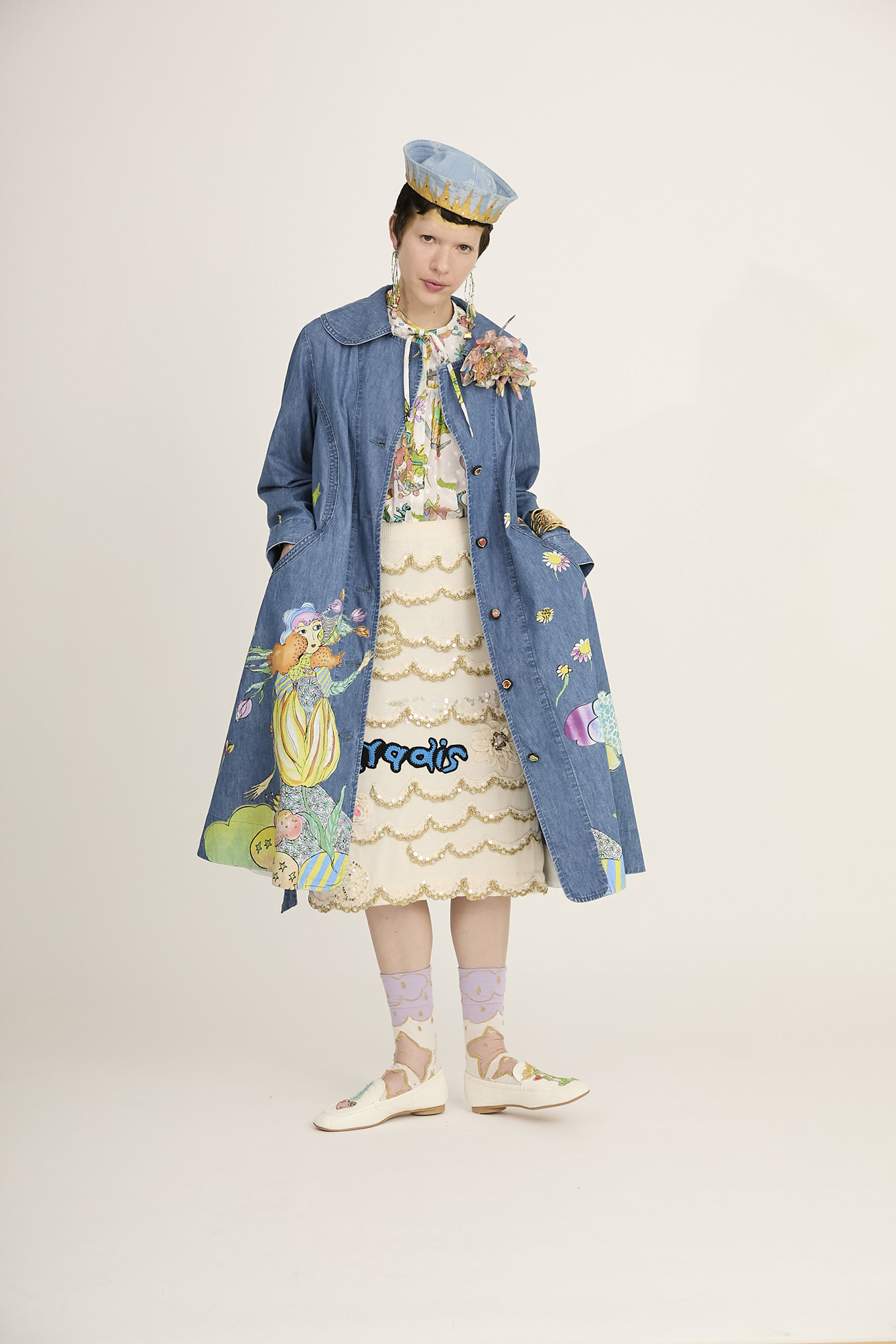 大きな襟とAラインのシルエットが綺麗なデニムワンピースです。colorful leopardのくるみボタンにビーズ刺繍をプラスしたフロントのボタンもアクセントになっています。 サッシュベルト付で、ワンピースとしても薄手のコートとしてもおすすめです。 こちらの商品は手洗い可能です。 〈Bloom girl〉 花を咲かせるパワーを持ったBloom girl。たくさんの花がふわふわと舞って空に浮かんでいく。蓮の花の上のカエル、Paradisの文字。優しく光る太陽。 空に浮かぶ雲と一緒にふわふわと浮かんでいるような花の楽園をイメージして繊細なカラーをインクジェットプリントで表現しました。5.6ozのライトデニムに製品でストーンバイオ加工後にインクジェットプリントをしています。岡山県児島で 作っています 。 ※着用モデル身長:173cm ※着用サイズ: 2(M) ※当サイトの商品は実店舗と在庫を共有しており、ご注文完了後に商品を確保できない場合がございます。 その際、改めてキャンセルまたは数量変更のメールをお送りいたします。何卒ご了承いただけますと幸いです。