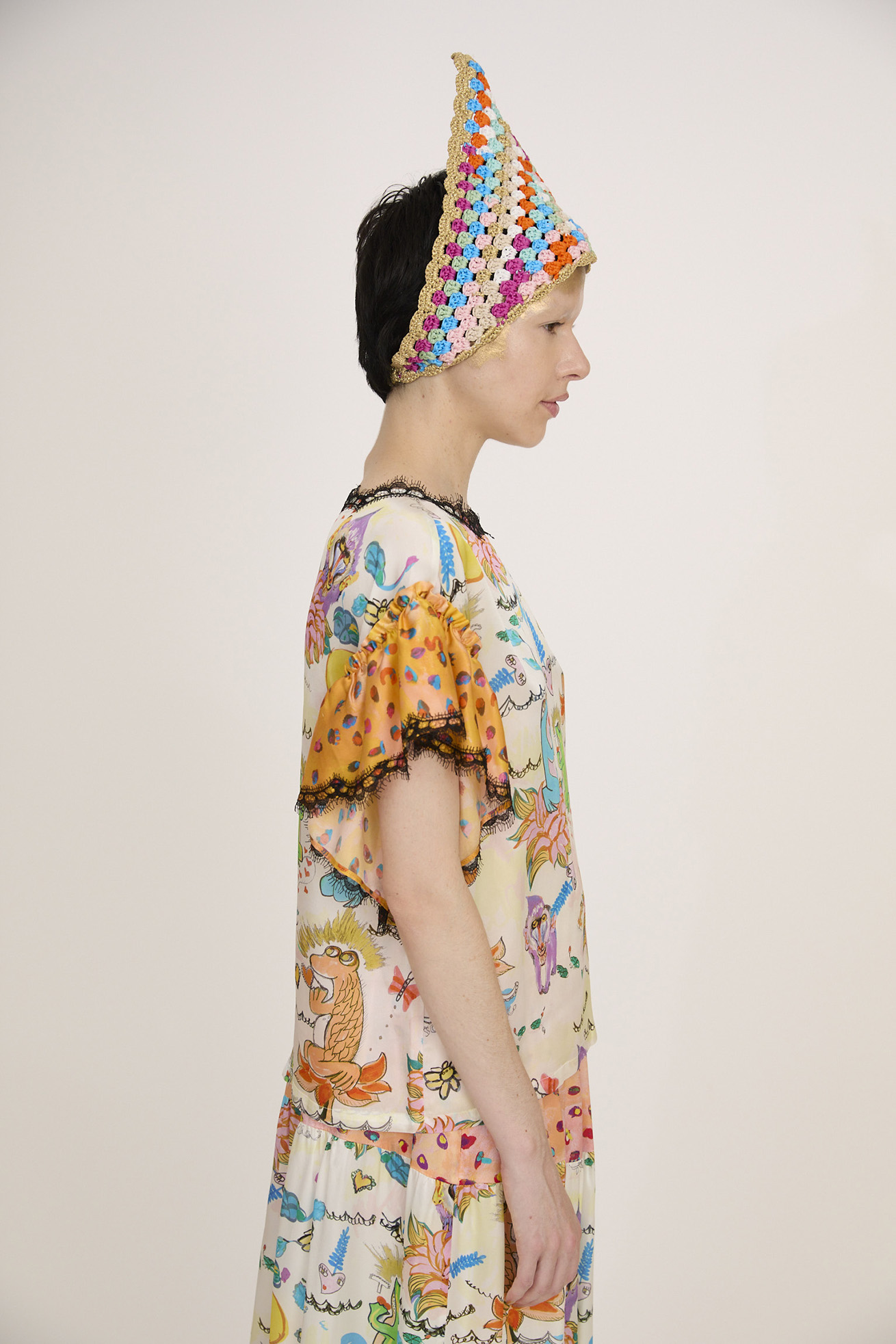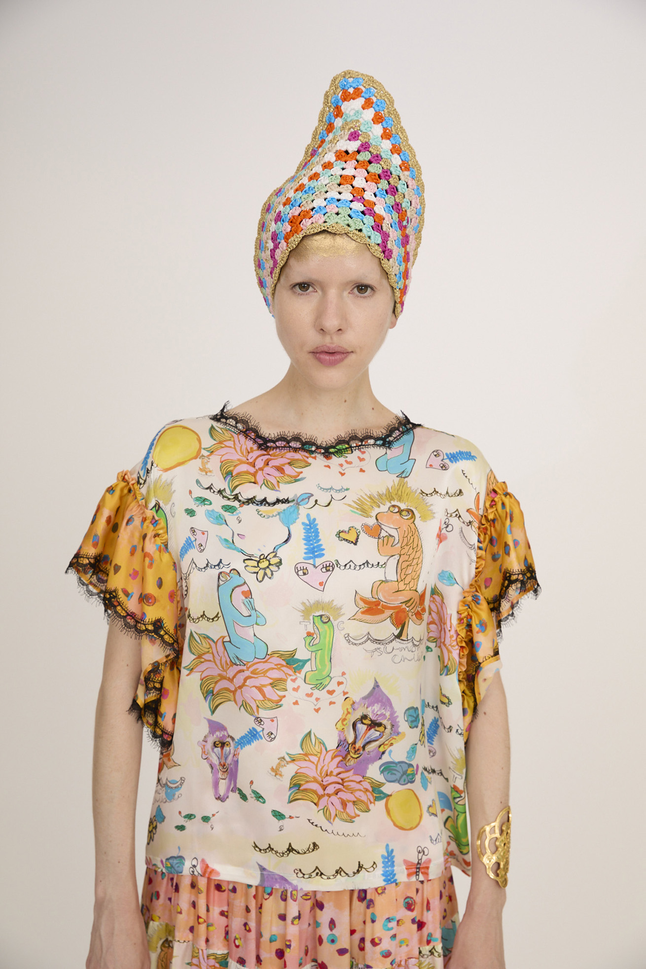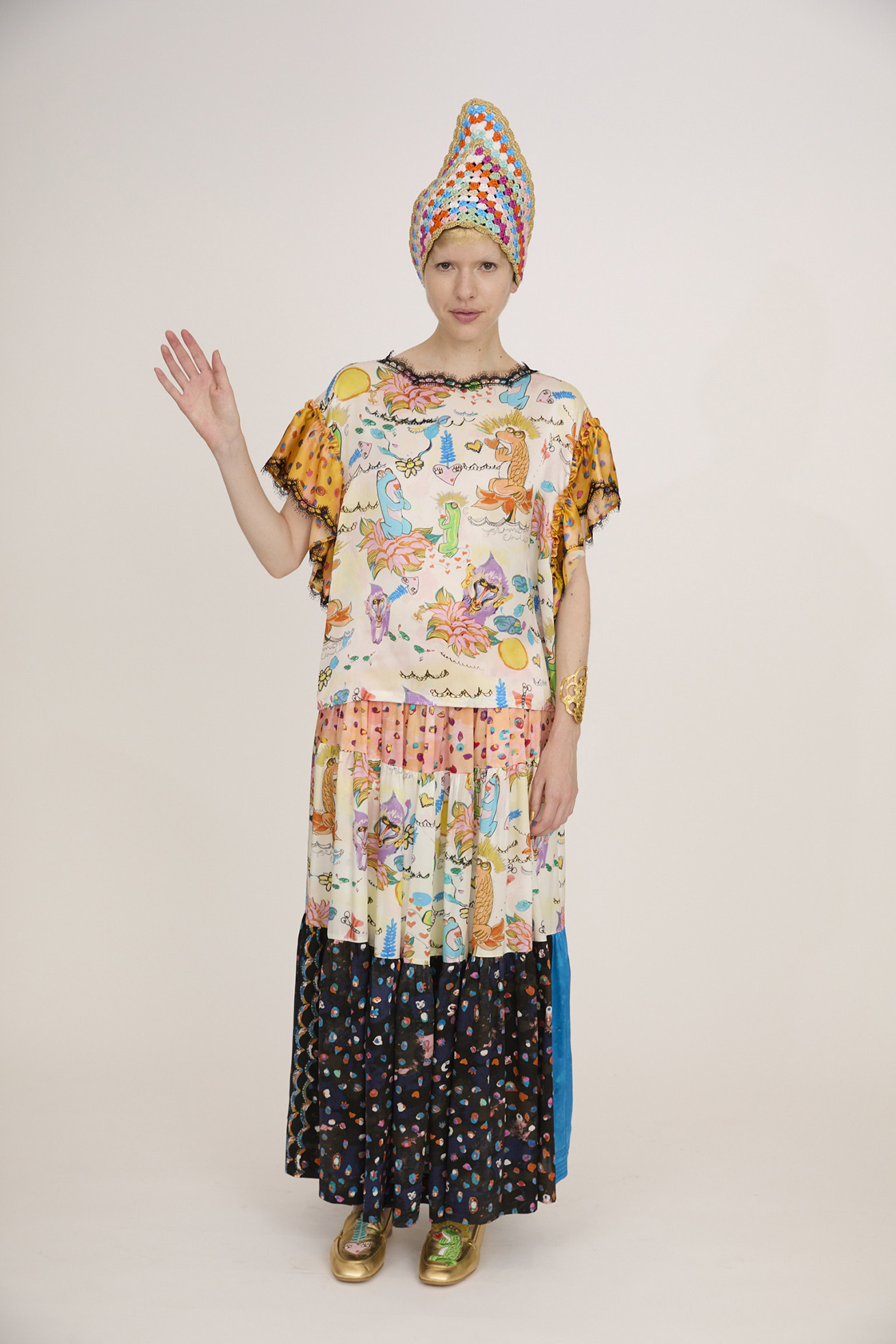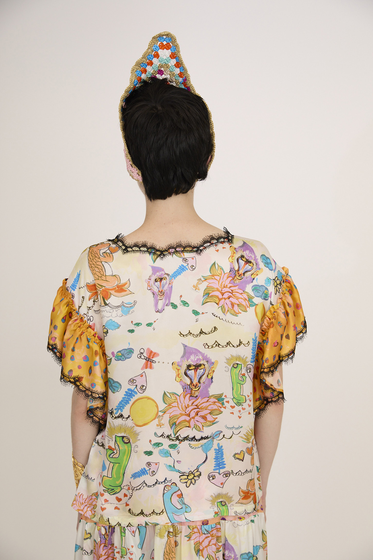 YOMIGAERU printとcolorful leopardをミックスさせたブラウス。 大きなギャザー袖は、シルクならではの落ち感とドレープがキレイに出ています。 襟ぐりのレールテープもアクセントになっています。 〈YOMIGAERU print〉 蓮の花の上に座るカエル、ハートの上に浮かぶカエル、ハスの花から顔を出し ているマンドリル、ハート型の不思議な植物、ちょうちょたち。フリルのような波に浮かぶ、楽しい植物と生き物たち。 願い事をしているような、感謝をしているような、考えごとをしているような...表情豊かなカエルたち。甦るパワーをたくさん持ったヨミガエルたちのプリントです。滑らかで柔らかく、上質な光沢感のあるシルクサテンに中国でインクジェットプリントをしています。 〈colorful leopard〉 カラフルな色彩で描かれた豹柄プリント。きらりと輝く豹の目や、まつ毛ぱっちりの目、あしあと型やハート型…よく見ると発見のあるTSUMORI CHISATOらしいカラフルレオパードです。厚く塗り重ねた絵の具のタッチ、スカラップ模様とアク セントカラーがチャームポイント。滑らかで柔らかく、上質な光沢感のあるシルクサテンに中国でインクジェットプ リントをしています。 ※着用モデル身長:173cm ※着用サイズ: 2(M) ※当サイトの商品は実店舗と在庫を共有しており、ご注文完了後に商品を確保できない場合がございます。 その際、改めてキャンセルまたは数量変更のメールをお送りいたします。何卒ご了承いただけますと幸いです。