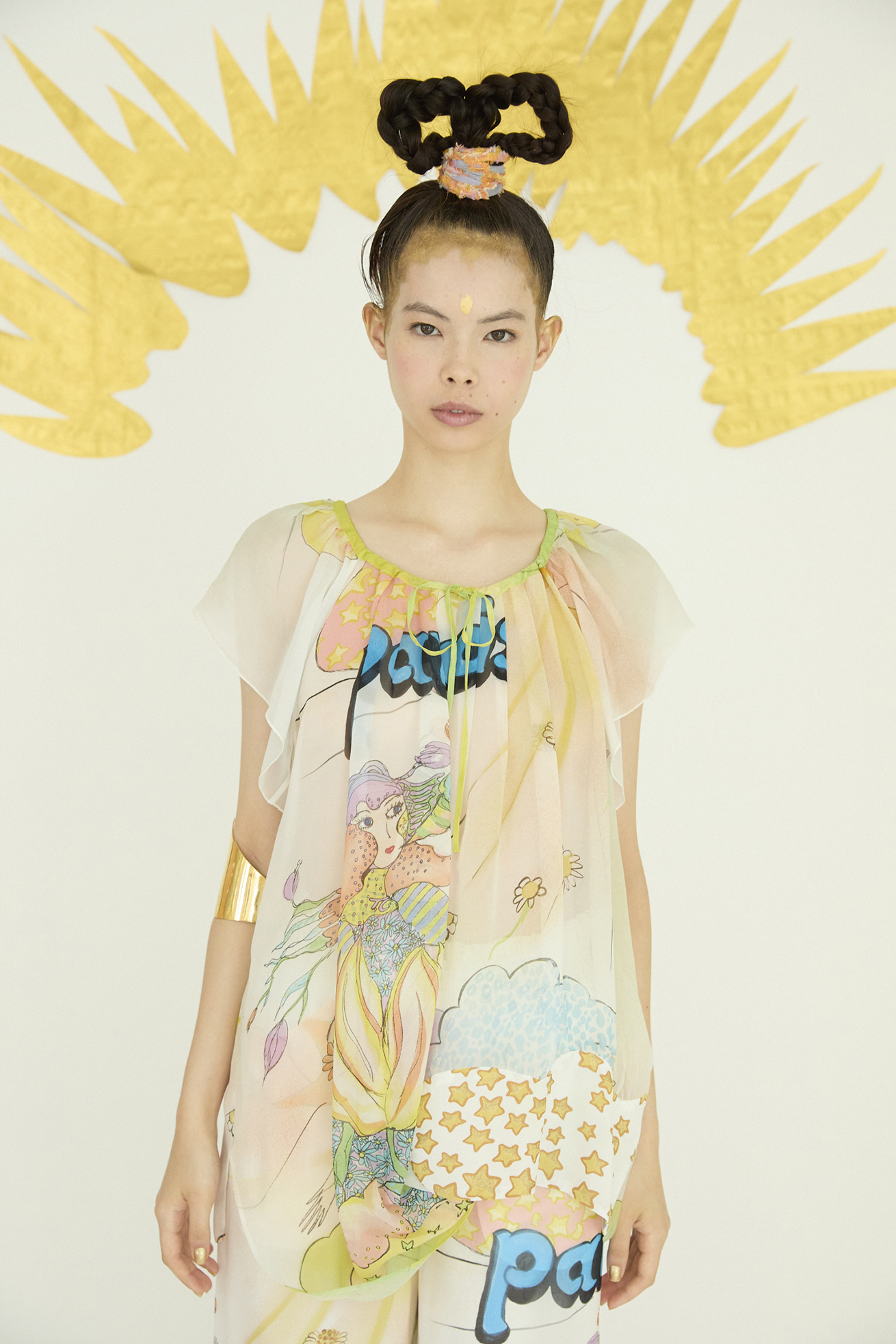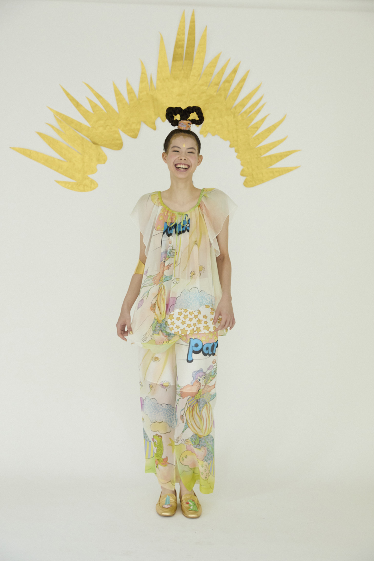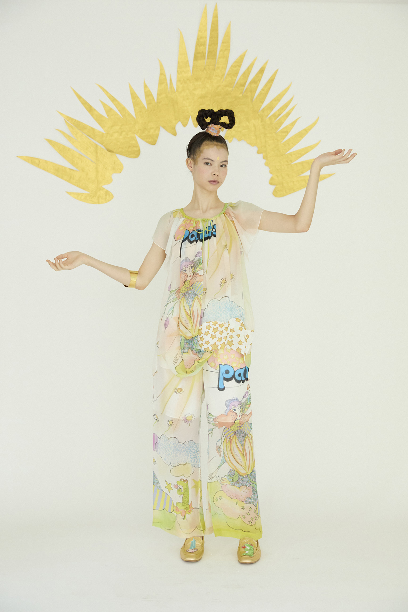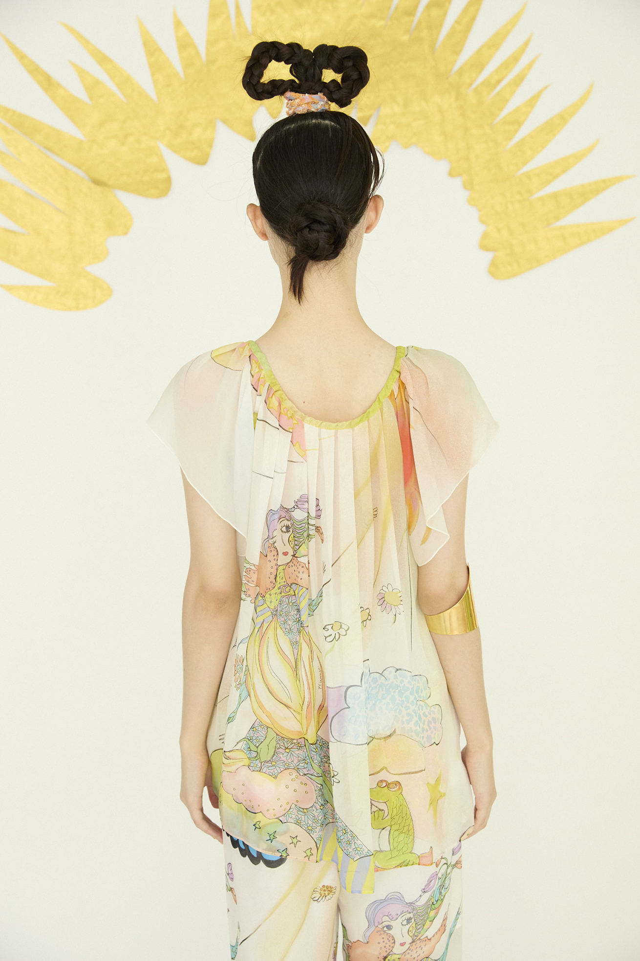 Bloom girl、裾にはくも型にCat star生地を合わせた定番の半袖ブラウス。 シルクシフォンのとろみのある生地の特徴を活かしたドレープが綺麗なアイテムです。 襟ぐりのヒモで首周りの開きを調整できます。 〈Bloom girl〉 花を咲かせるパワーを持ったBloom girl。たくさんの花がふわふわと舞って空に浮かんでいく。蓮の花の上のカエル、Paradisの文字。優しく光る太陽。空に浮かぶ雲と一緒にふわふわと浮かんでいるような花の楽園をイメージして、繊細なカラーをインクジェットプリントで表現しました。透け感のあるシルクシフォンに中国でプリントしています。 〈Cat star〉 大小たくさんの星たちの中に、よく見るとネコ型の星がキラキラ。集まったり散らばったりしながらキラキラ輝く星たちをグリッターと染料のハンドプリントで表現しました。ハンドプリントならではのプリント表現、グリッタープリントが特別感のあるかわいいテキスタイルです。透け感のあるコットンシルクローンにプリントしています。横浜でプリント加工をしています。 ※着用モデル身長:170cm ※着用サイズ: 2(M) ※当サイトの商品は実店舗と在庫を共有しており、ご注文完了後に商品を確保できない場合がございます。 その際、改めてキャンセルまたは数量変更のメールをお送りいたします。何卒ご了承いただけますと幸いです。