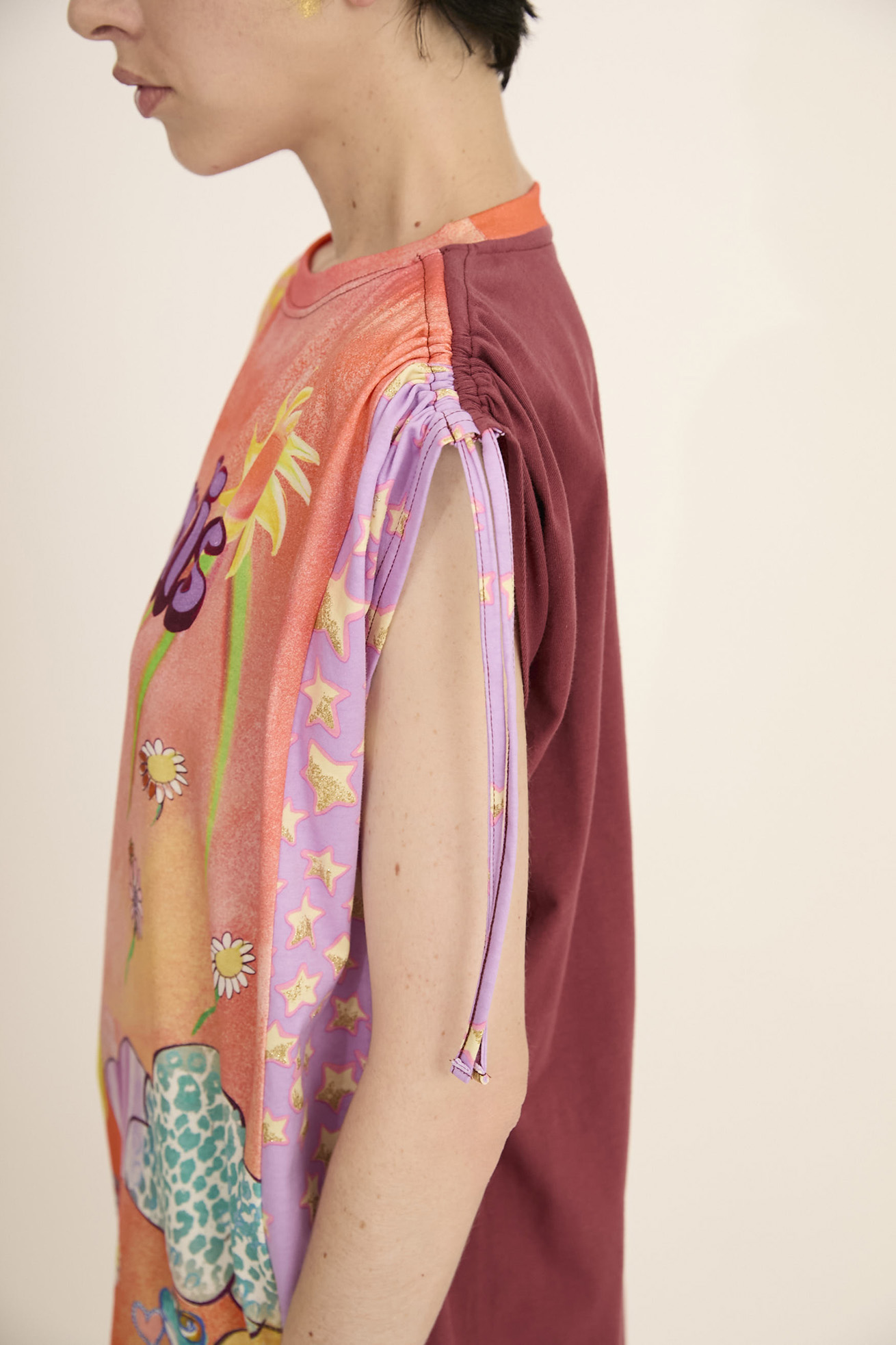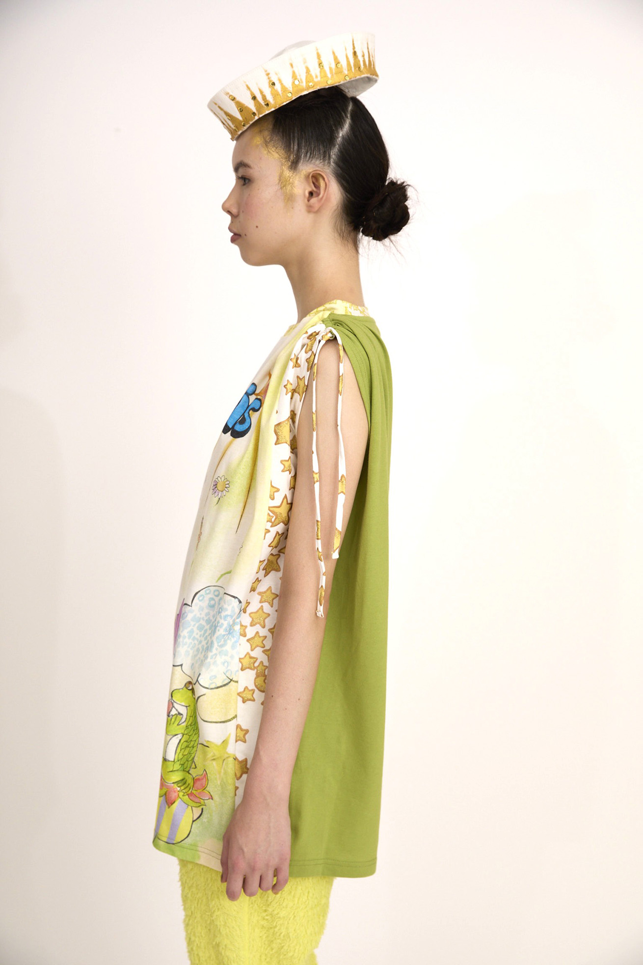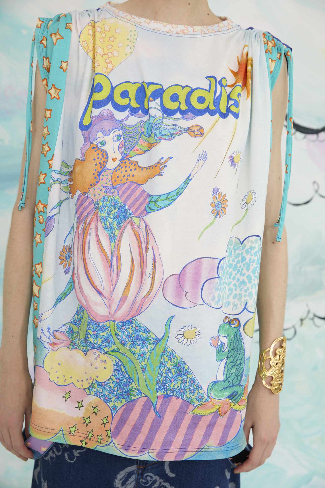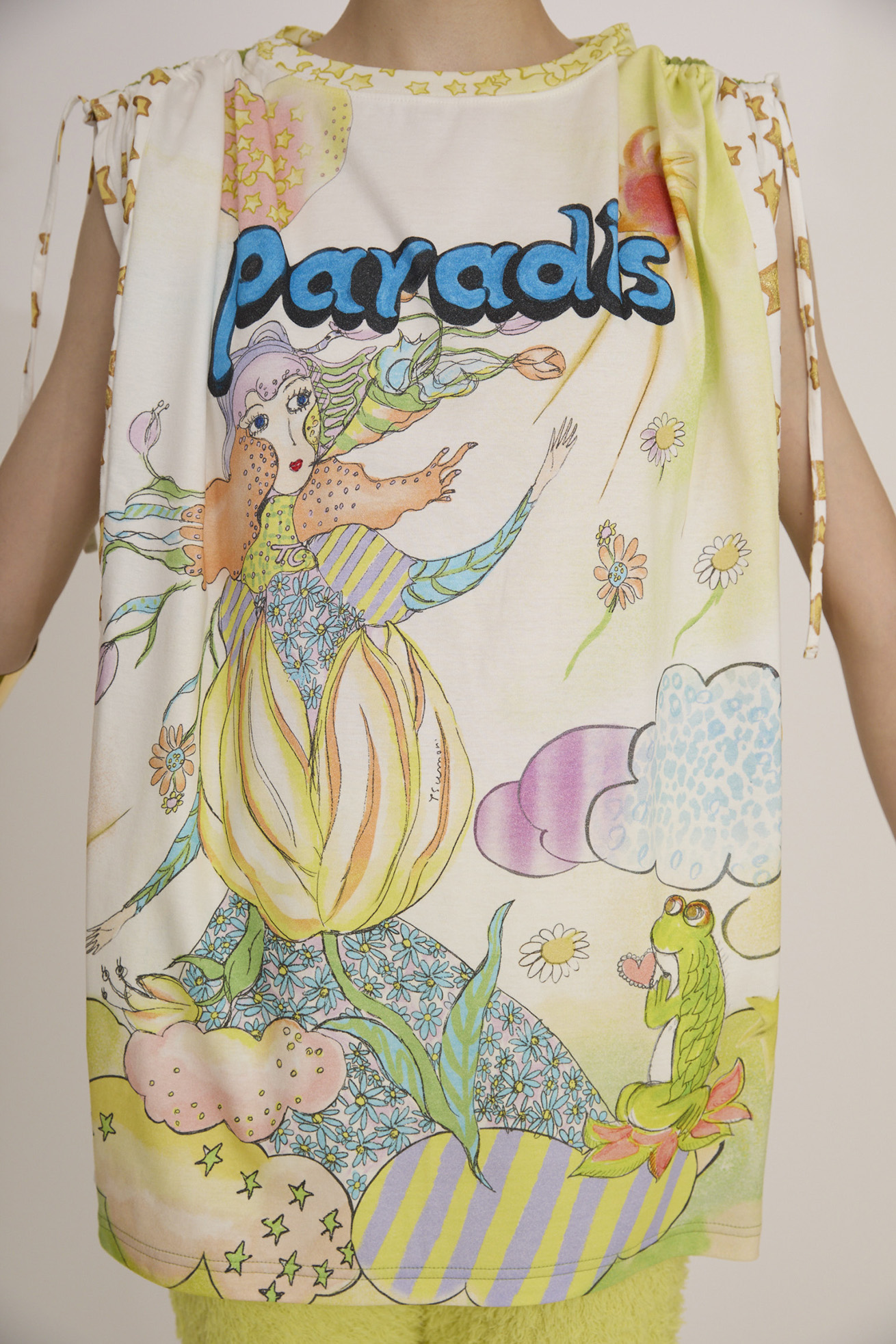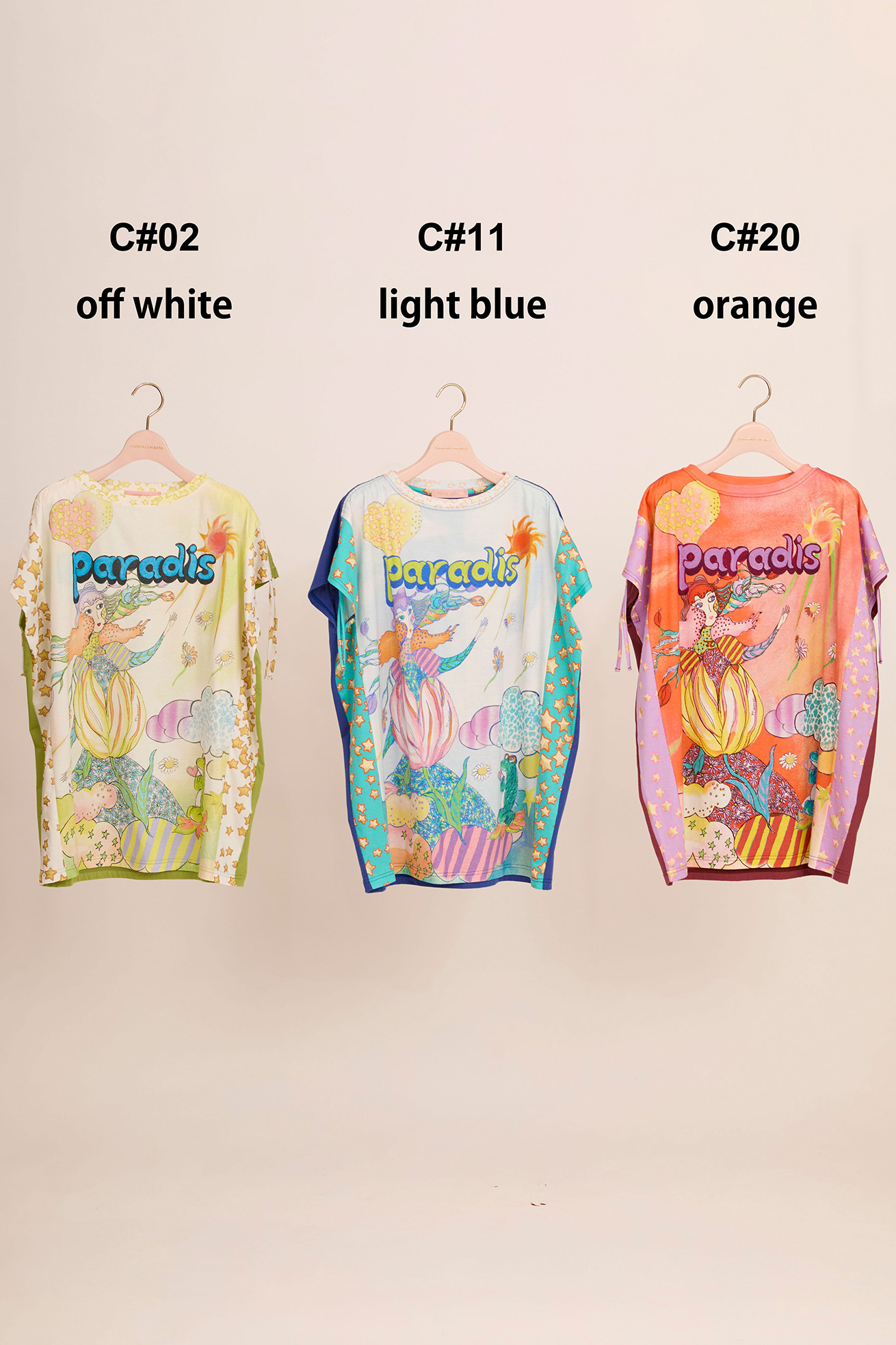 Bloom girl garden printを発色の良い染料インクジェットでプリントしたチュニックワンピース。 サイドの切り替え部分にはcat star jerseyの生地を使用しアクセントに。 袖丈は肩紐で調整ができ、アレンジをお楽しみください。 こちらの商品は手洗い可能です。 〈Bloom girl garden print〉 花を咲かせるパワーを持った、Bloom girl。たくさんの花がふわふわと舞って空 に浮かんでいく。蓮の花の上のカエル、Paradisの文字。優しく光る太陽。 空に浮かぶ雲と一緒にふわふわと浮かんでいるような花の楽園をイメージしています。 〈Cat star〉 大小たくさんの星たちの中に、よく見るとネコ型の星がキラキラ。集まったり散ら ばったりしながらキラキラ輝く星たちを、グリッターと染料のハンドプリントで表現しました。ハンドプリントならではのプリント表現、グリッタープリントが特別感の あるかわいいテキスタイルです。 ※着用モデル身長:off white 170cm light blue/orange 173c ※着用サイズ: 2(M) ※当サイトの商品は実店舗と在庫を共有しており、ご注文完了後に商品を確保できない場合がございます。 その際、改めてキャンセルまたは数量変更のメールをお送りいたします。何卒ご了承いただけますと幸いです。